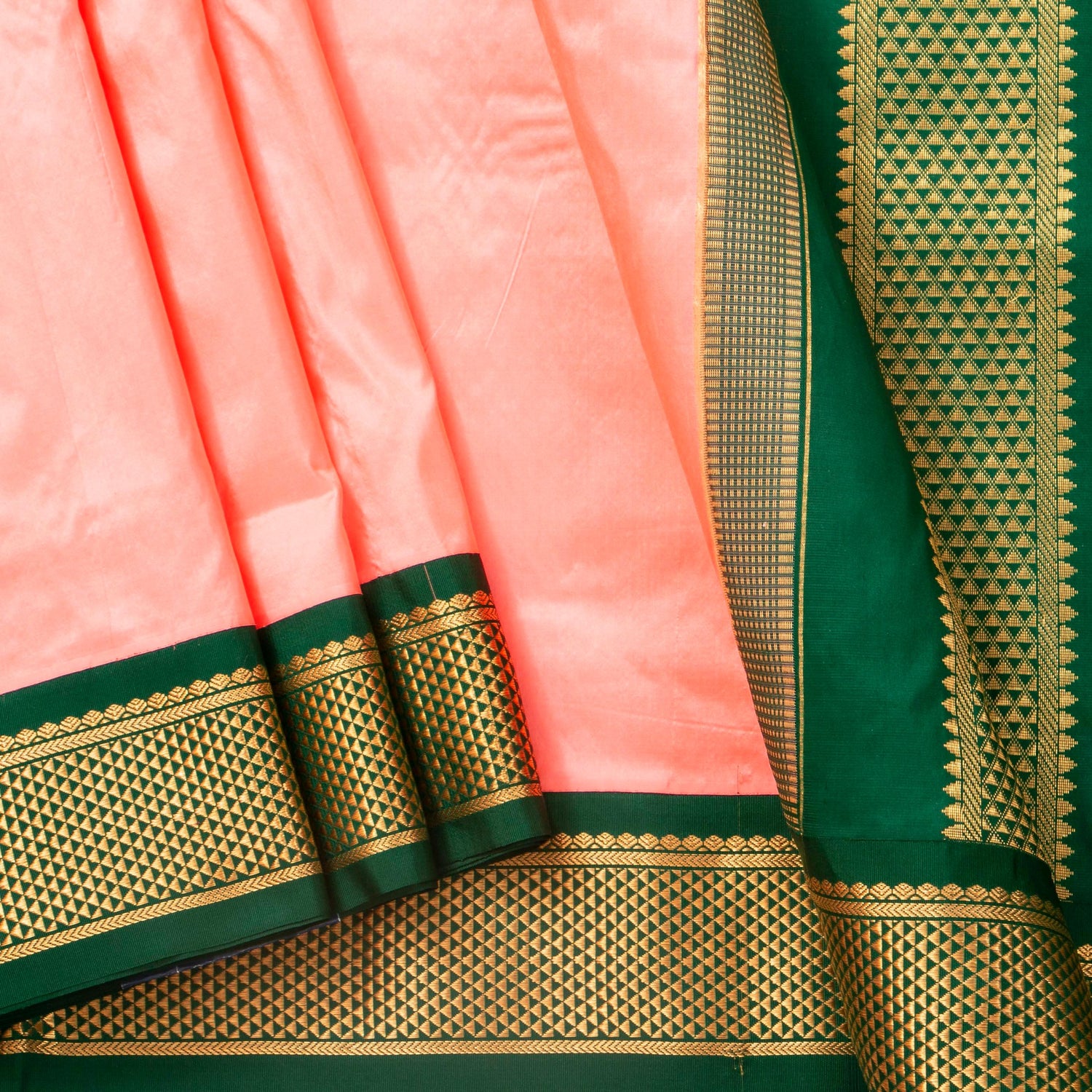 - Look for a strong distinction between the main body of the saree and the borders at both ends. These borders are typically wider and contain contrasting hues or complex zari work.