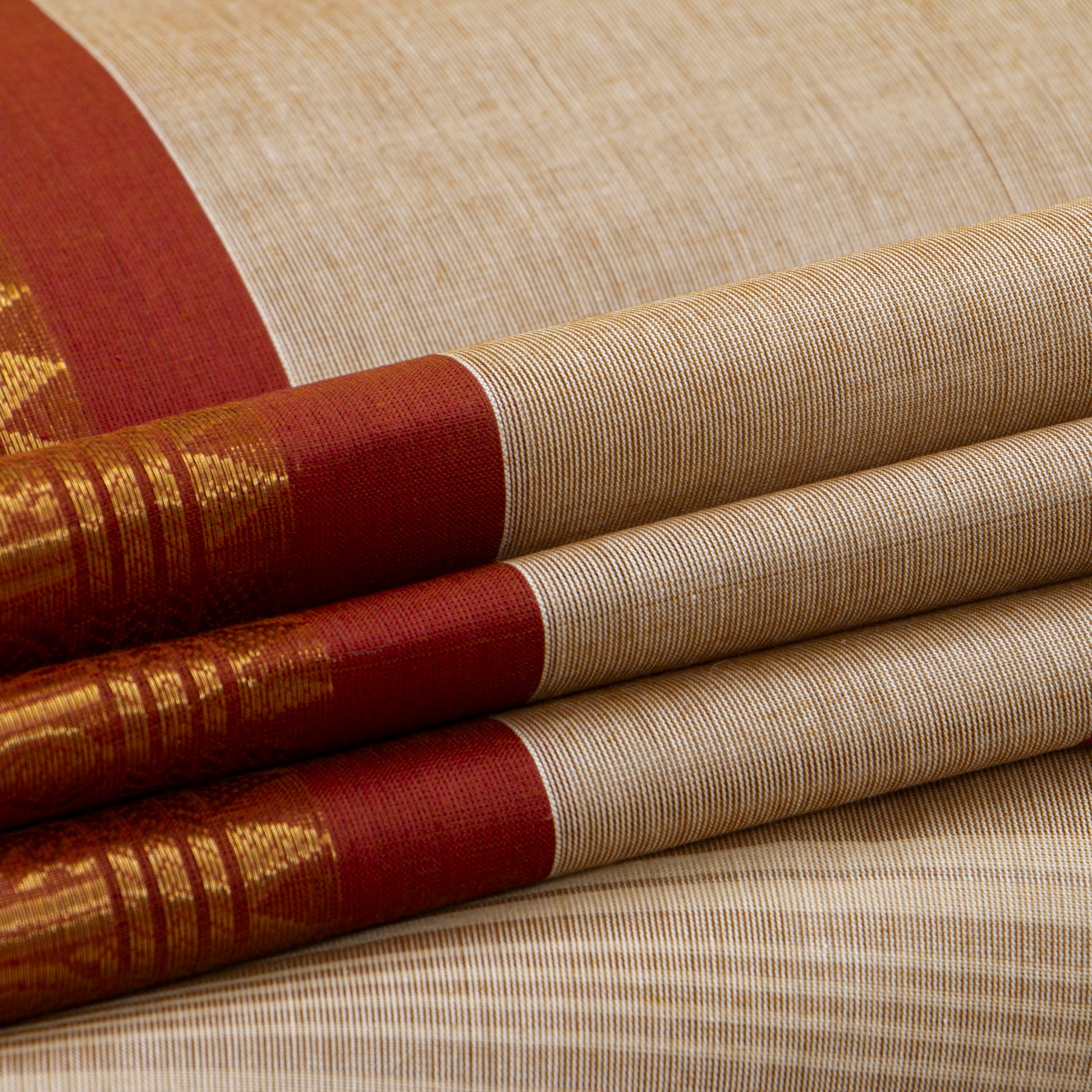 Beige kanchi cotton saree with a rust and green ganga jamuna border and gold zari work with attached blouse