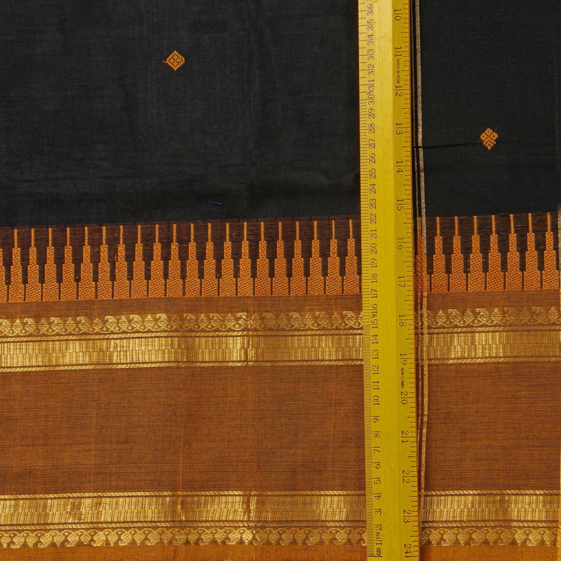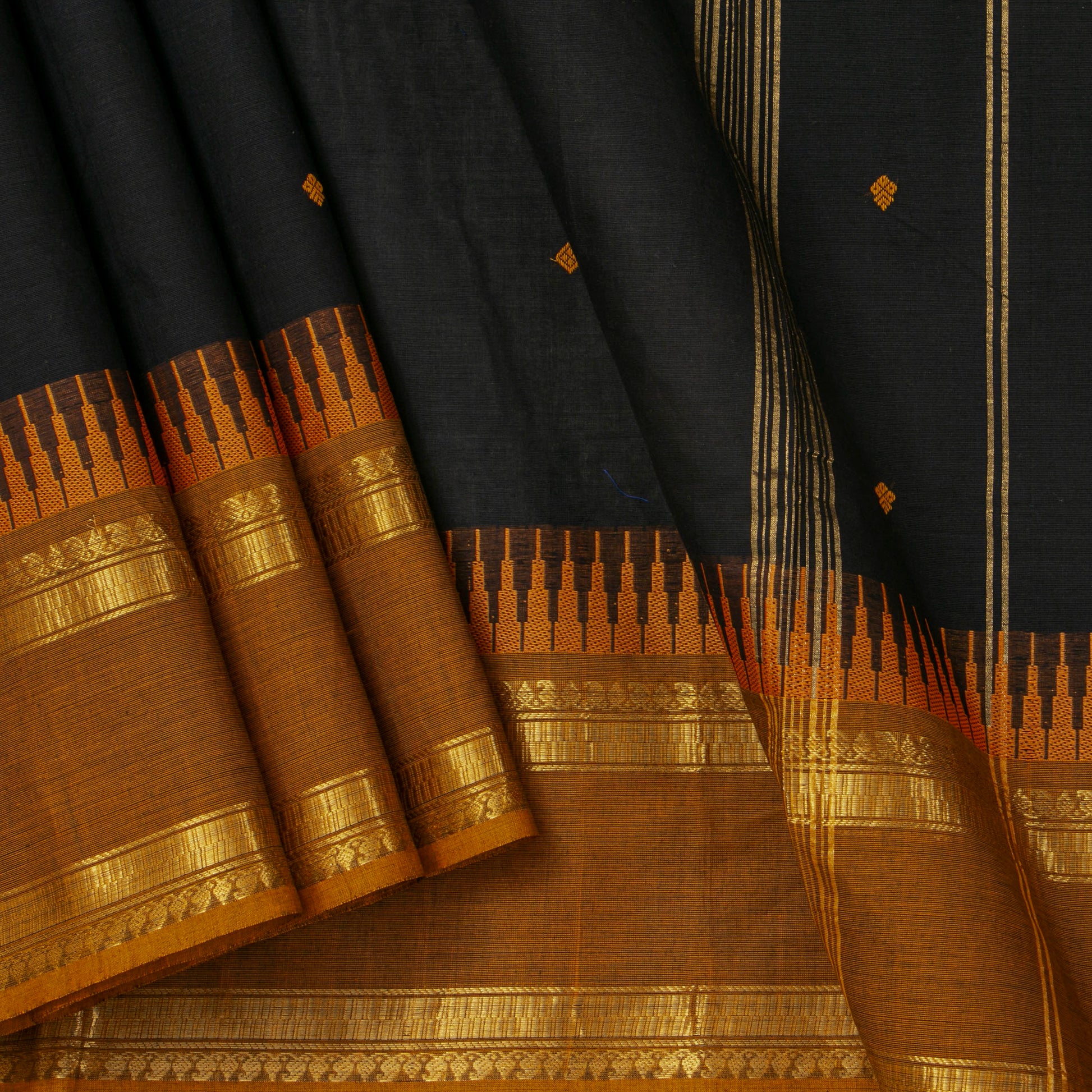 Black kanchi cotton saree with mustard border on both sides with rich gold zari work and an attached blouse.