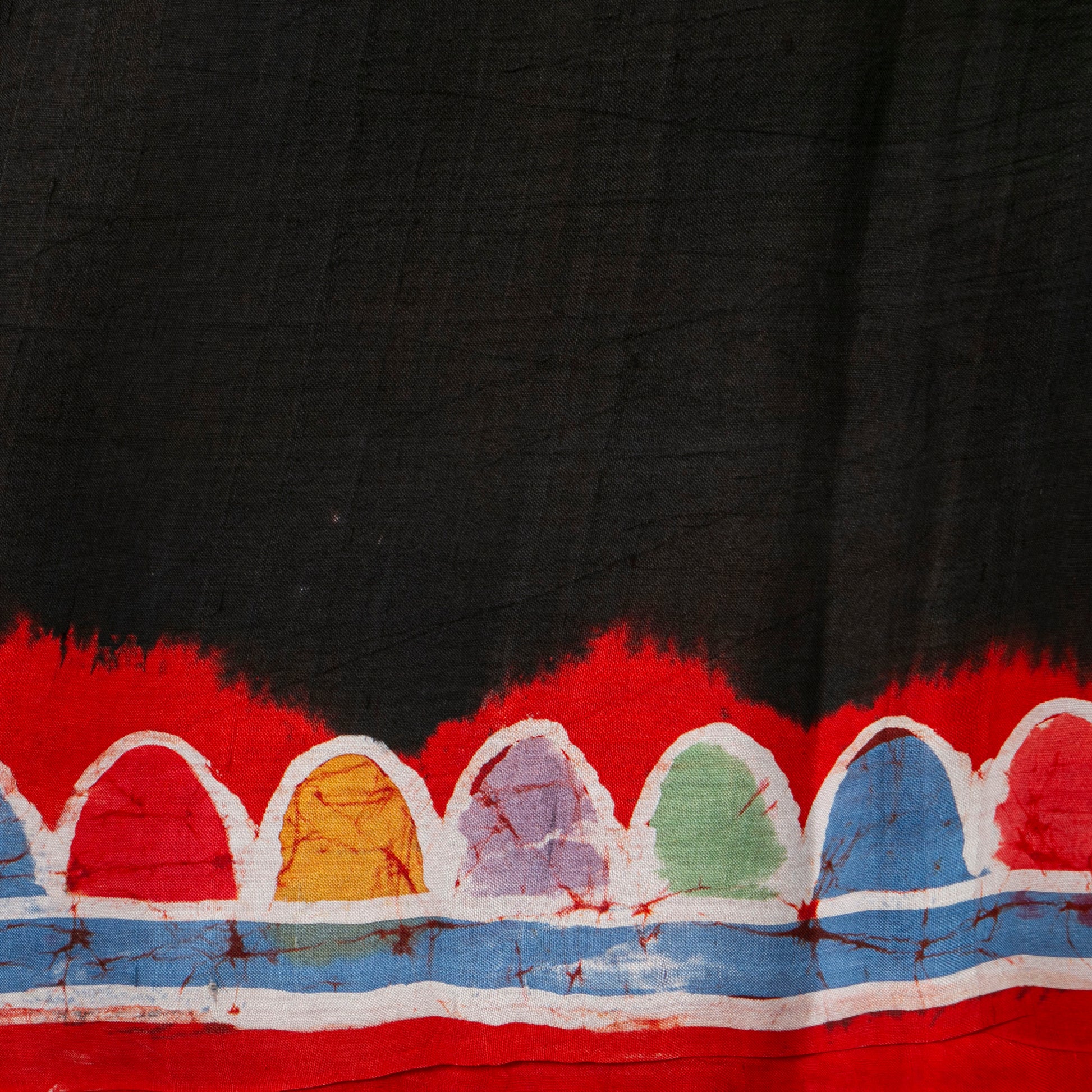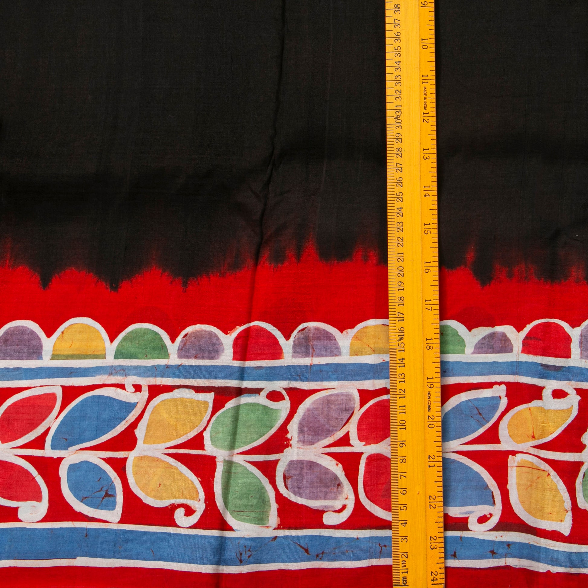 Black batik sillk saree with a red border having multicolour floral designs and a red pallu with attached blouse.