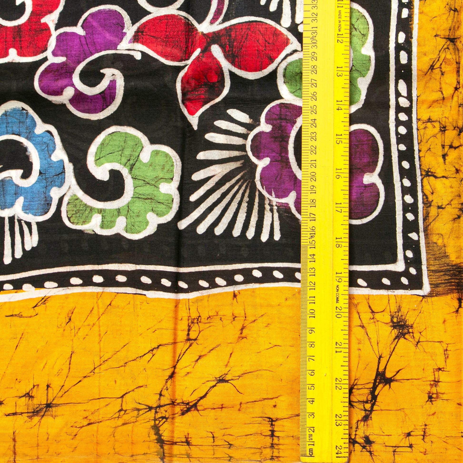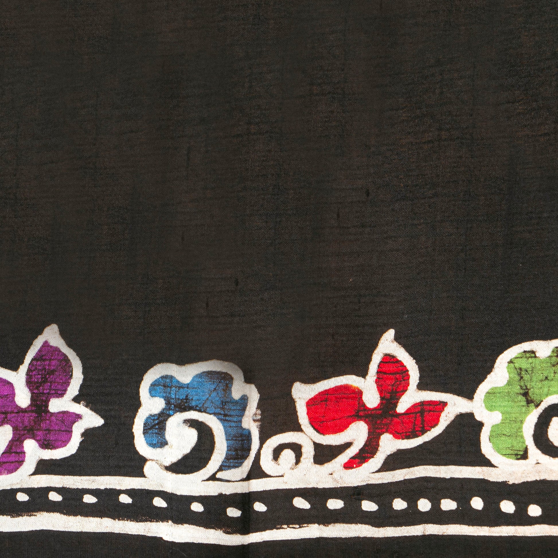 Black lightweight batik silk saree with floral designs in multiple colours and a yellow ochre border and pallu with attached blouse.