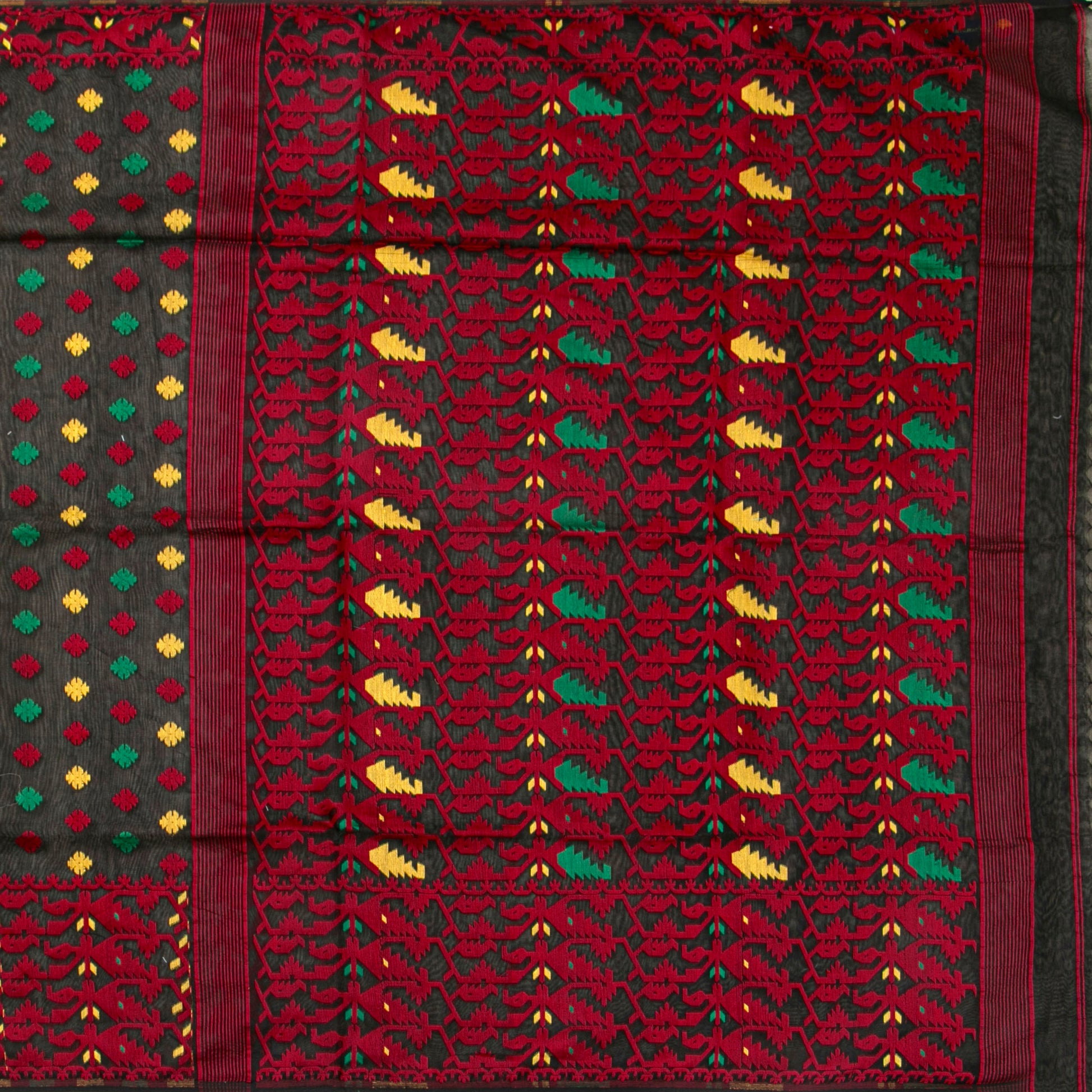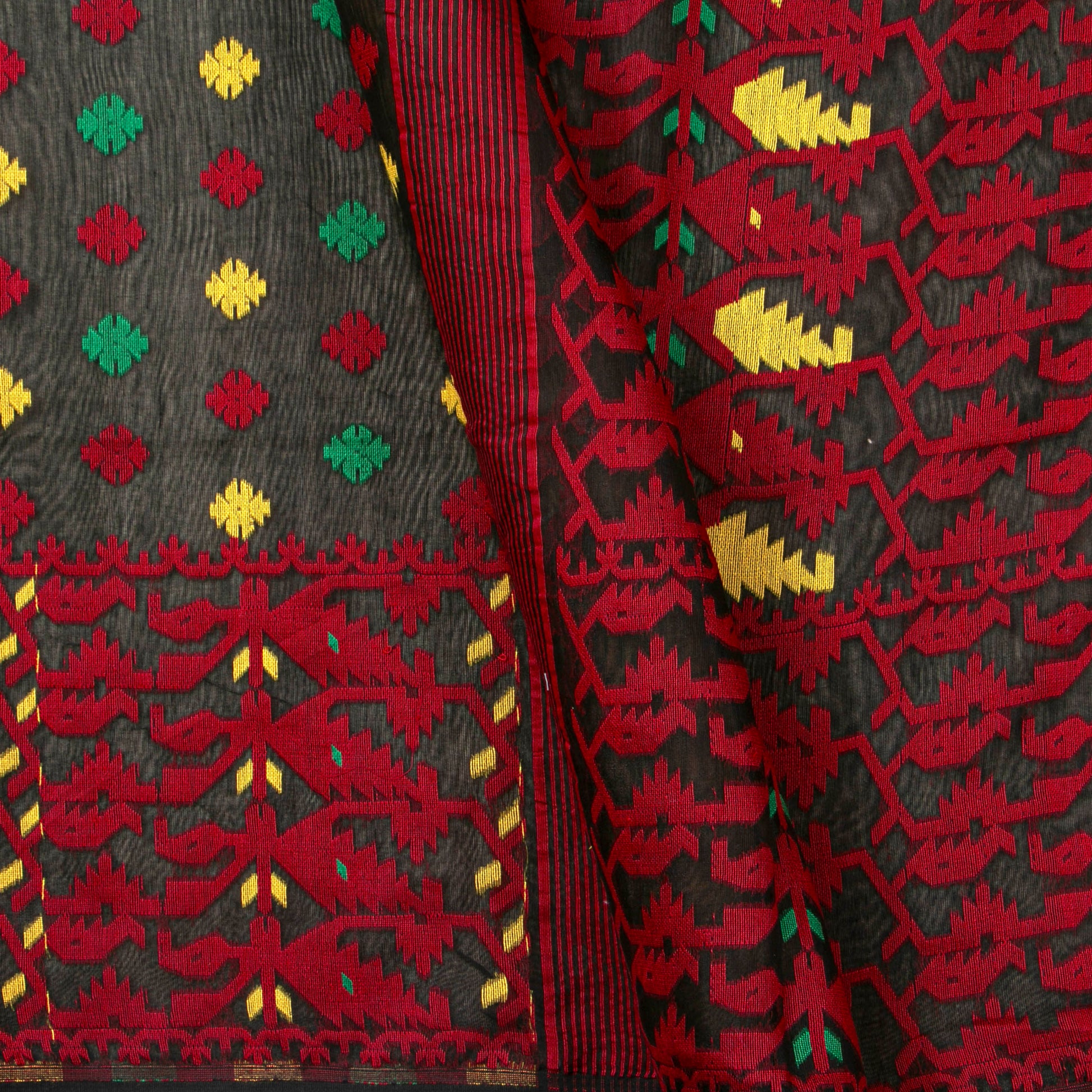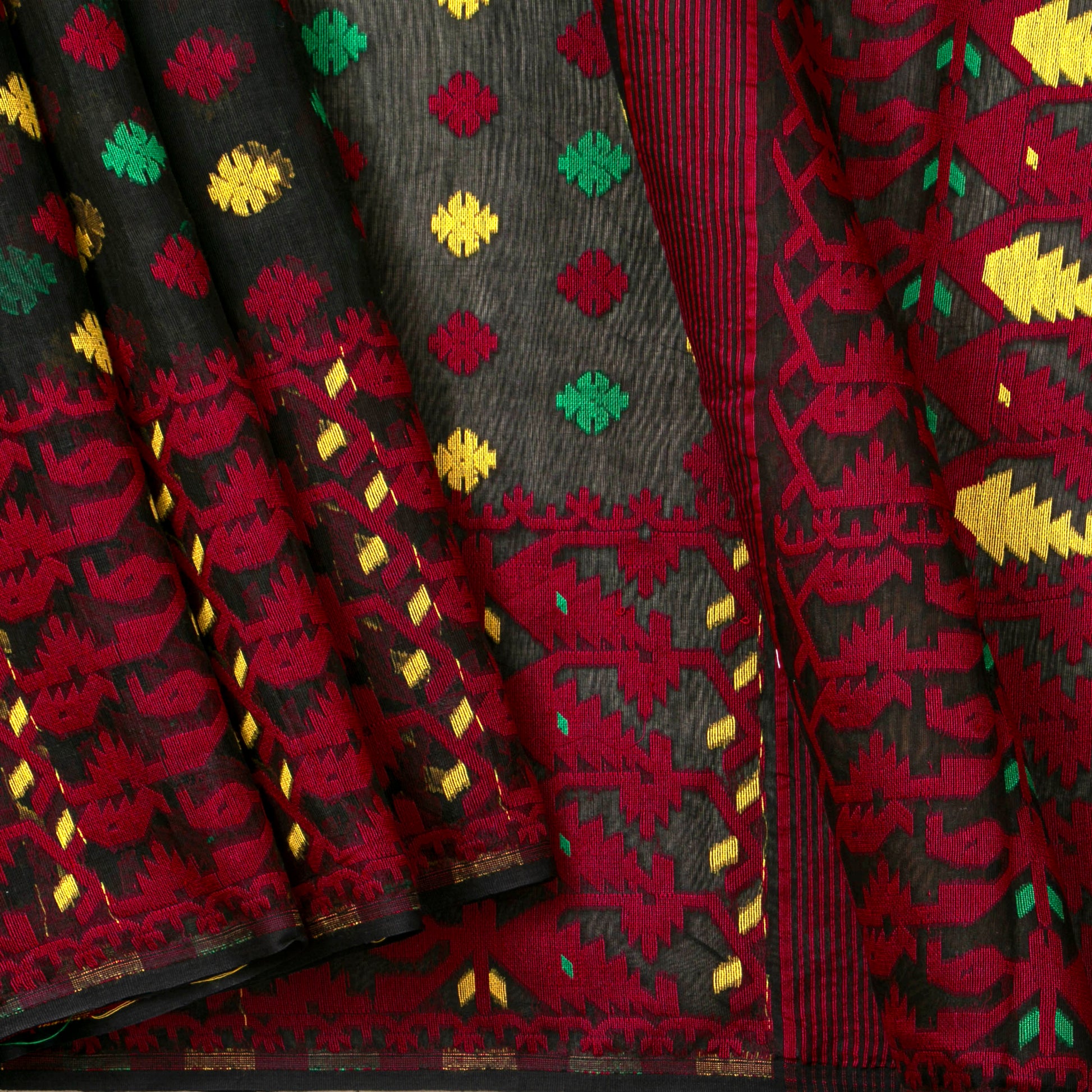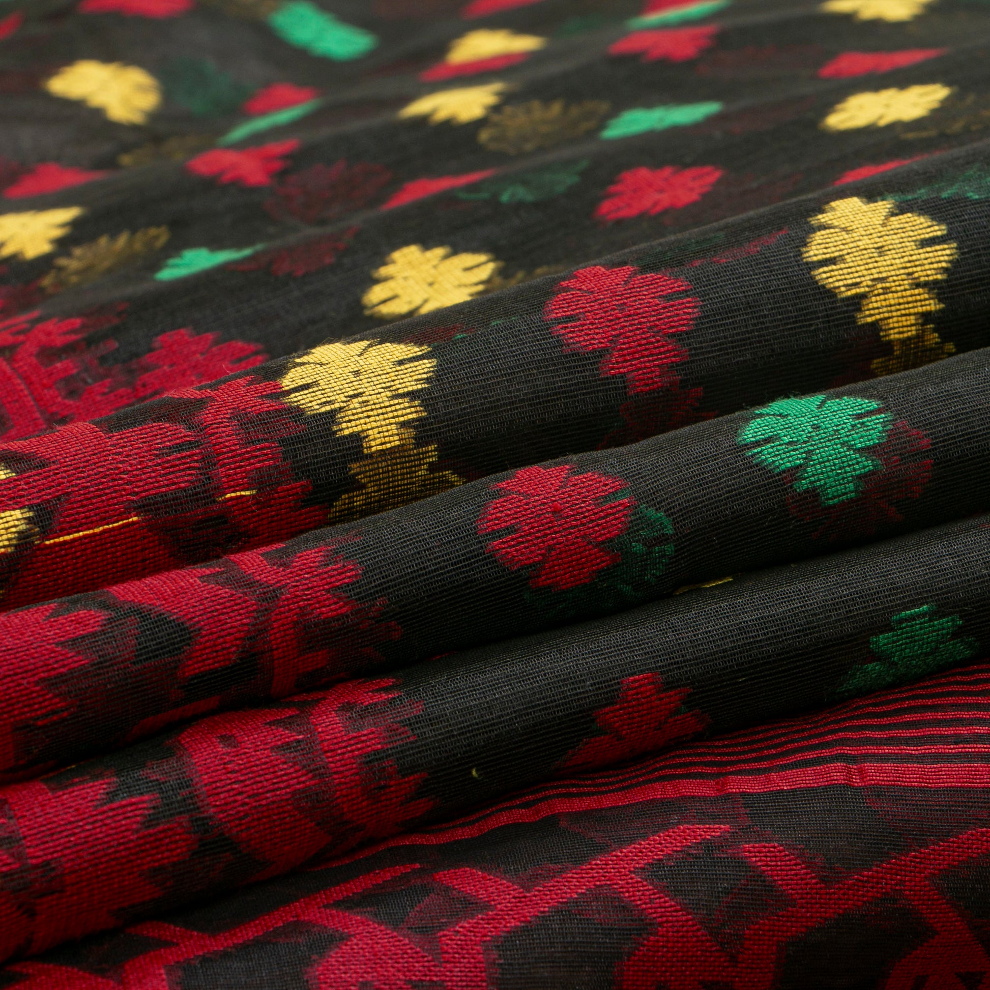 Black dhakai jamdani mulmul silk saree with multi colour floral work and attached blouse