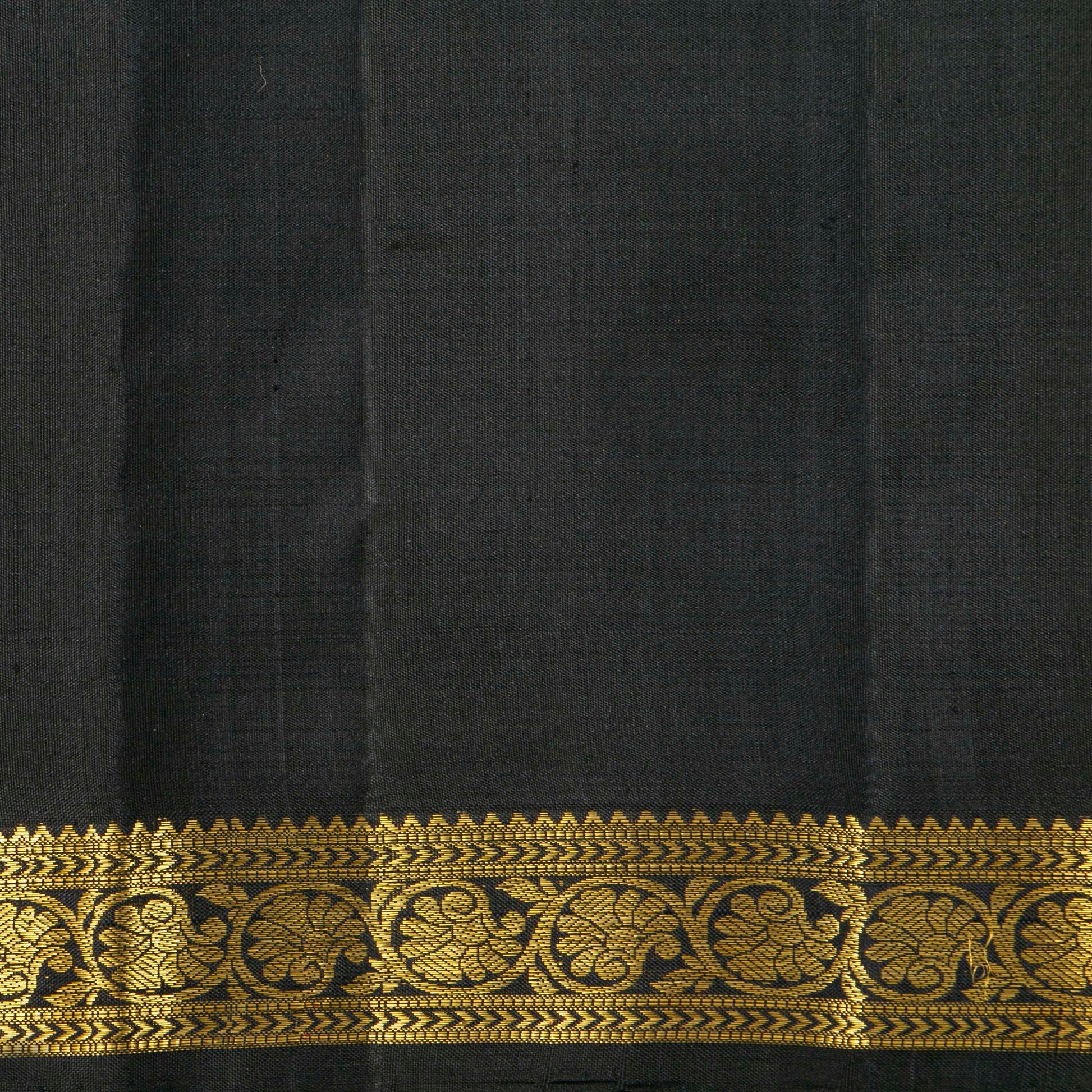 An authentic black kanchipuram silk saree handwoven in pure silk with silk mark certificate. The body is in black with floral motifs in gold zari. The border has floral pettu in gold zari. The pallu has peacock, floral and diamond patterns in gold zari. The blouse in black has a zari arm band for the sleeve matching the saree border.