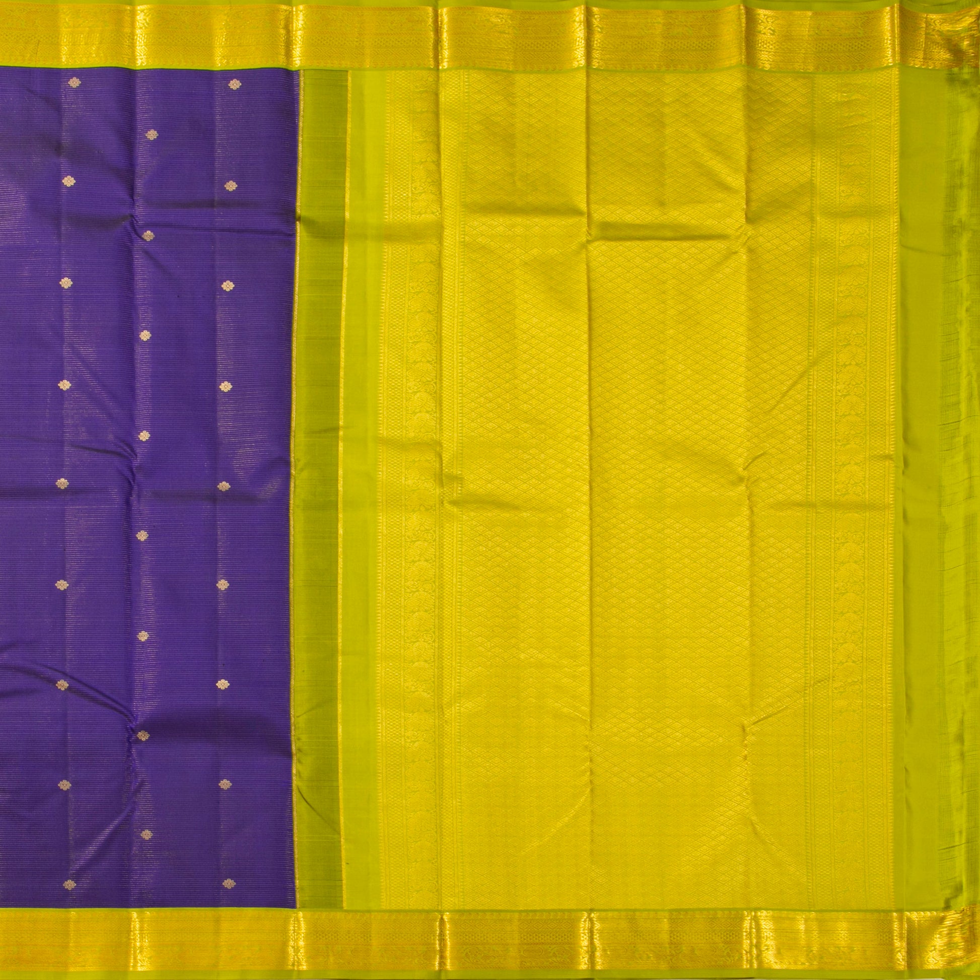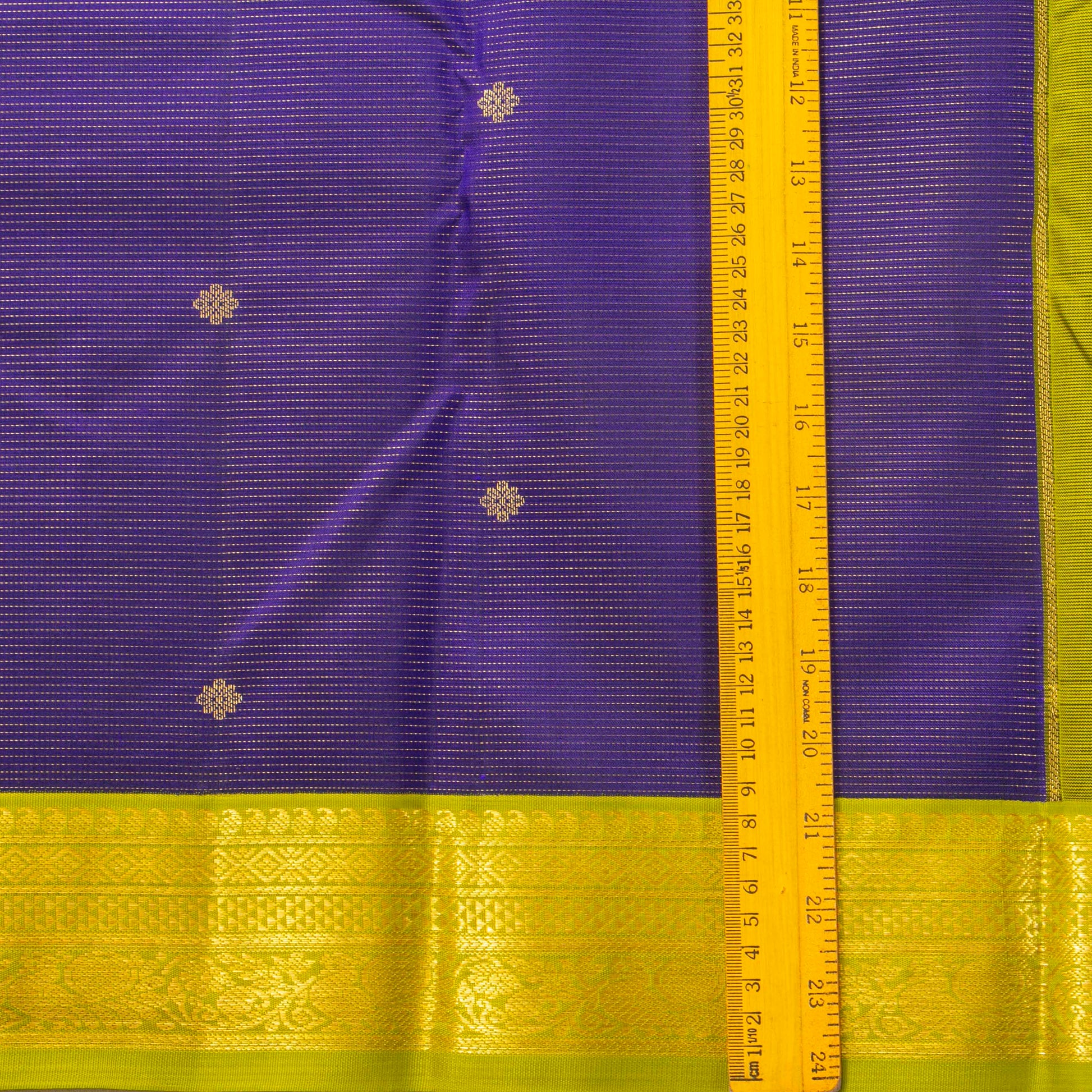 A blue and green kanchipuram silk saree handwoven in pure silk. The body is in blue with vaira oosi stripes and floral motifs in gold zari. The korvai green border and pallu has traditional patterns in gold zari. The attached blouse in green has a zari arm band matching the saree border.