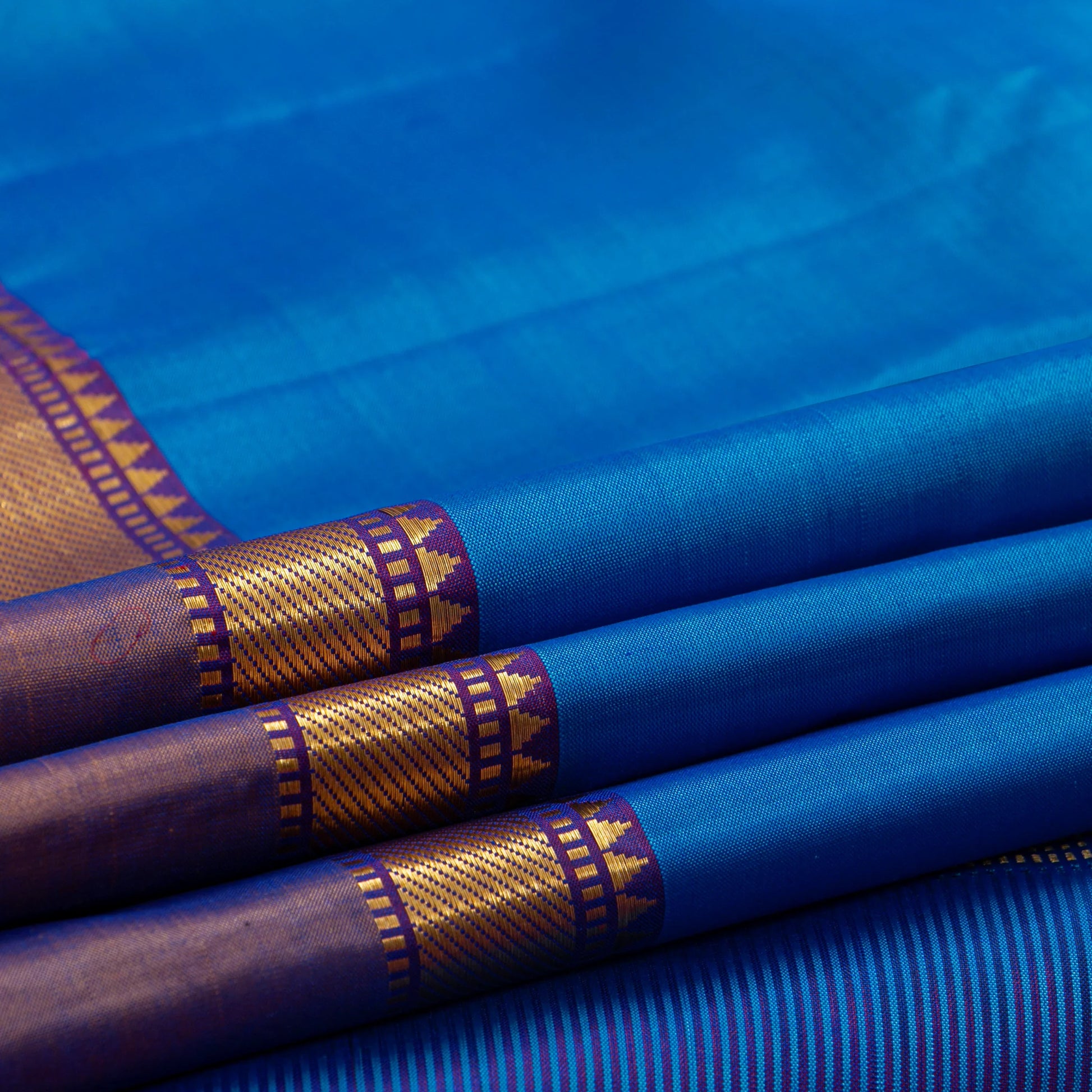 A blue kanchipuram silk saree handwoven in pure silk and pure zari . The body is in blue with violet shot with beige border with banarasi pettu in gold zari with a magenta selvedge. The violet pallu has stripes and bands in gold zari. The attached blouse in violet has a zari band matching the saree border.