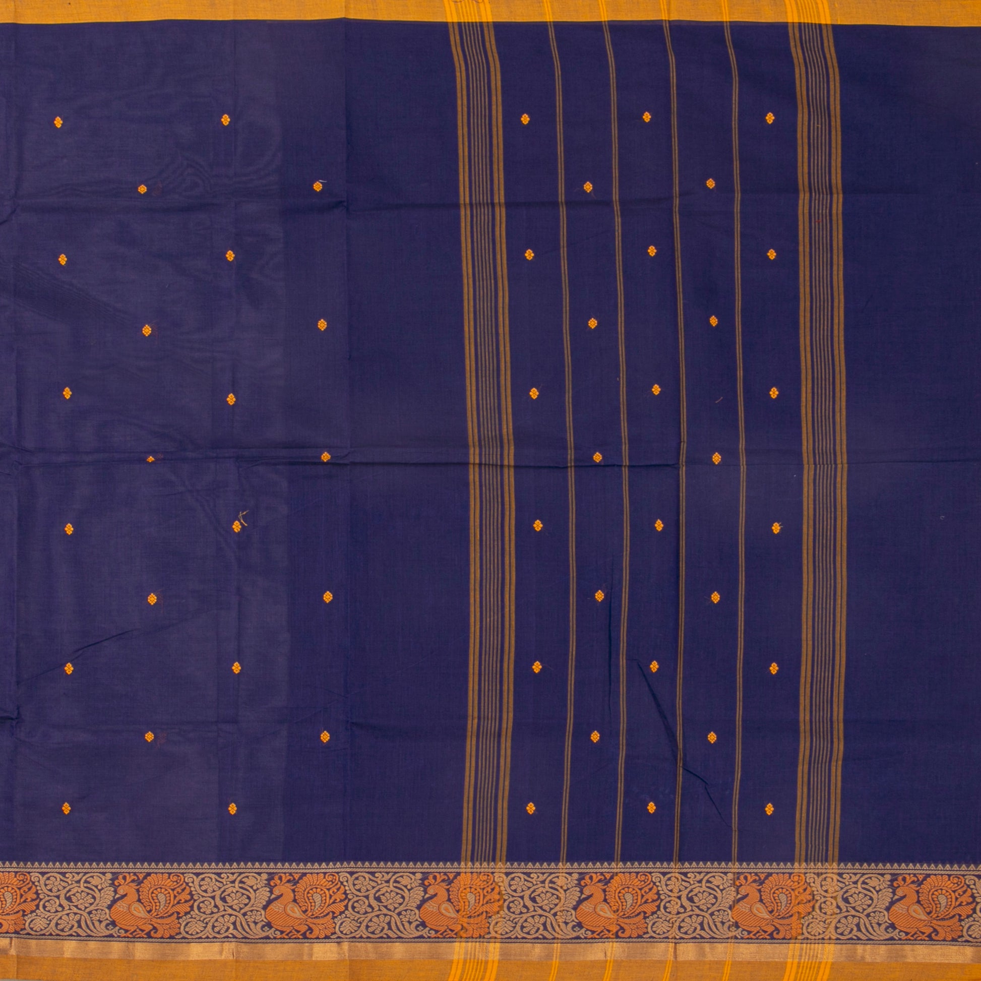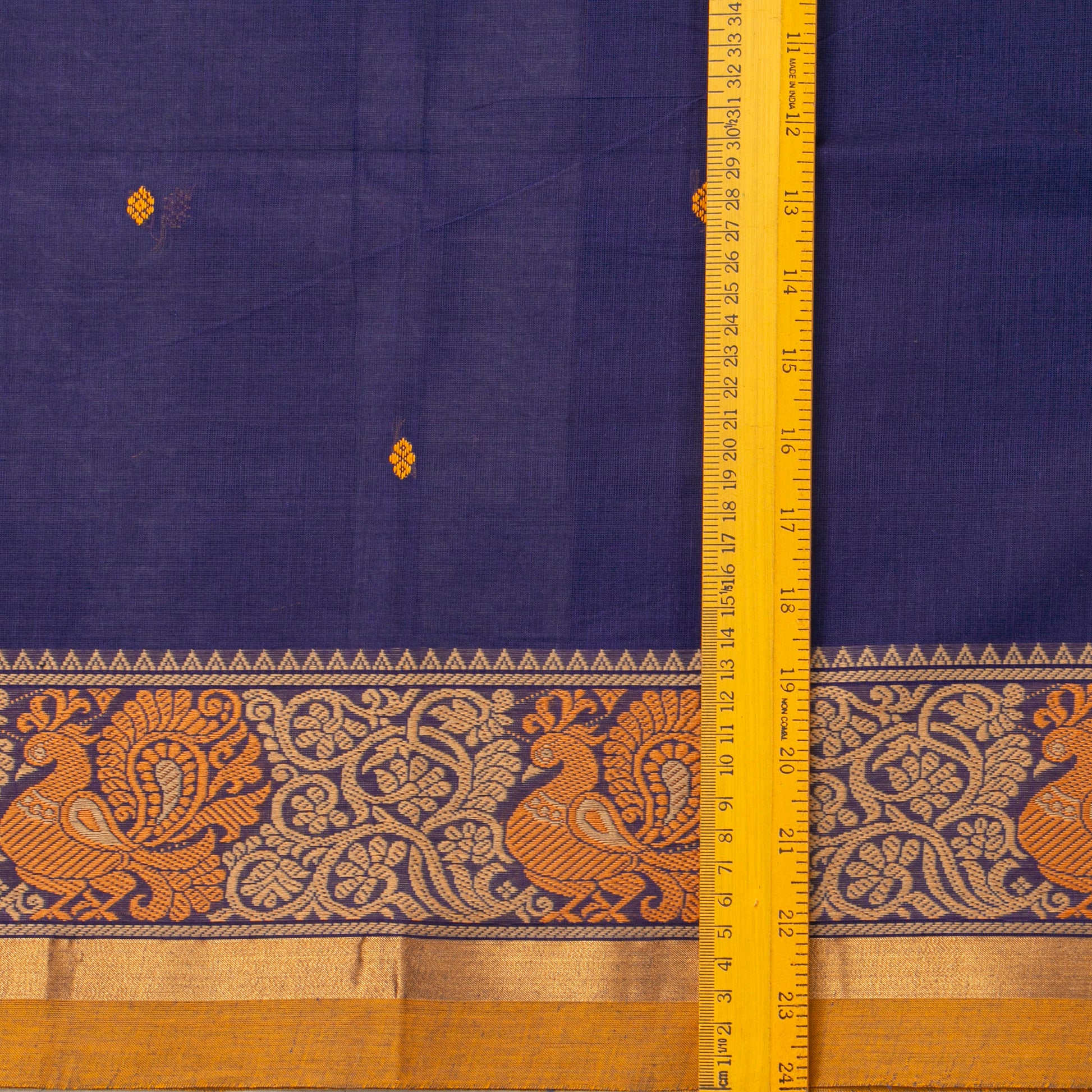 Blue kanchi cotton saree with mustard borders on both sides with rich gold zari work and an attached blouse.