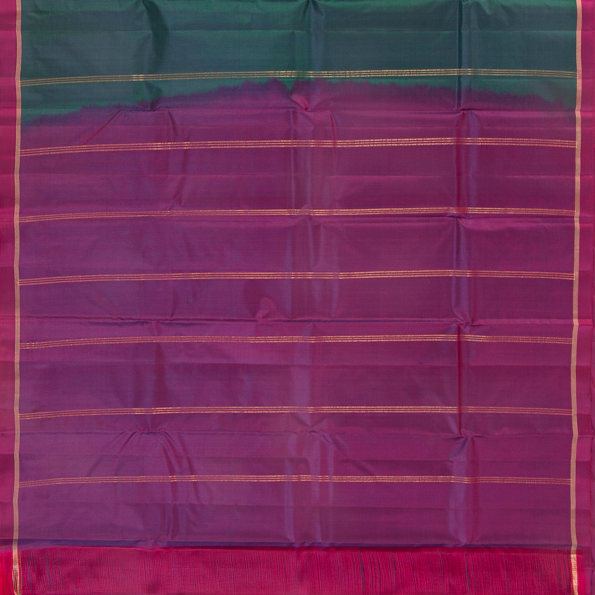 Light weight kanchipuram silk saree handwoven in pure silk. The body is in a dual tone of bottle green shot with purple with purple borders on both sides and a zari stripe. The pallu is in purple shot green with gold zari stripes and the blouse is in purple.