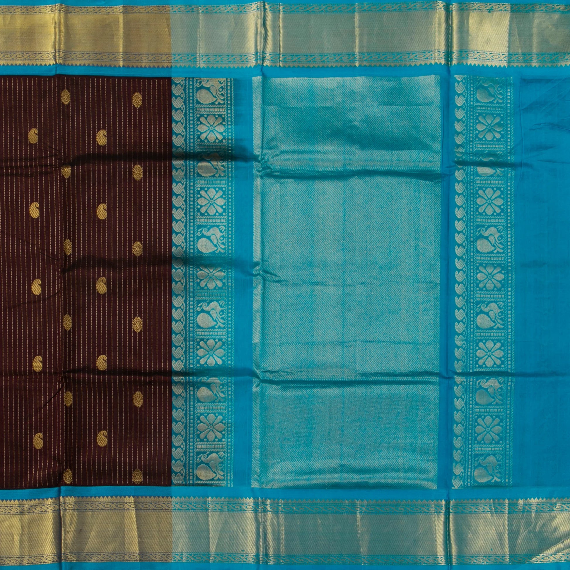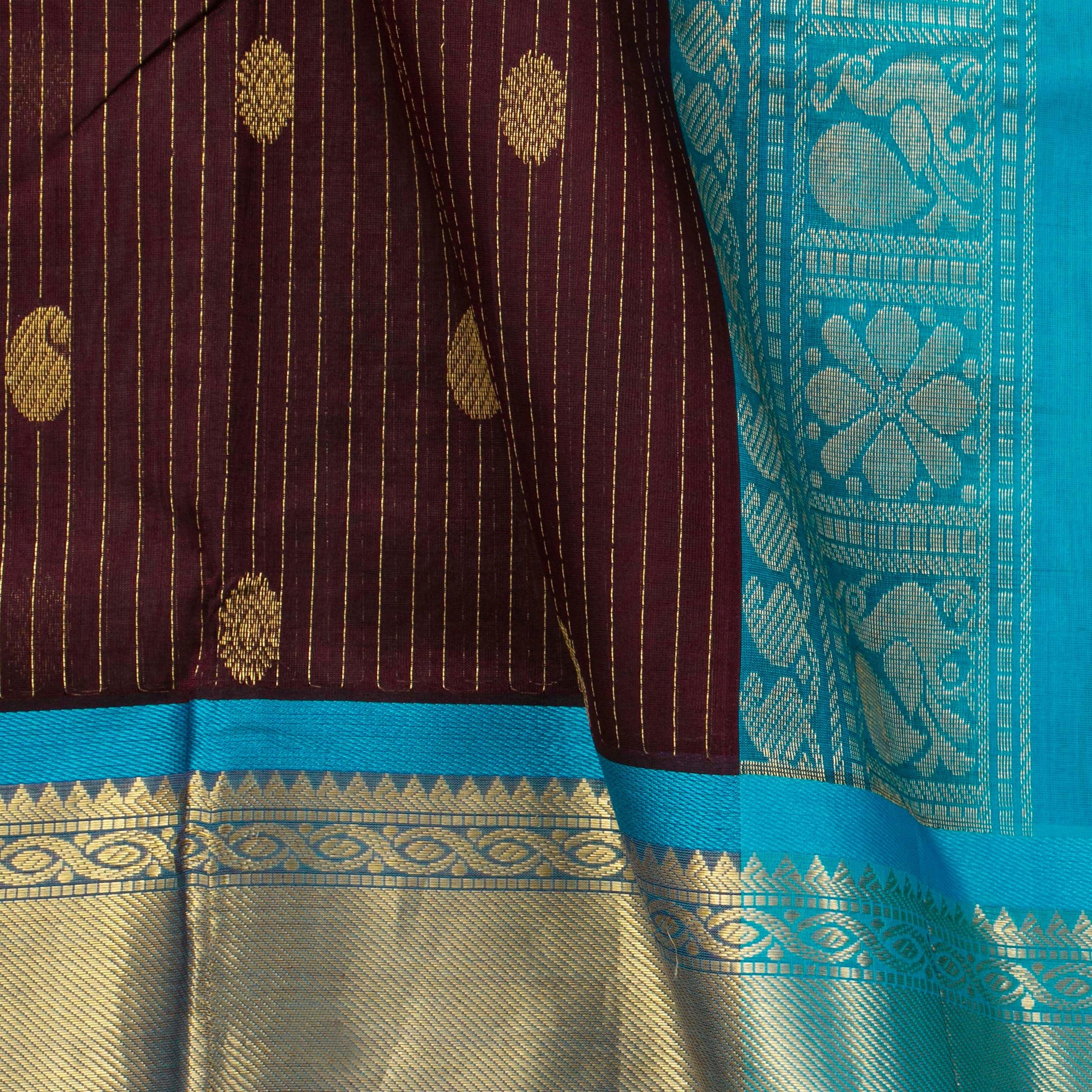 Brown and ananda blue striped kanchi silk cotton sari with vertical zari stripes and floral motifs in gold zari all over and an ananda blue korvai border with rich gold zari work in traditional designs. The ananda blue pallu has columns of annapakshi and floral motifs in gold zari. The blue blouse has a zari arm band matching the saree border.