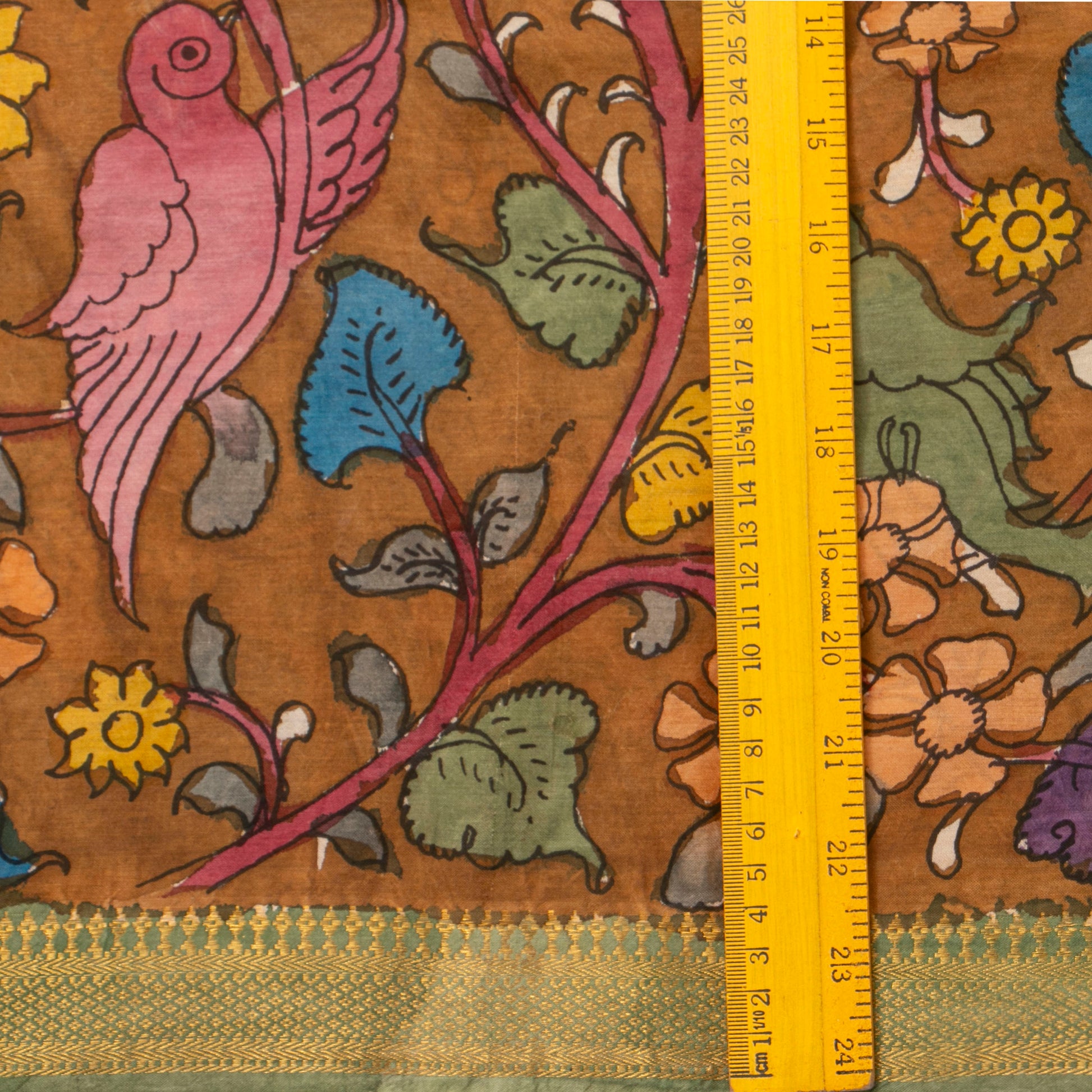 Brown handpainted kalamkari on mangalgiri silk saree with floral theme on the body and a green border having gold zari work with a red pallu having a peacock motif with attached blouse.
