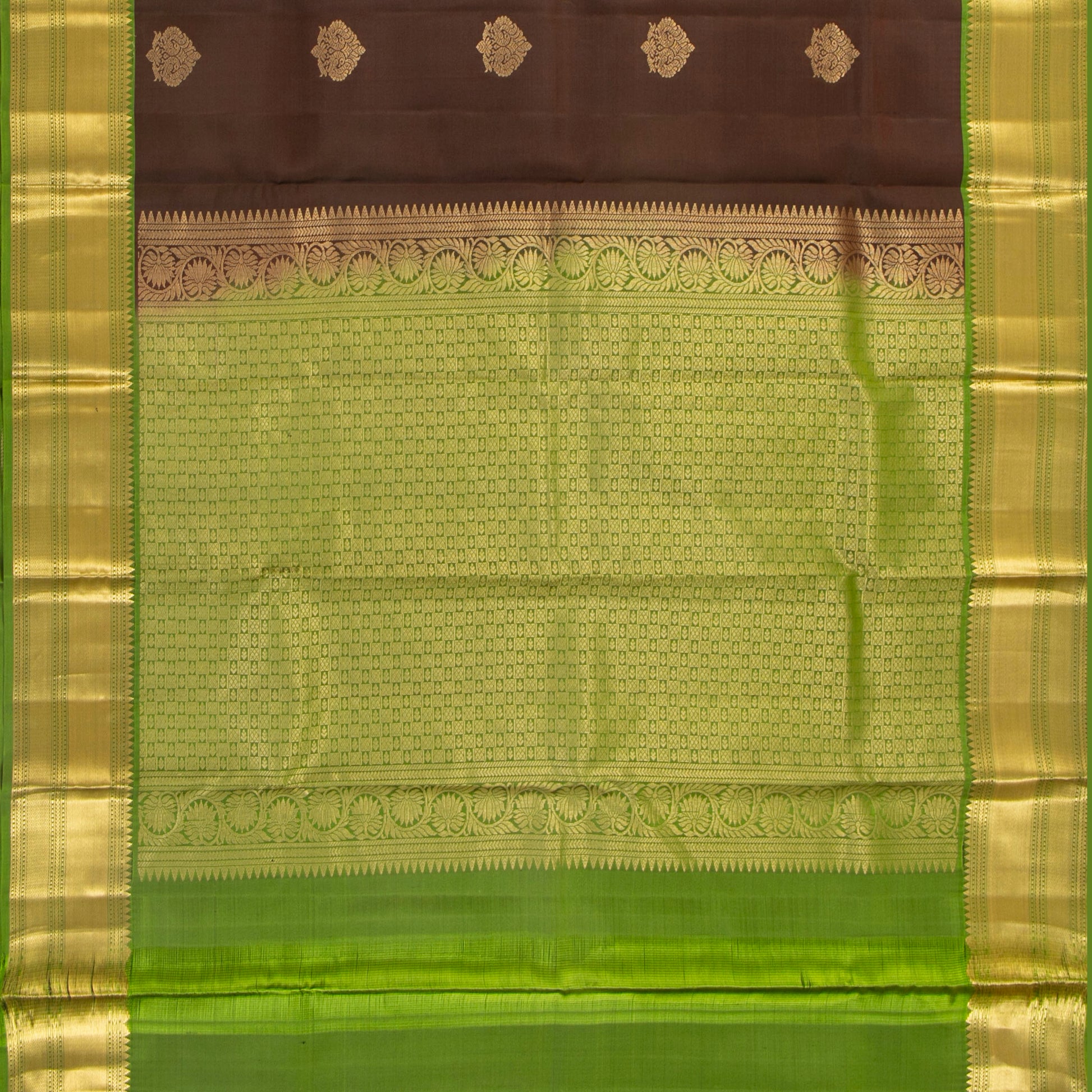 Brown kanchipuram silk saree handwoven in pure silk and pure zari. The body is in chocolate brown with large floral motifs in gold zari all over the body with a light green korvai contrast border having rich gold zari work in traditional designs. The pallu in light green has geometric patterns in gold zari flanked by columns of kodi kamalam motifs in gold zari. The attached blouse is in light green with a zari arm band for the sleeve matching the saree border.