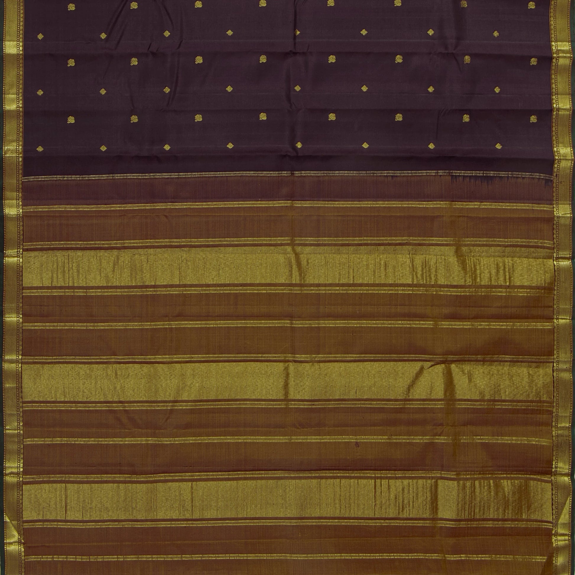 A brown kanchipuram silk saree handwoven in pure silk and pure zari . The body is in brown with peacock and floral motifs in gold zari. The border has banarasi pettu in gold zari with a green selvedge. The mustard pallu has stripes and bands in gold zari. The attached blouse in mustard has a zari band matching the saree border.