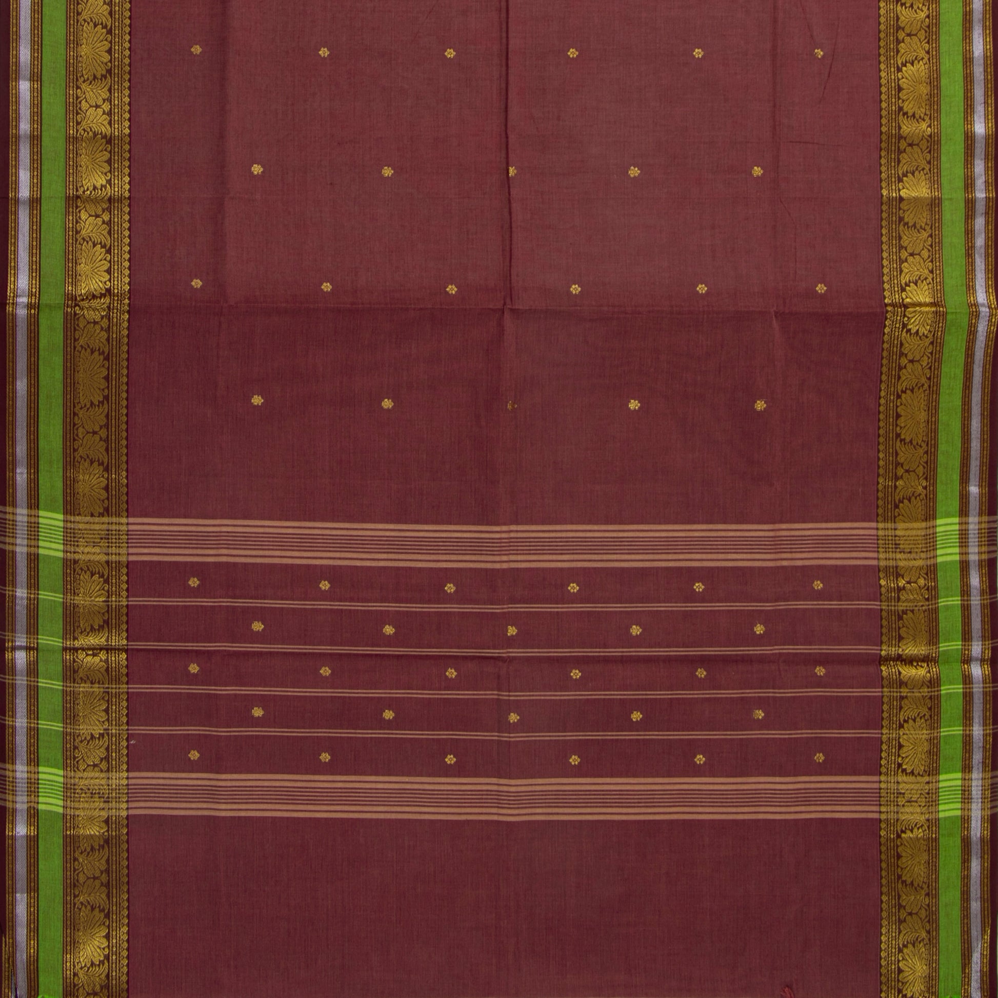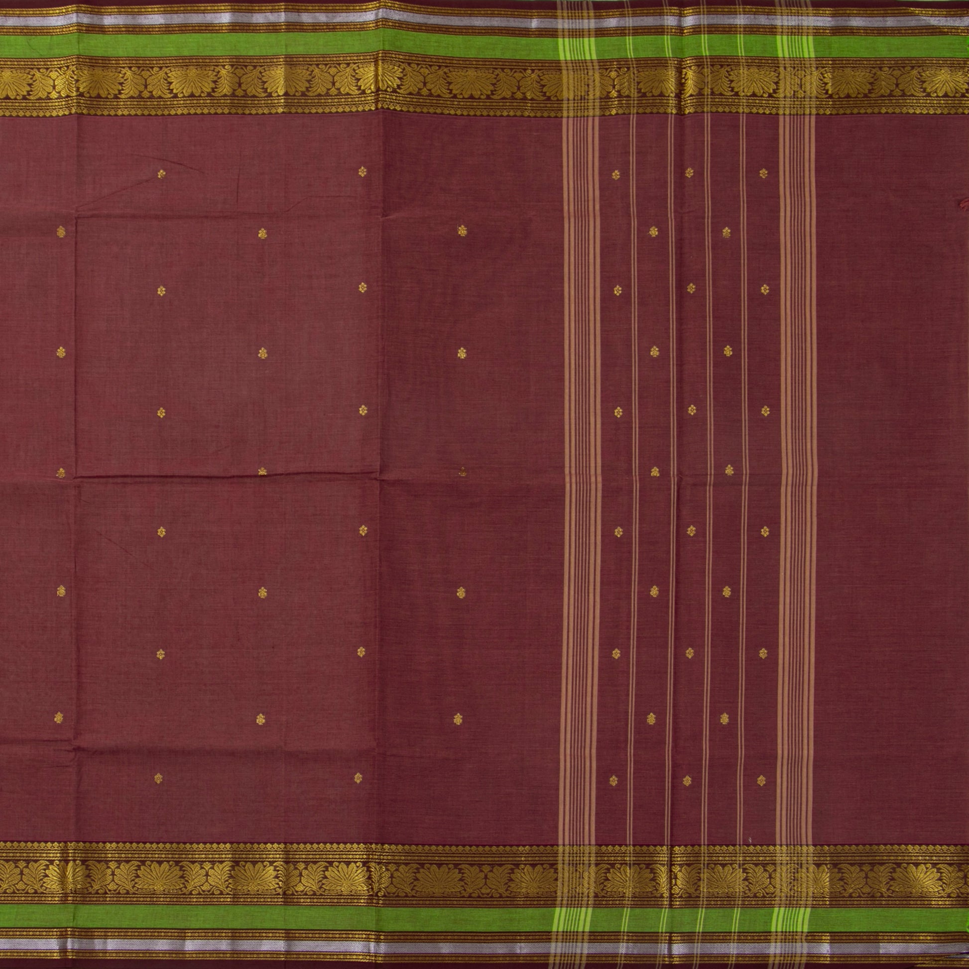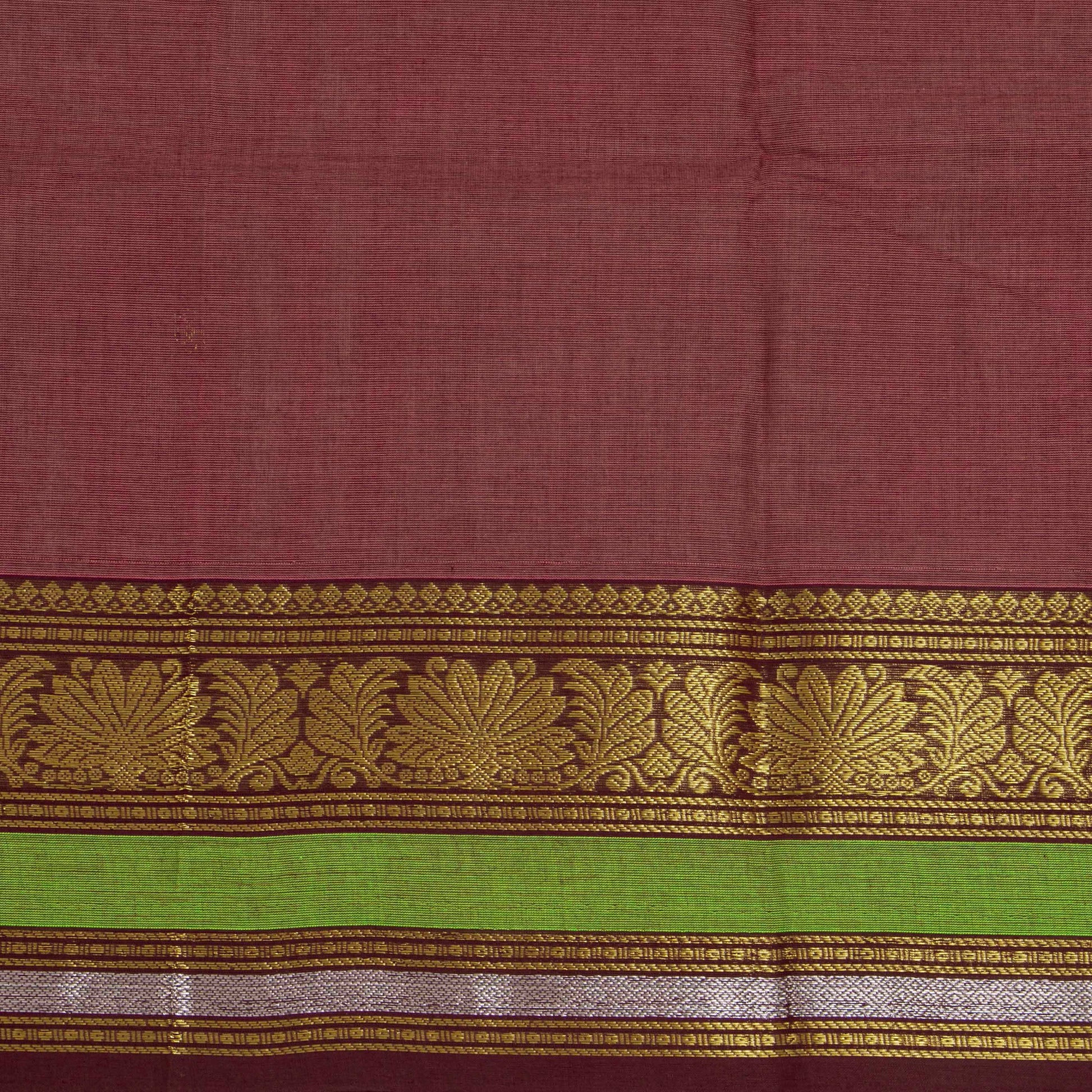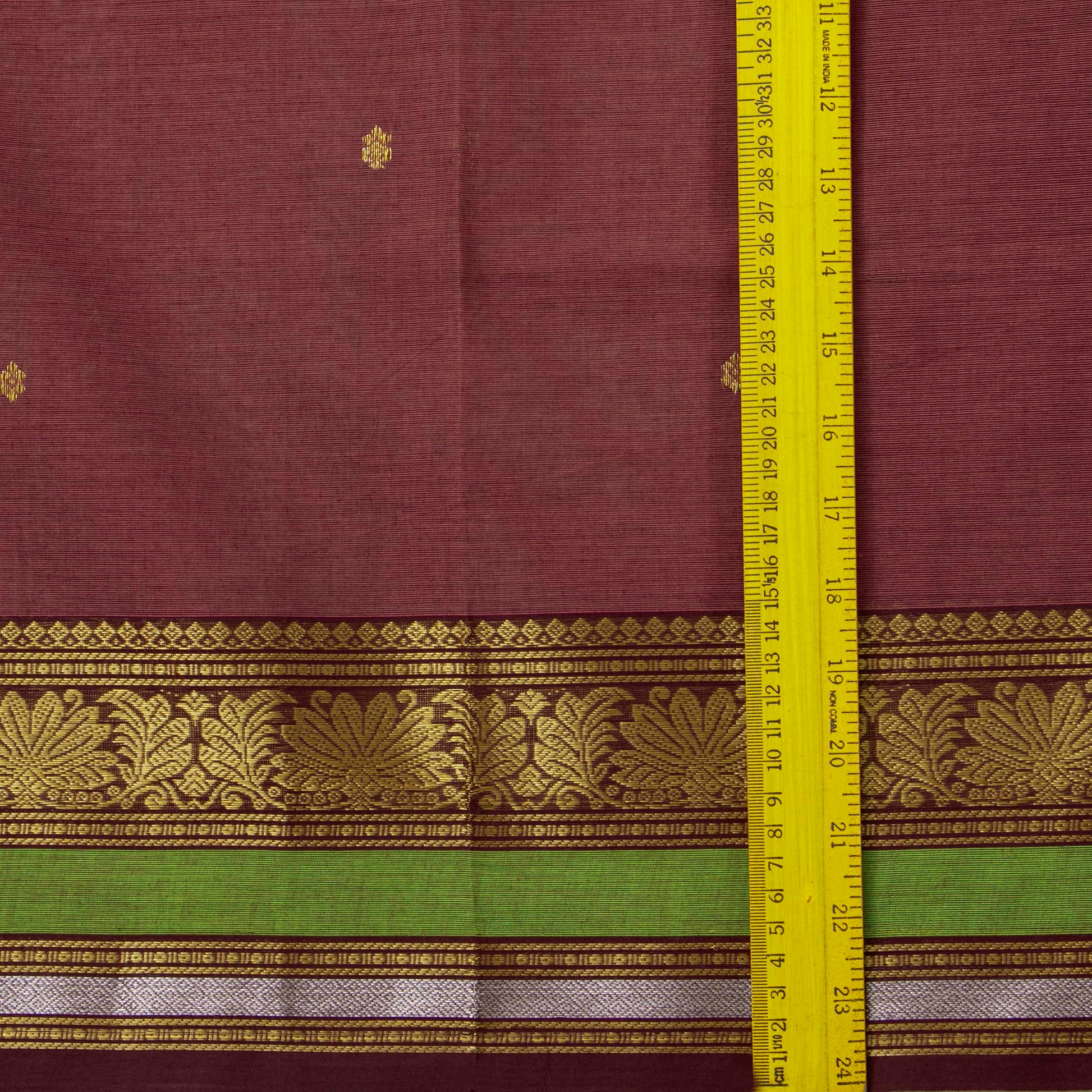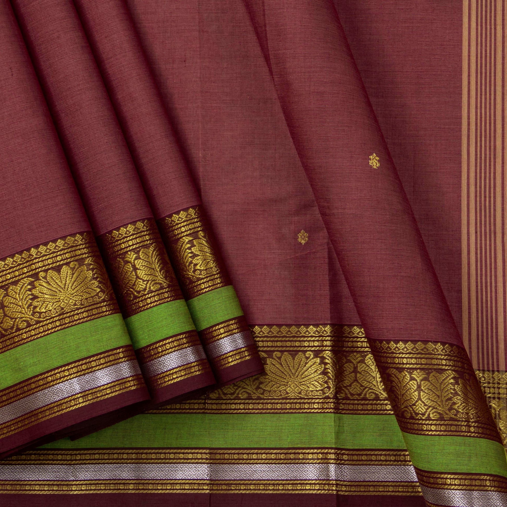 Brown kanchi cotton saree with green borders on both sides with rich gold zari work and an attached blouse.