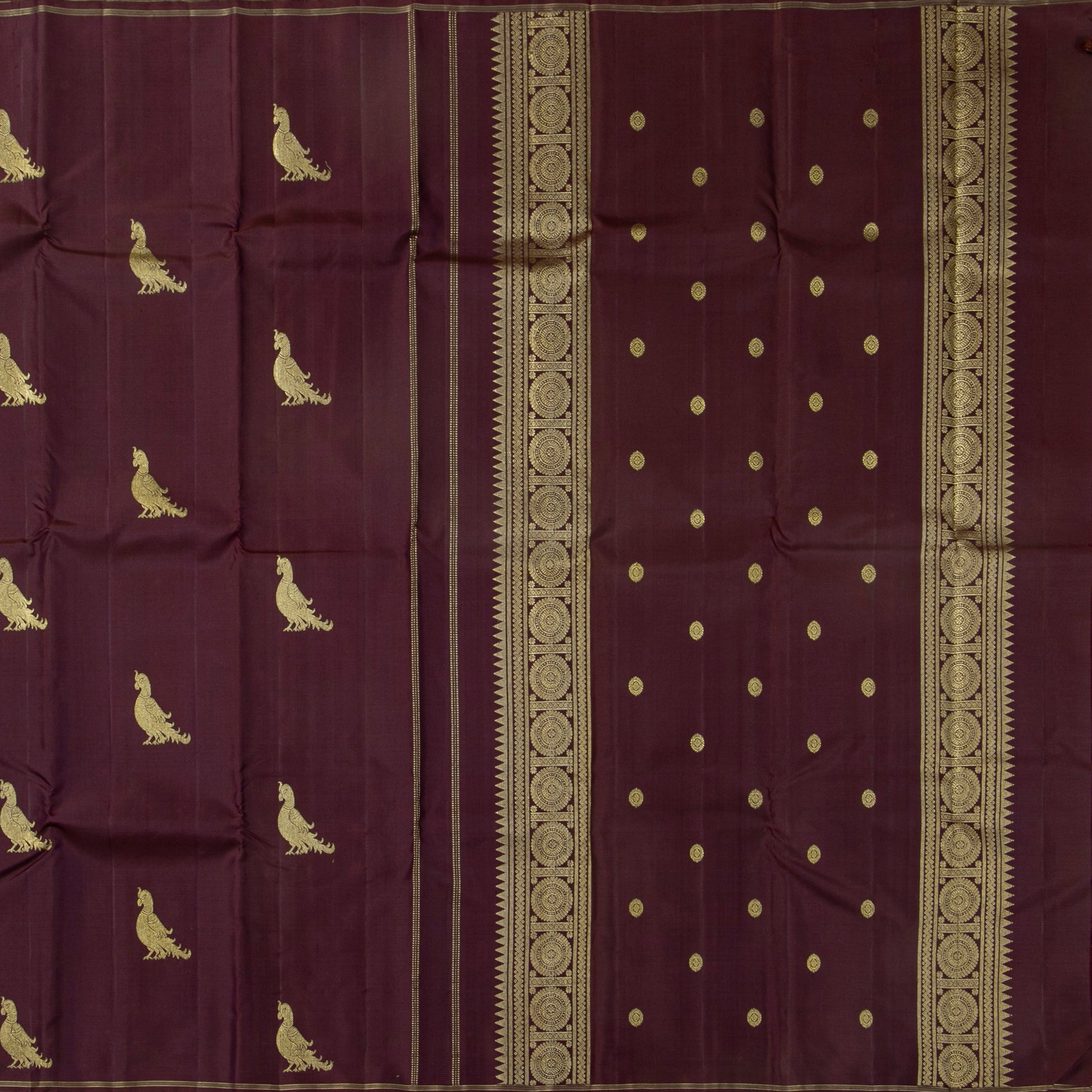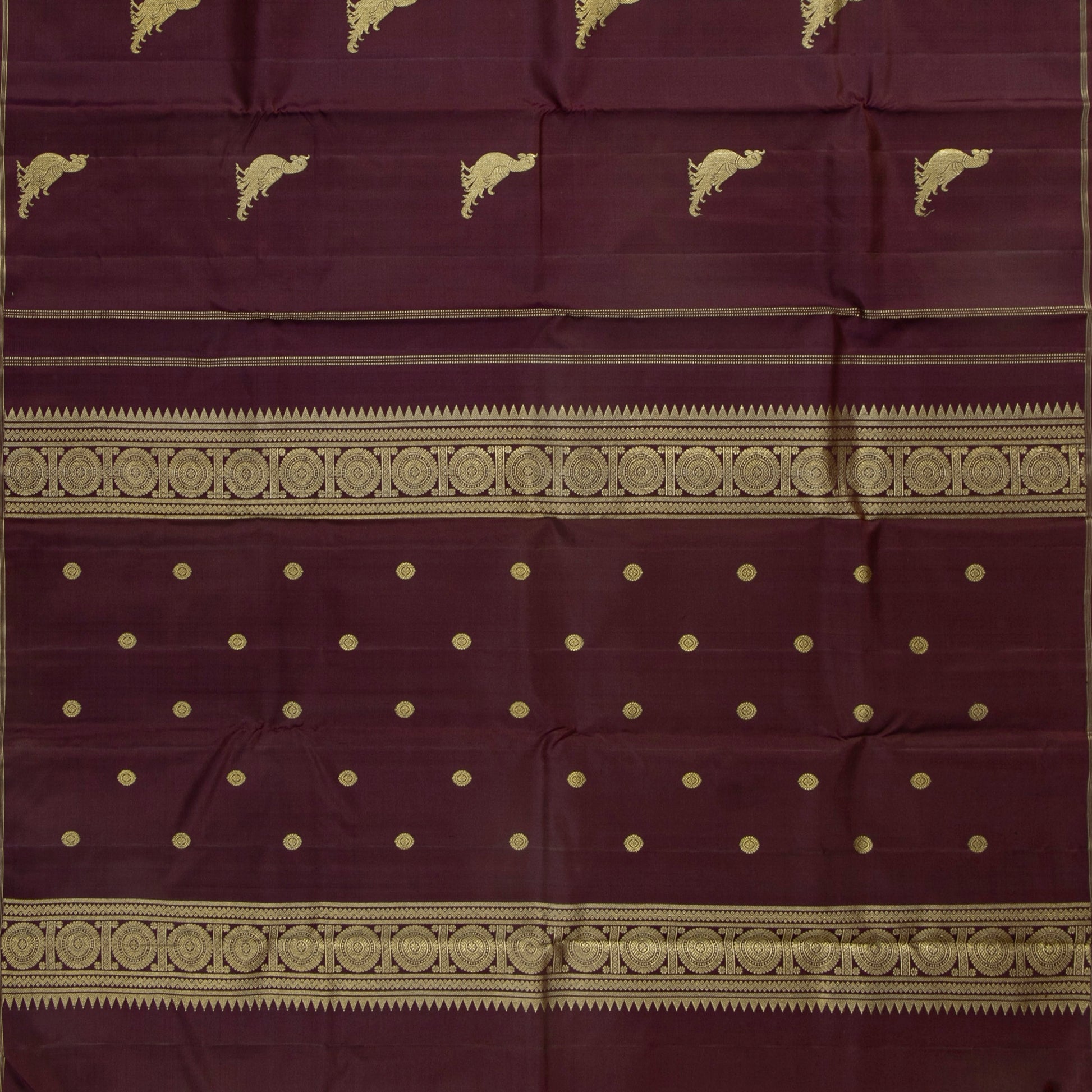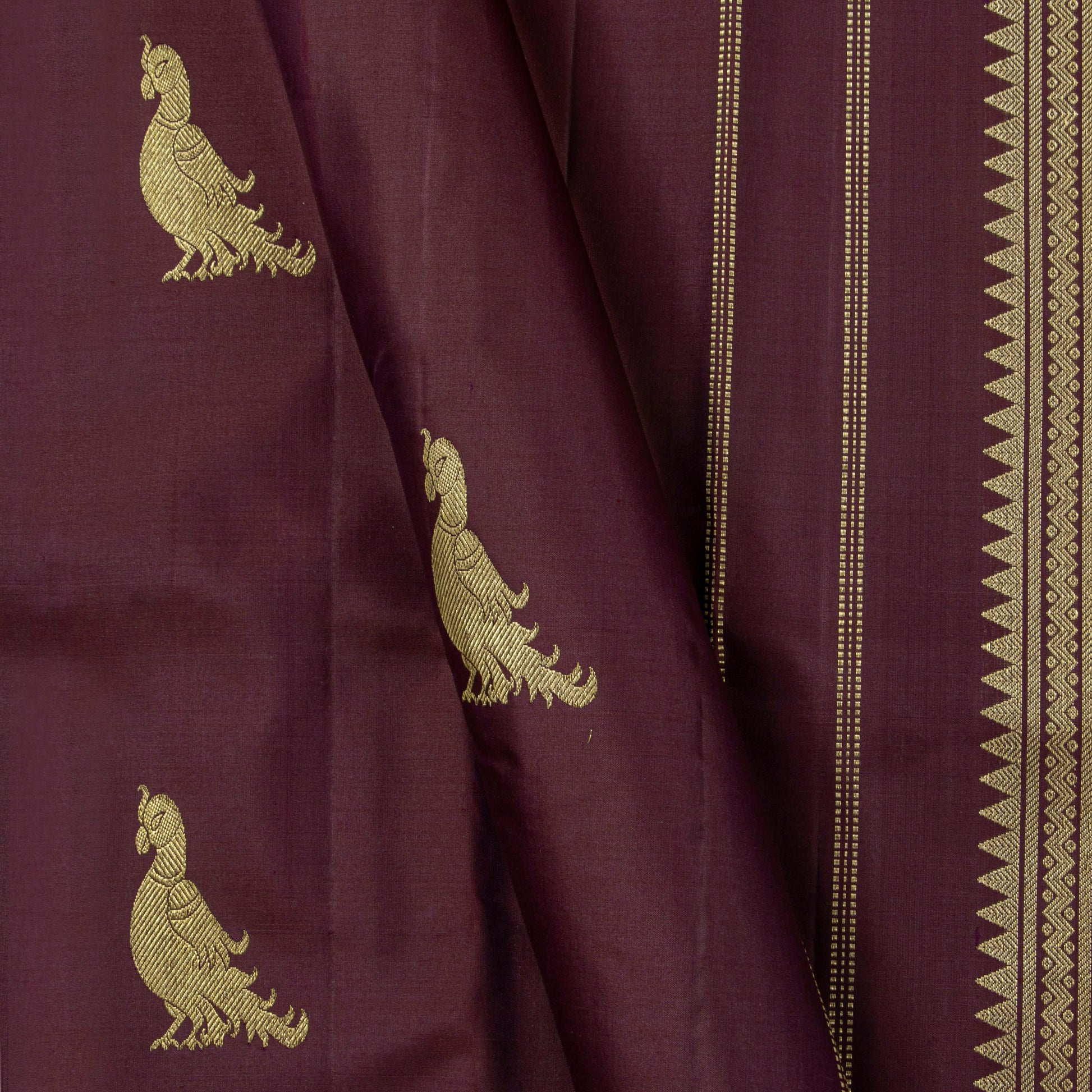 A brown handwoven kanchipuram borderless silk saree in pure silk and pure zari. The body is in brown with parrot motifs in gold zari. The pallu has floral pettu and kamalam motifs in gold zari. The attached brown blouse has gold zari work matching the borders for the blouse sleeve.