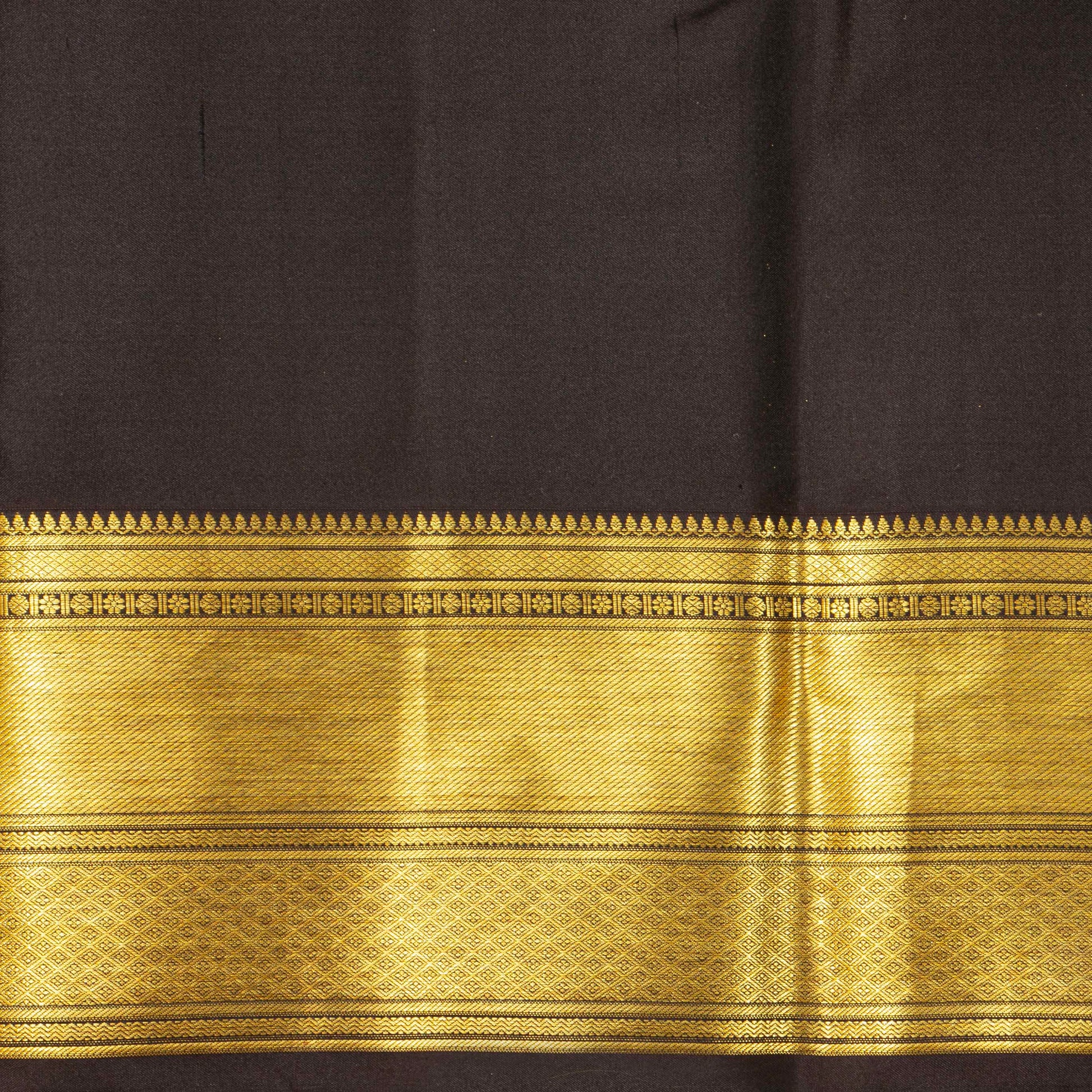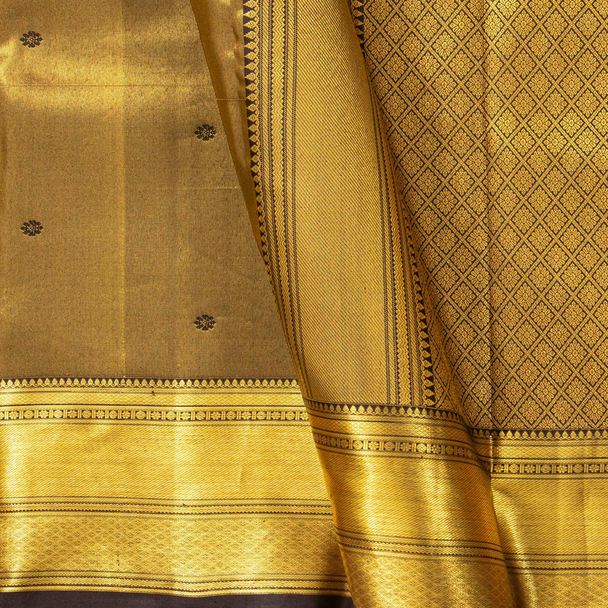 Brown tissue kanchipuram silk saree handwoven in pure silk. The body is in brown with tissue gold zari and floral patterns. The border has banarasi and diamond pettu in gold zari. The pallu has diamond patterns in gold zari. The attached blouse is in brown with an armband matching the saree border.
