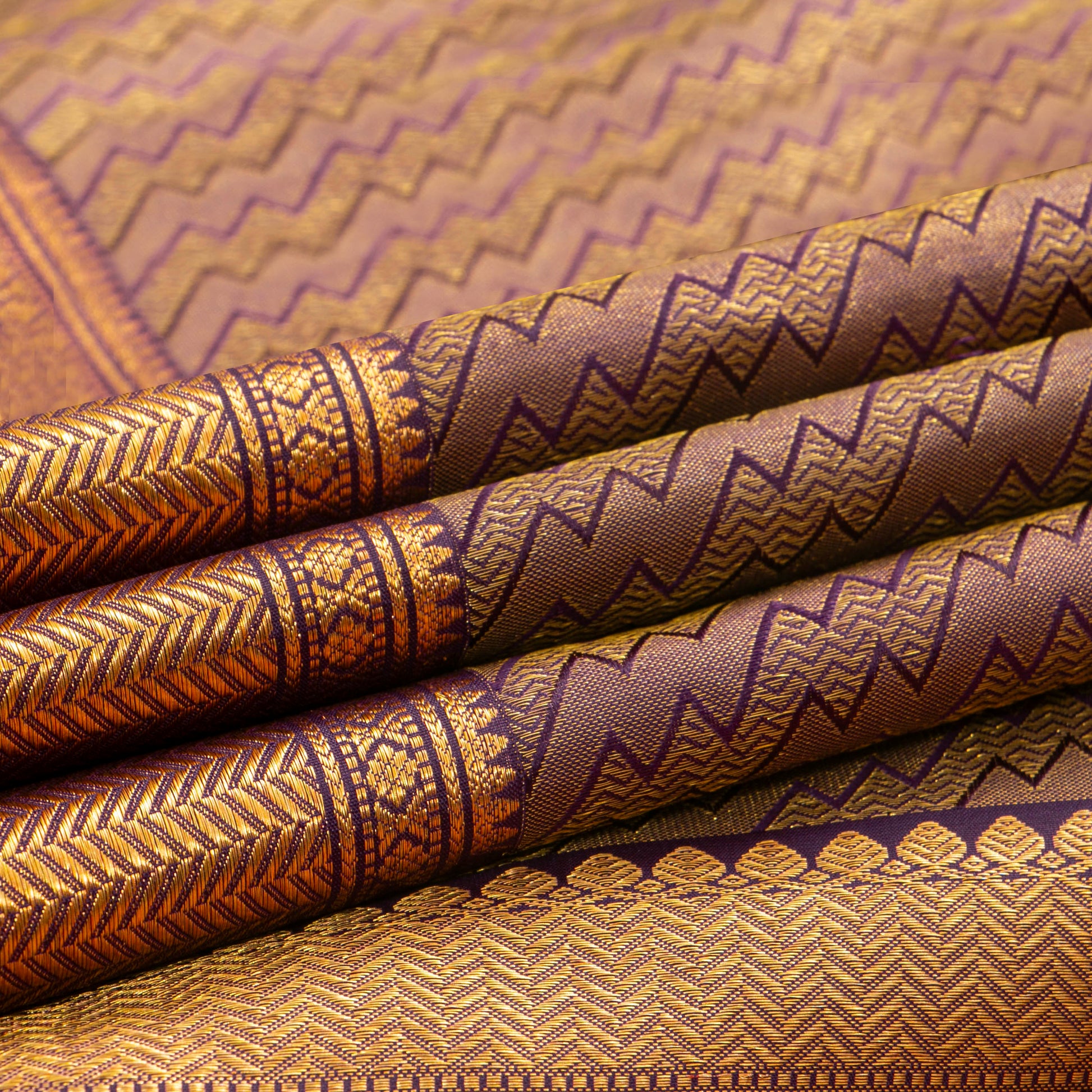 A deep purple and gold kanchipuram silk saree handwoven in pure silk and pure zari. The body is in deep purple with rich gold zari work in a chevron fractal pattern all over the body. The self borders have rich gold zari work in geometric chevron patterns and arai maadam diamond patterns and the pallu has rich gold zari work. The attached blouse. indeep purple has a zari arm band matching the saree border.