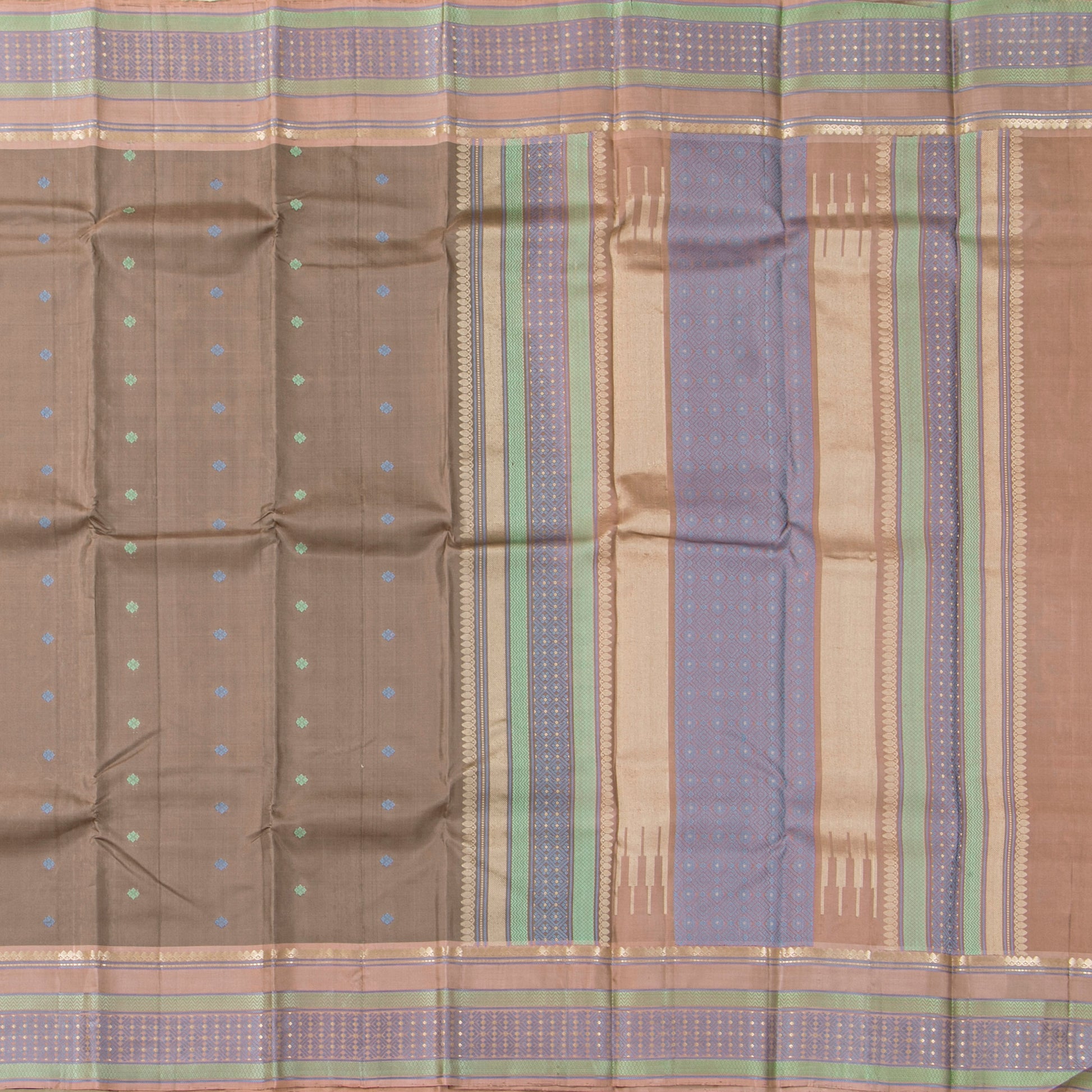 A fawn original kanchipuram no zari silk saree handwoven in pure silk. The body is in fawn with floral motifs in blue and green silk thread. The gheva border and pallu has traditional patterns in silk thread. The attached blouse in gheva has an arm band matching the saree borders.