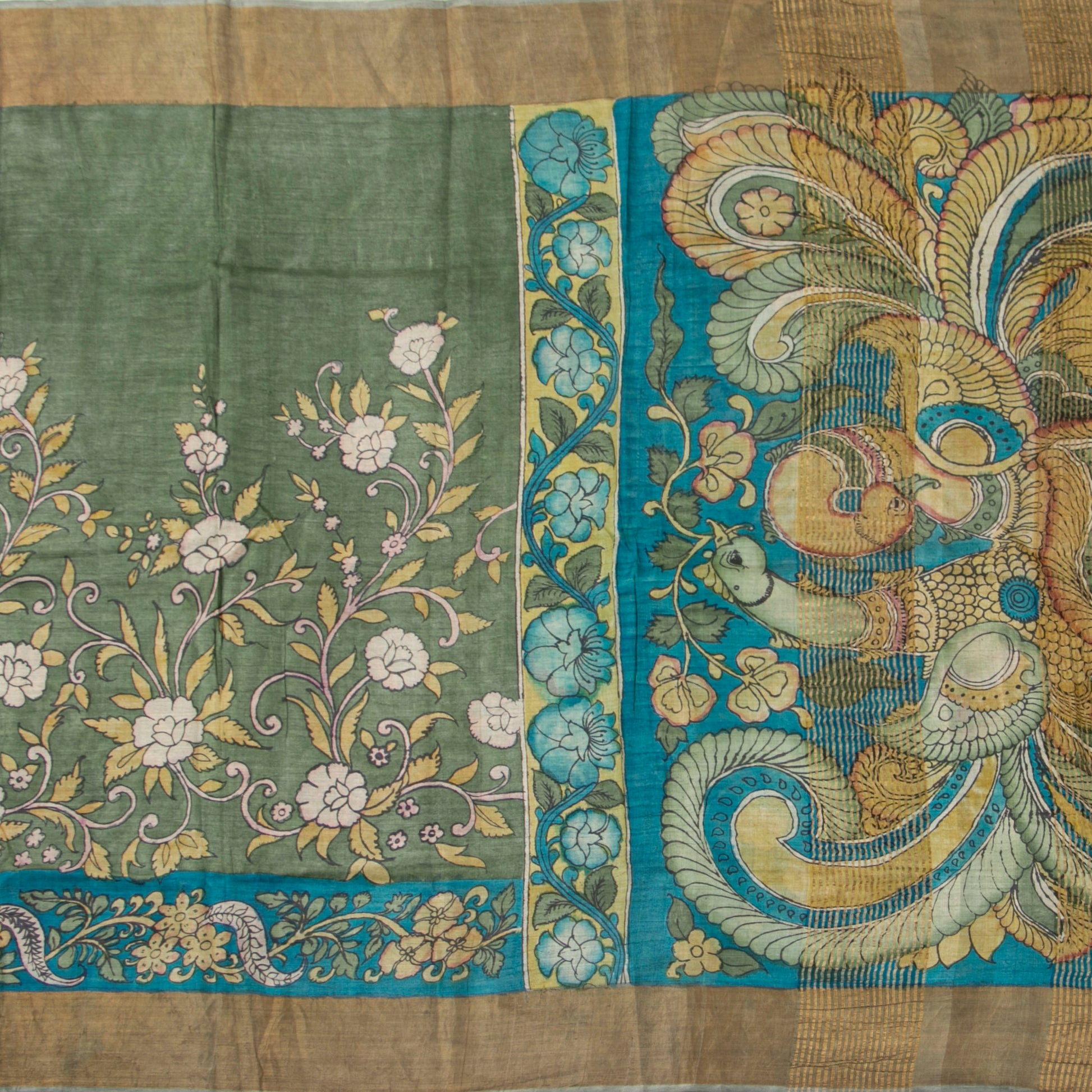 Beige Kalamkari Tussar Silk Saree Handpainted Floral And Peacock Pattern...