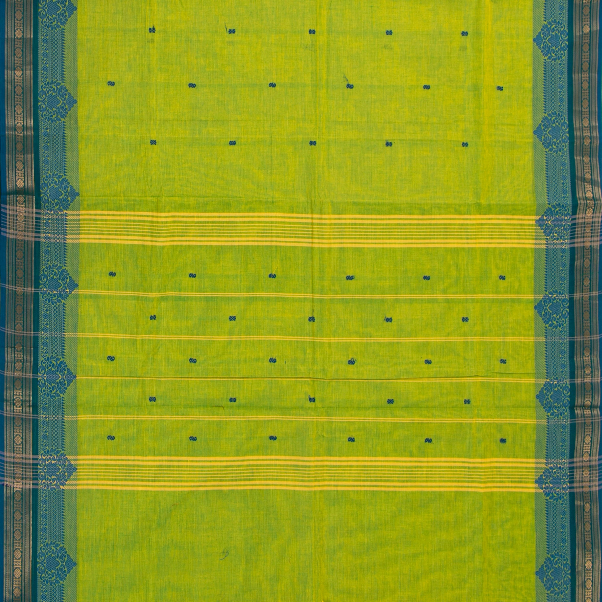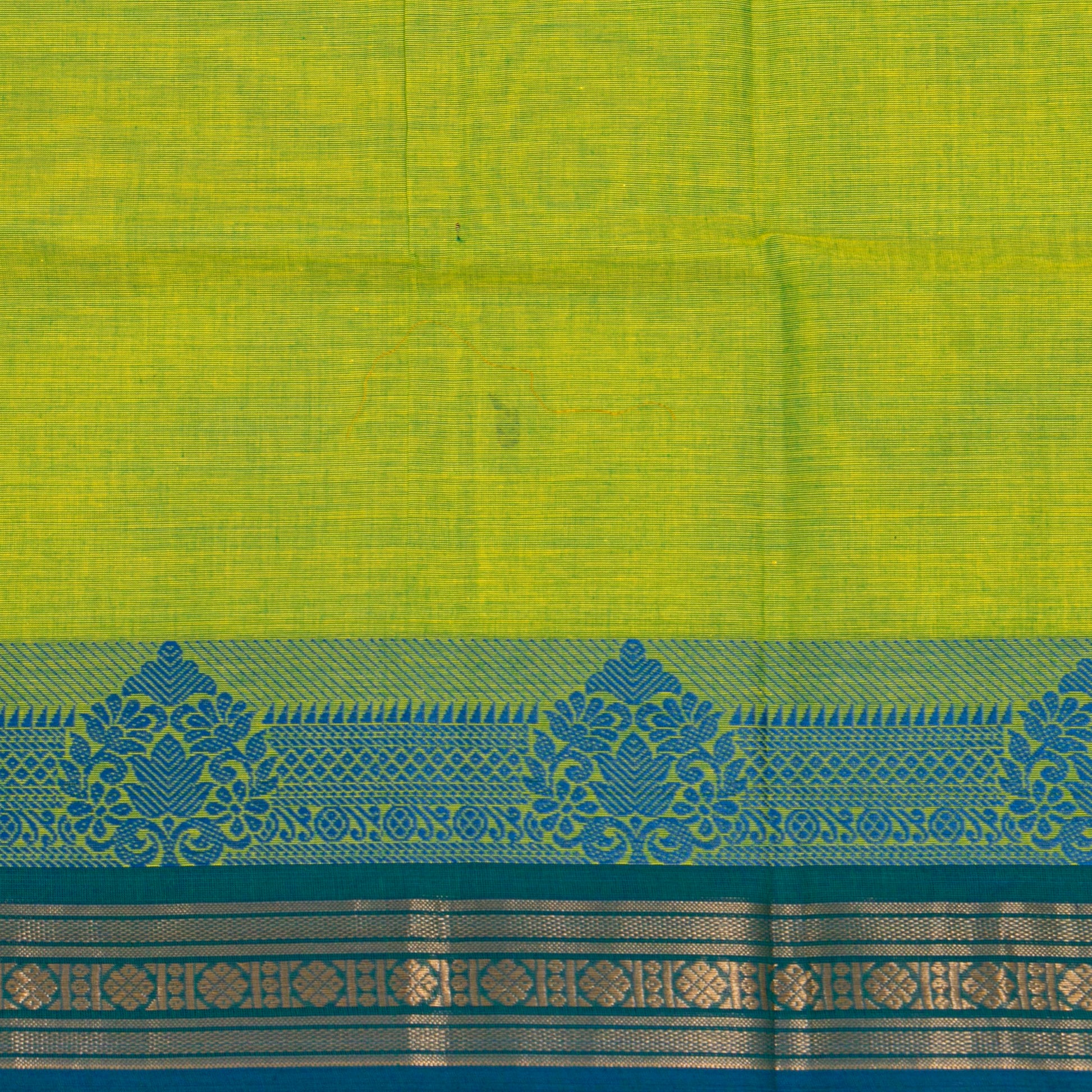 Green kanchi cotton saree with blue border on both sides with rich gold zari work and an attached blouse.