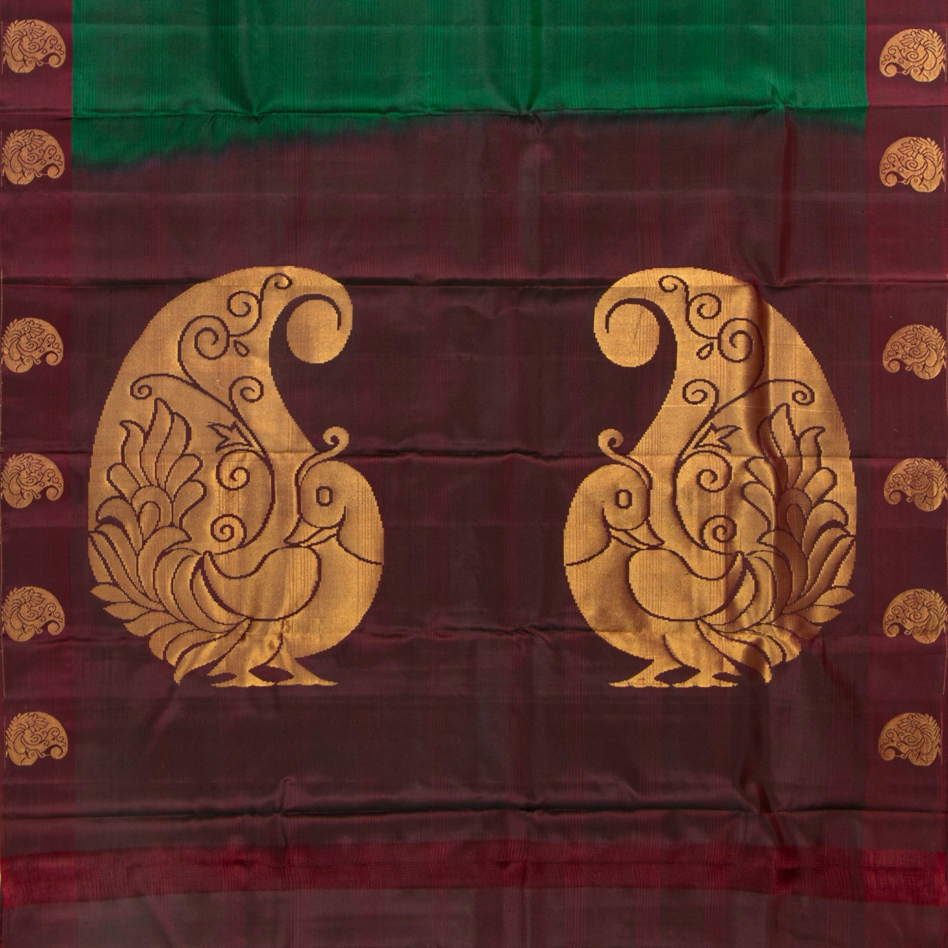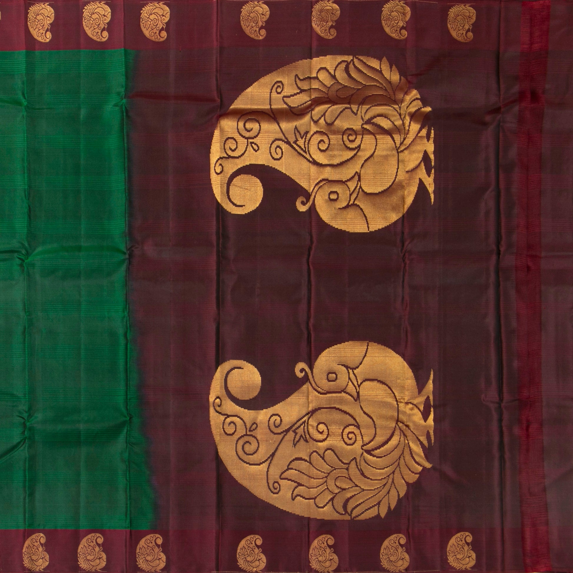 Green and maroon kanchipuram silk saree handwoven in pure silk. The body is in green with maroon border with paisley motifs in gold zari. The maroon pallu has paisley motifs in gold zari. The attached blouse is in maroon with an armband matching the saree border.