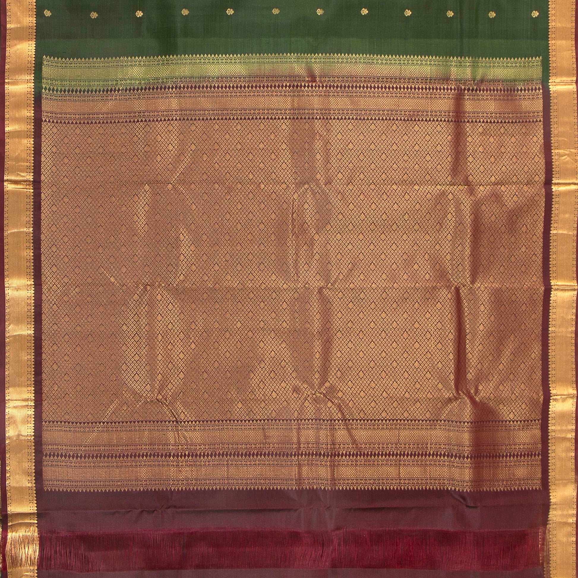 Moss green kanchipuram silk saree handwoven in pure silk. The body is in green with floral motifs in gold zari. The maroon border has banarasi pettu in gold zari. The maroon pallu has floral and diamond patterns in gold zari. The attached blouse is in maroon with an armband matching the saree border.