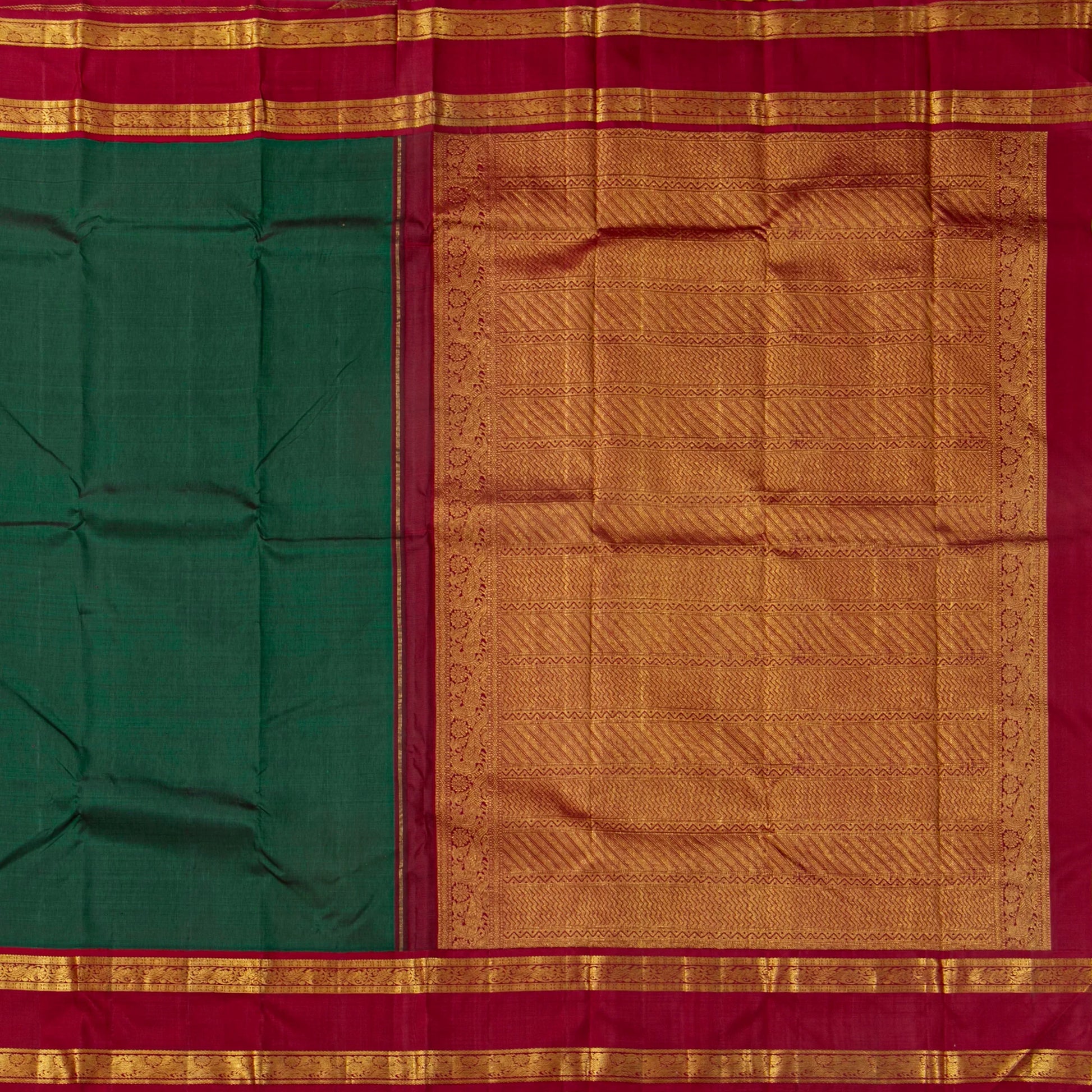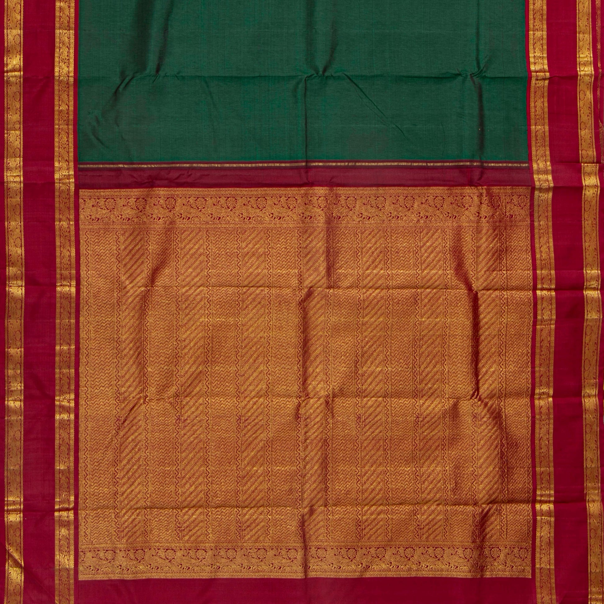 A green and red kanchipuram silk saree handwoven in pure silk and pure zari . The body is in green with a red rettai pettu border with peacock and floral pettu in gold zari. The red pallu has traditional patterns in gold zari. The attached blouse in magenta has a zari band matching the saree border.