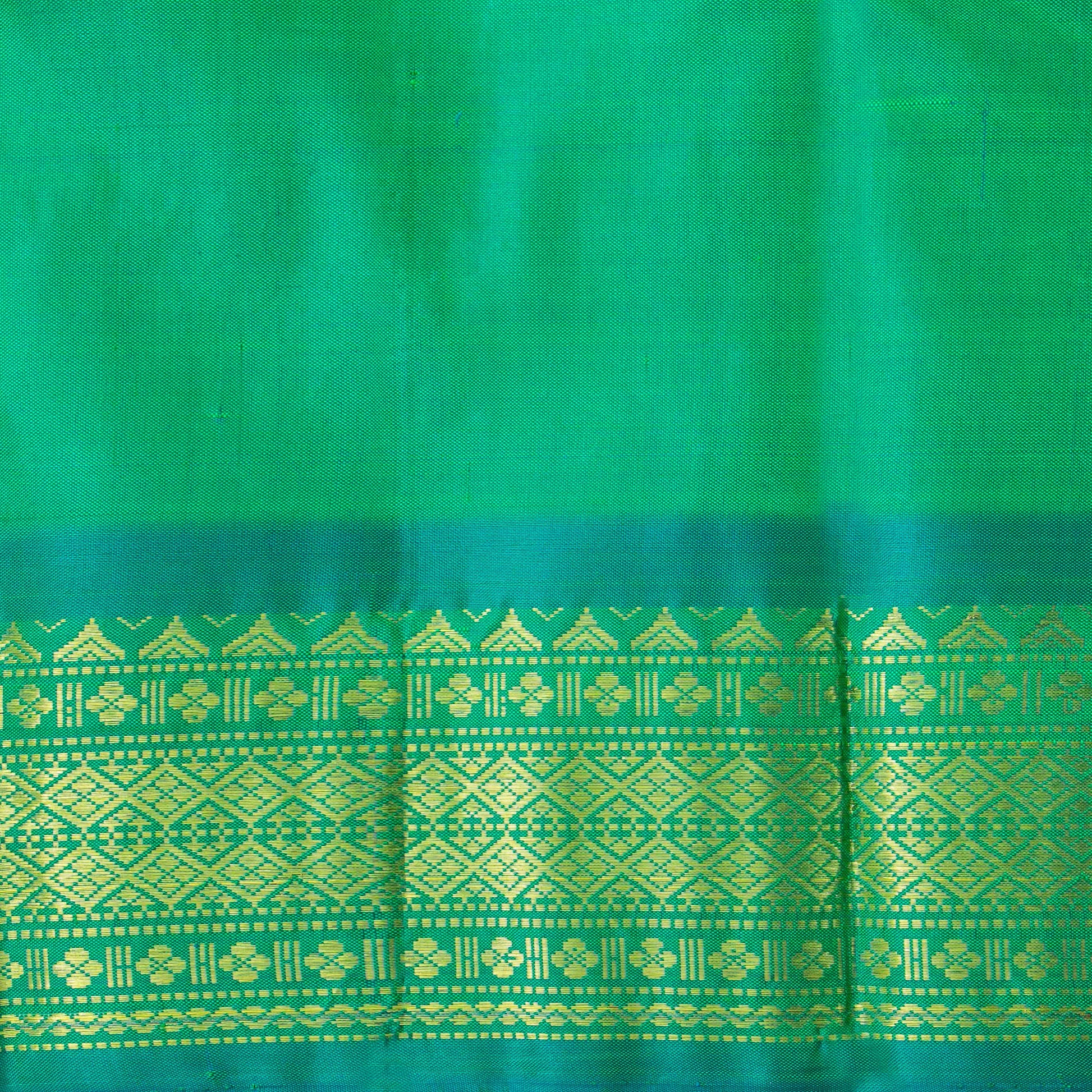 A green and turquoise dual shade kanchipuram silk saree handwoven in pure silk and pure zari. The body is in green shot turquoise blue with large peacock motifs in gold zari with meenakari work in silk thread. The borders and pallu have traditional designs in gold zari with the matching attached blouse having a zari arm band for the sleeve.