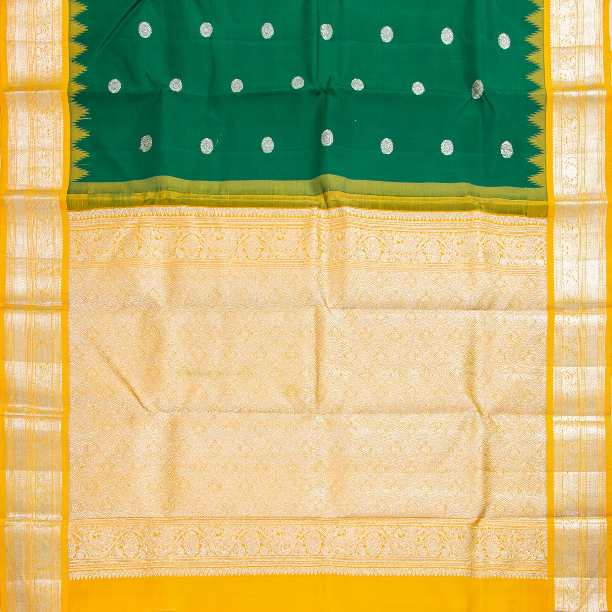 A green and yellow handwoven kanchipuram silk saree in pure silk and pure zari. The body is in green with chakram motifs in silver zari. The korvai yellow temple border has floral and diamond patterns in silver zari. The yellow pallu has traditional patterns in silver zari. The attached yellow blouse has gold zari work matching the borders for the blouse sleeve.