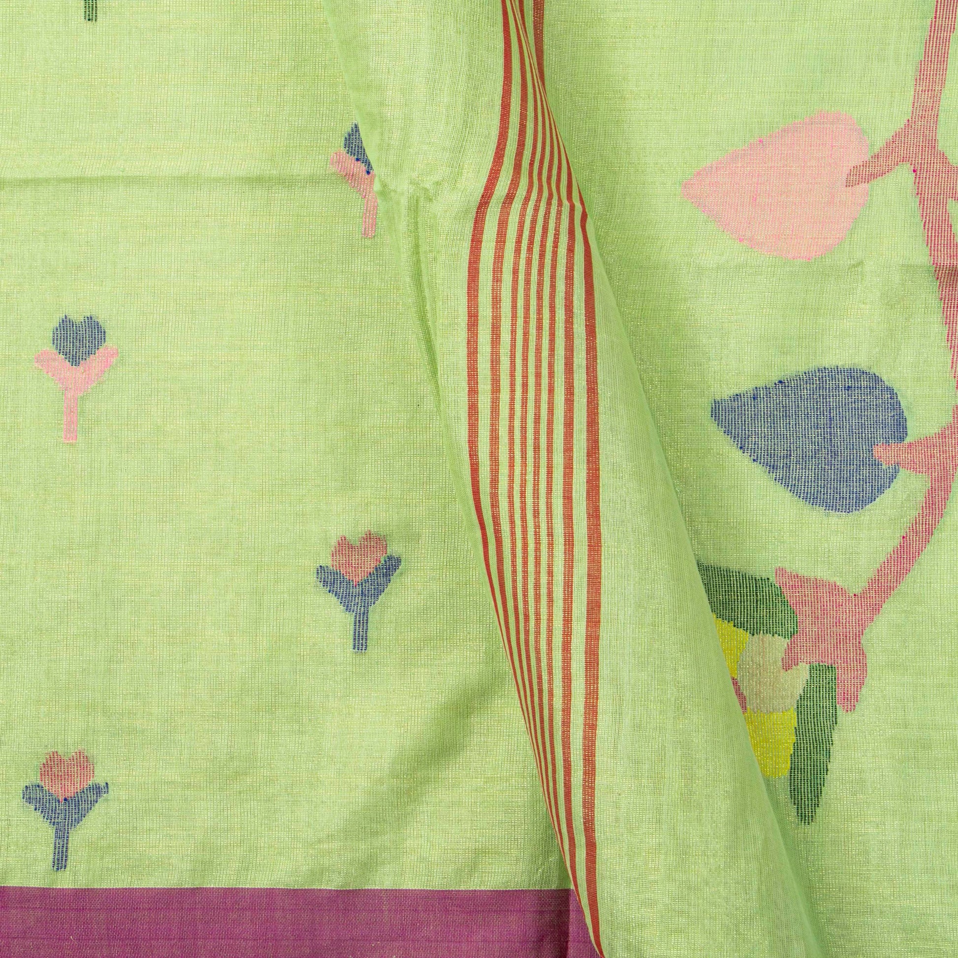 Green dhakai jamdani Khadi mulmul saree with multi colour floral work and attached blouse