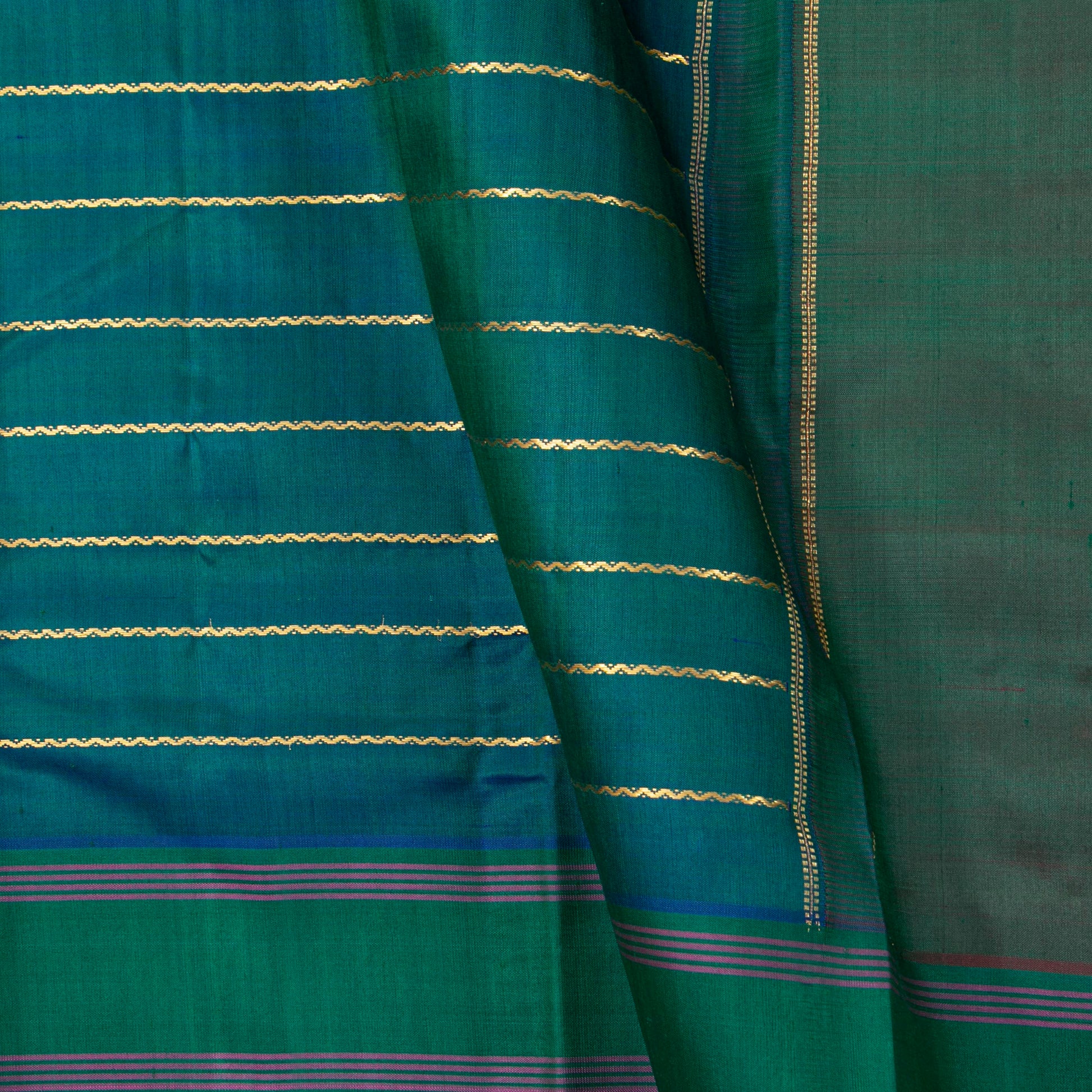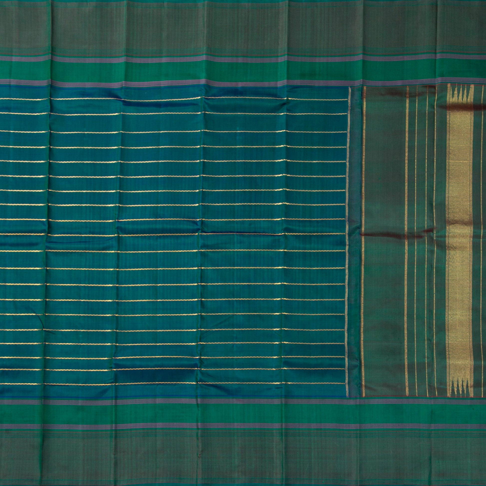 Green kanchipuram silk saree handwoven in pure silk and pure zari. The saree is in a dual shade of green shot blue with veldhari stripes in gold zari all over the body. The border is in green and pallu has thalambu rekku in gold zari.