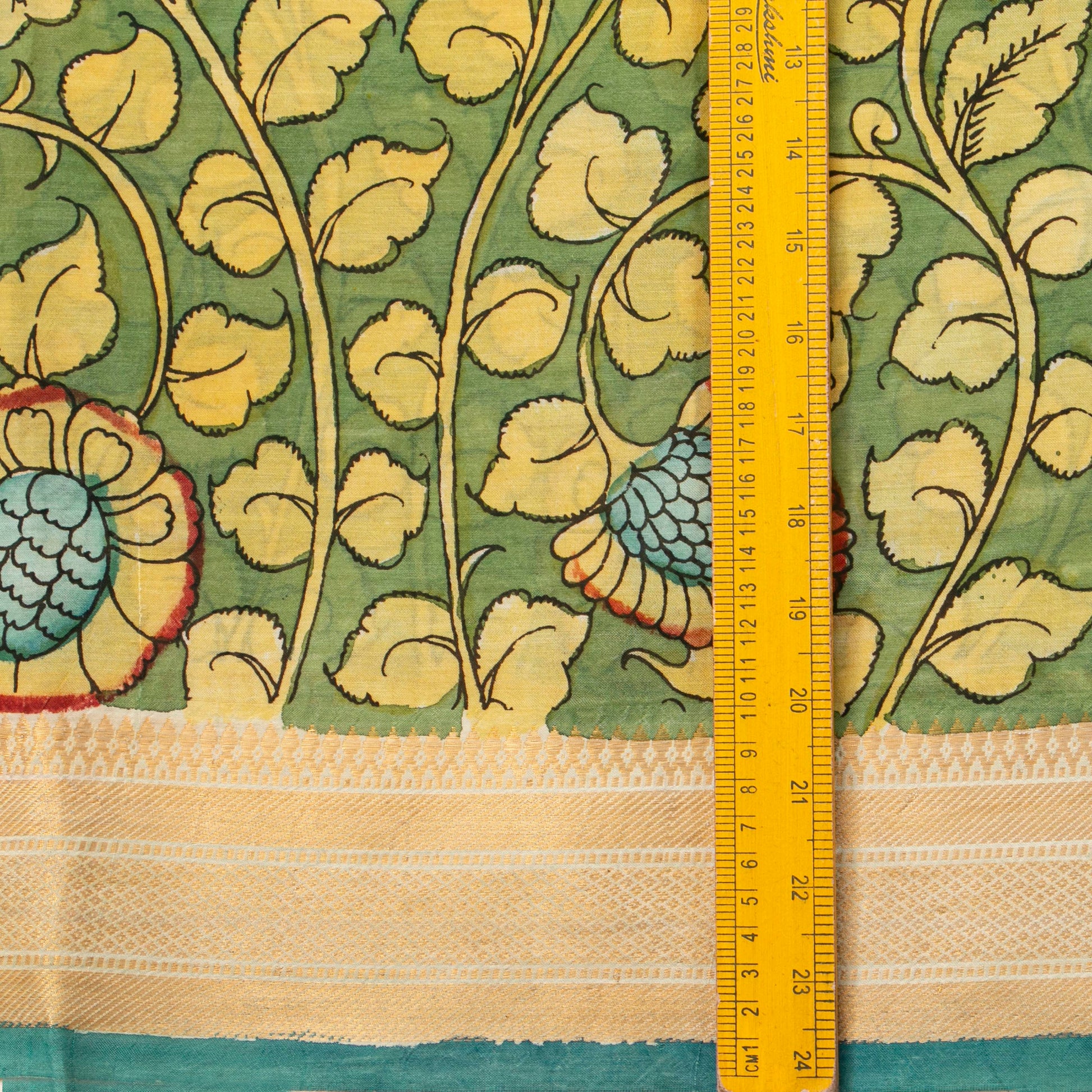 Green handpainted kalamkari silk saree painted with organic vegetable dyes on bangalore silk with gold zari border and attached blouse