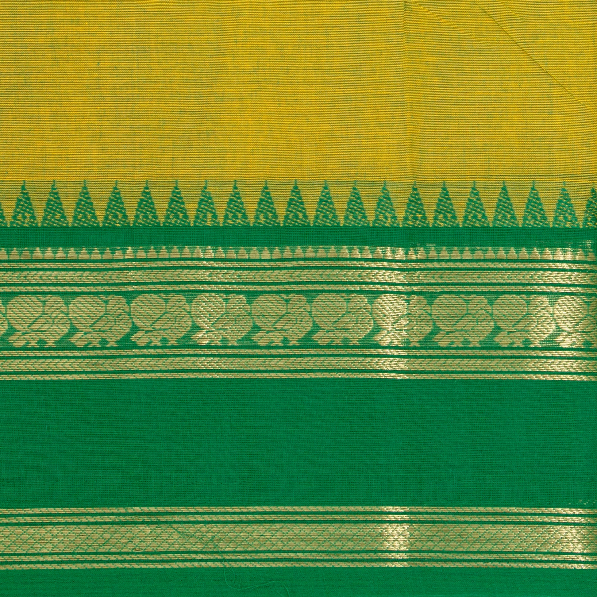 Green kanchi cotton saree with dark green borders on both sides with rich gold zari work and an attached blouse.