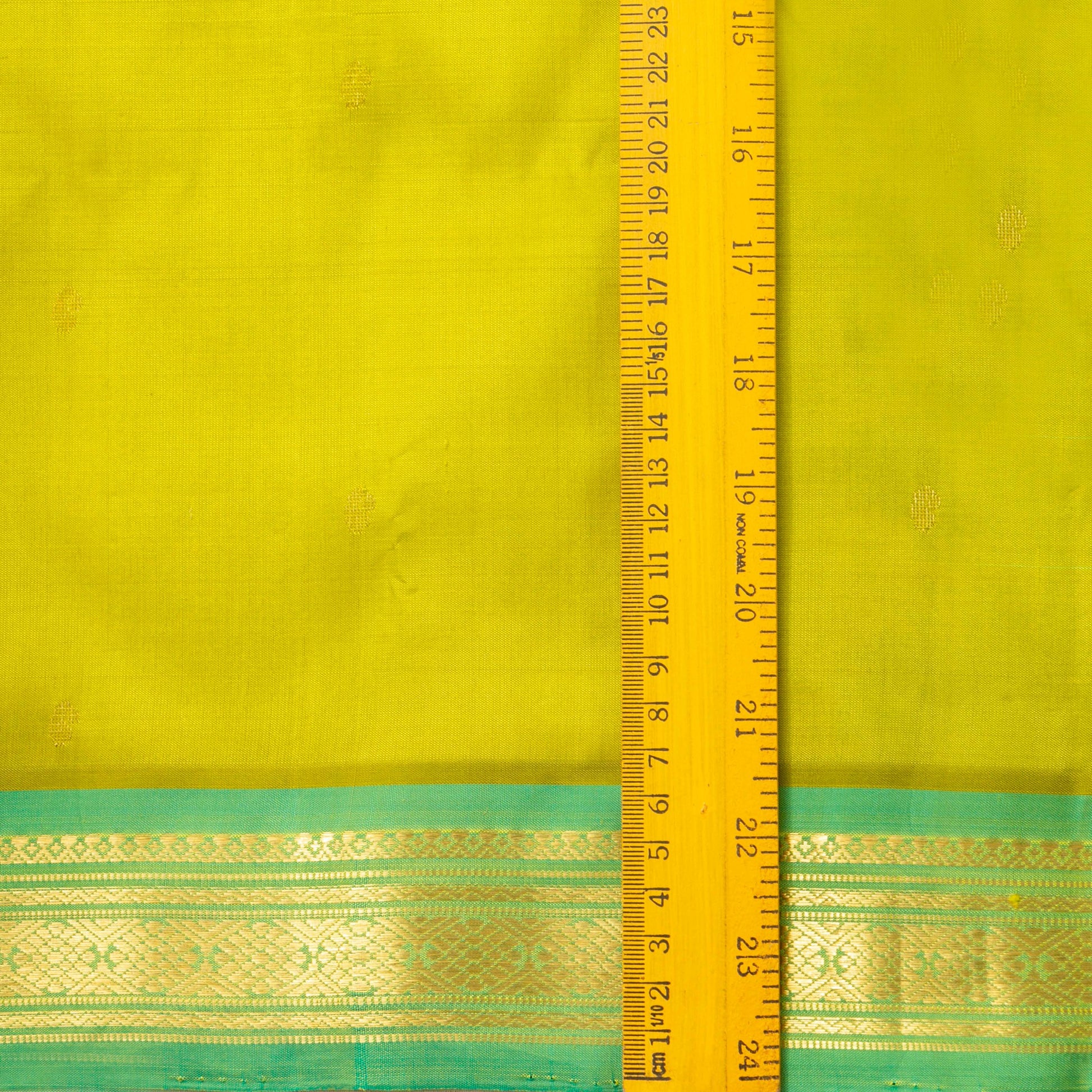 A green original kanchipuram silk saree handwoven in pure silk and pure zari. The body is in green shot yellow with a green border with floral pettu in gold zari. The green pallu has floral pettu in gold zari. The attached blouse is in green with a zari armband matching the sari border.