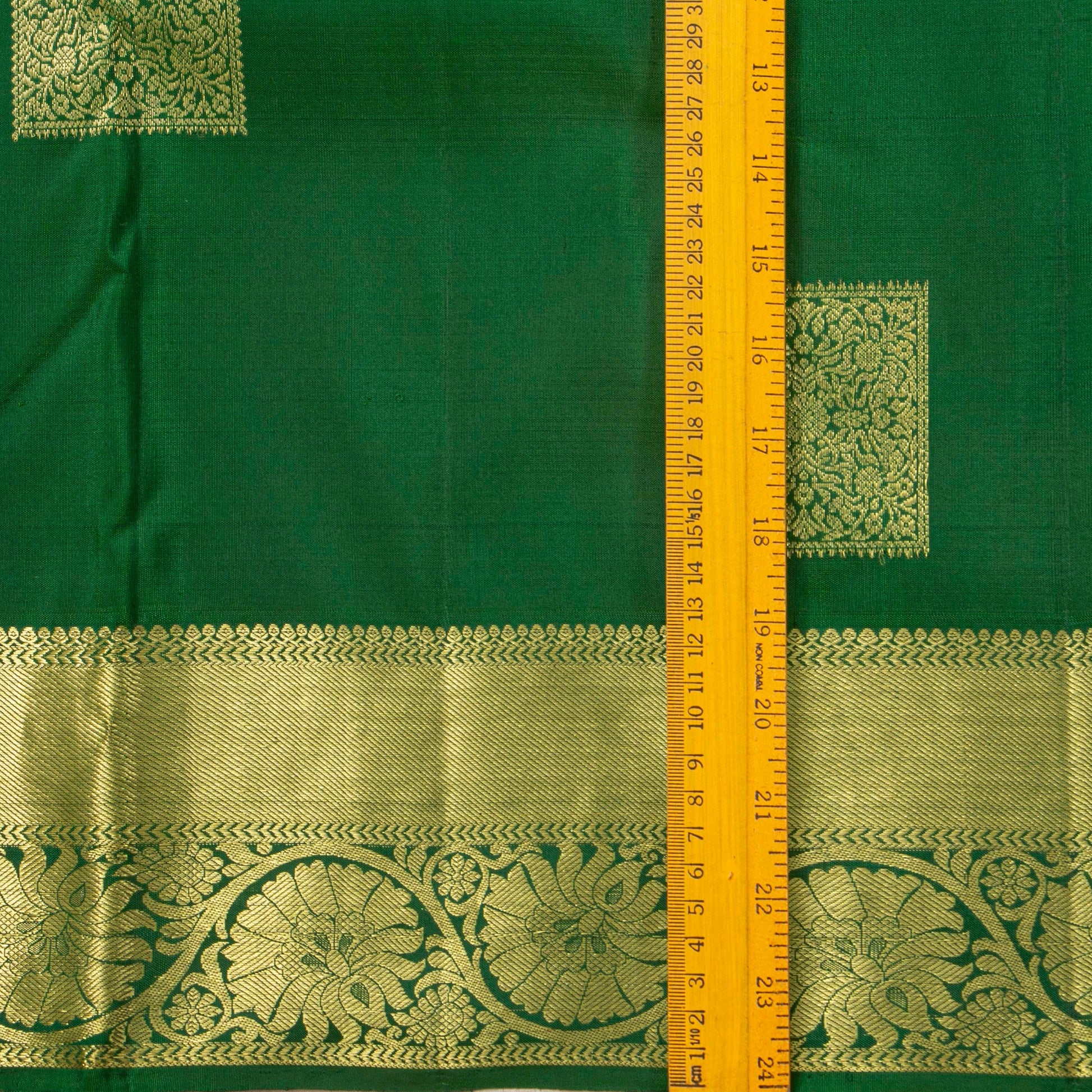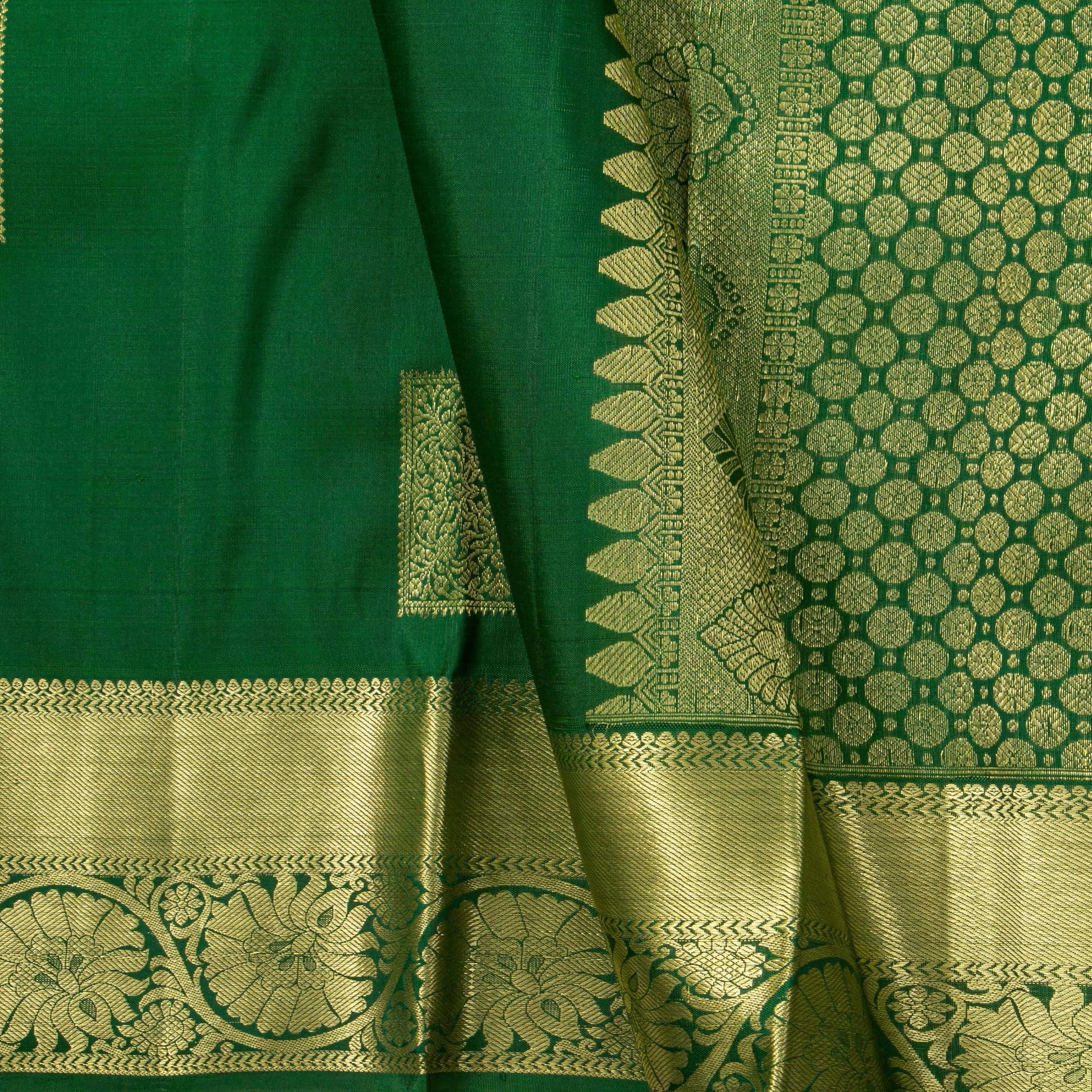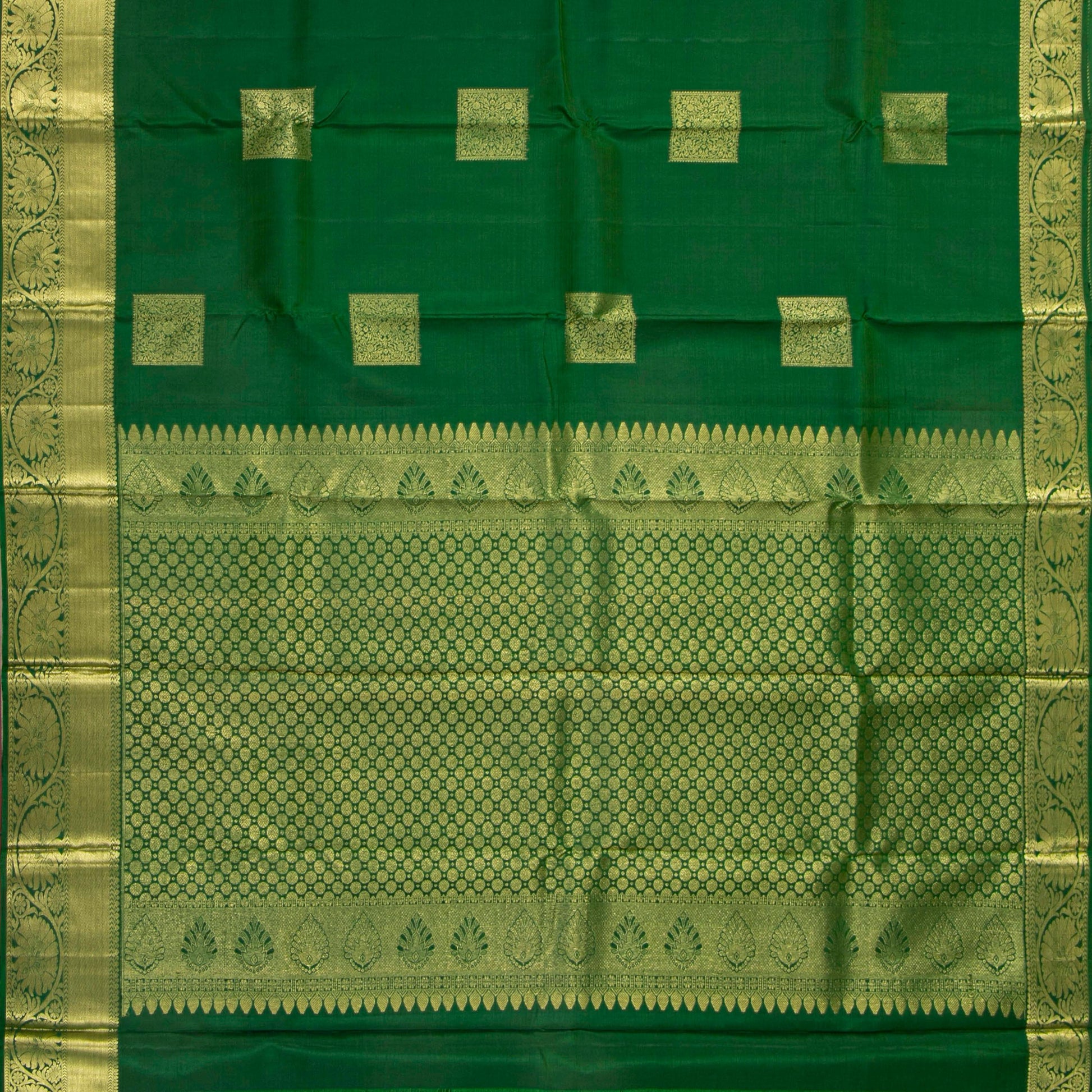 A green kanchipuram silk saree handwoven in pure silk and pure zari . The body is in green with floral patterns in square box with a gold zari. The border has floral patterns in gold zari. The pallu has diamond patterns in gold zari. The attached blouse in green has a zari band matching the saree border.