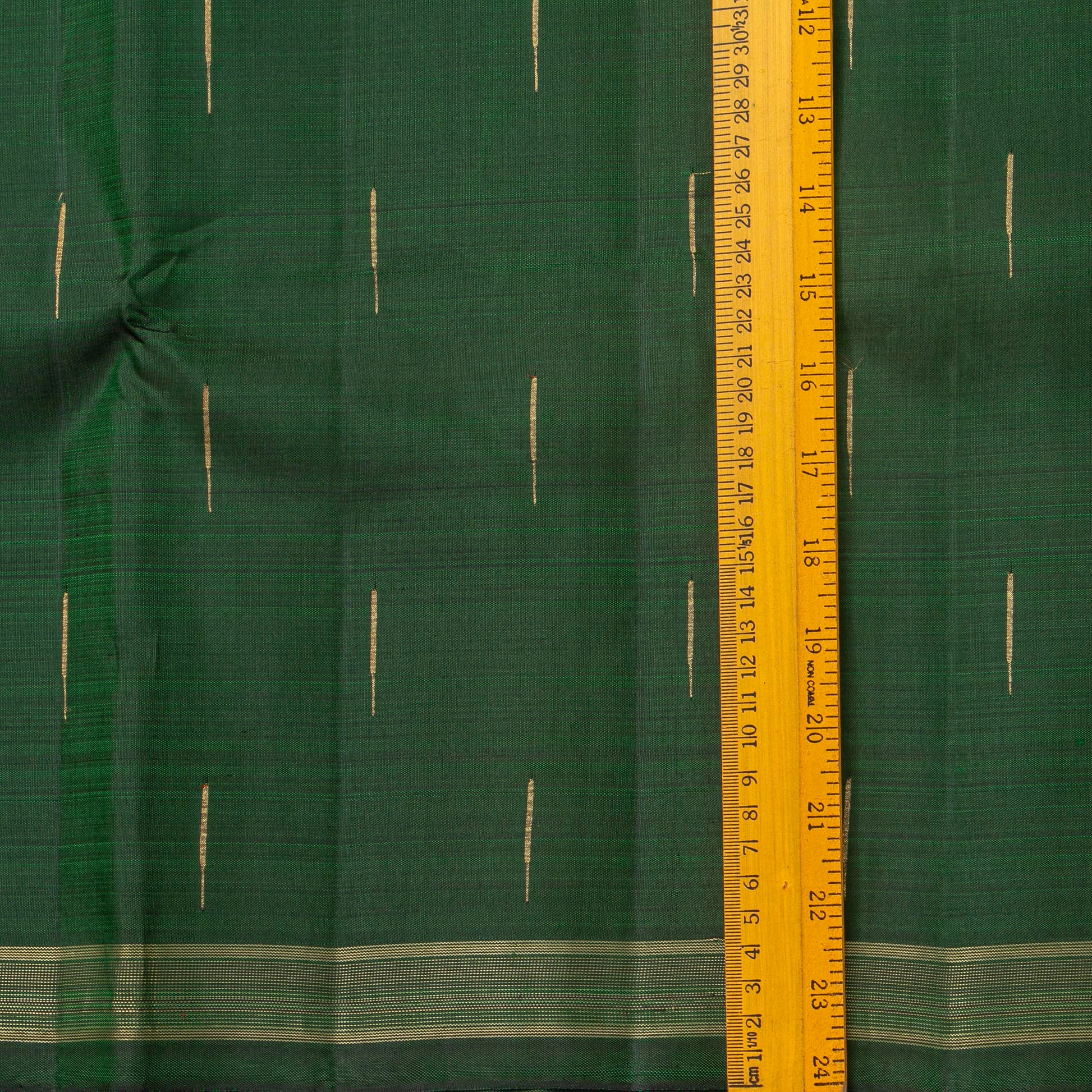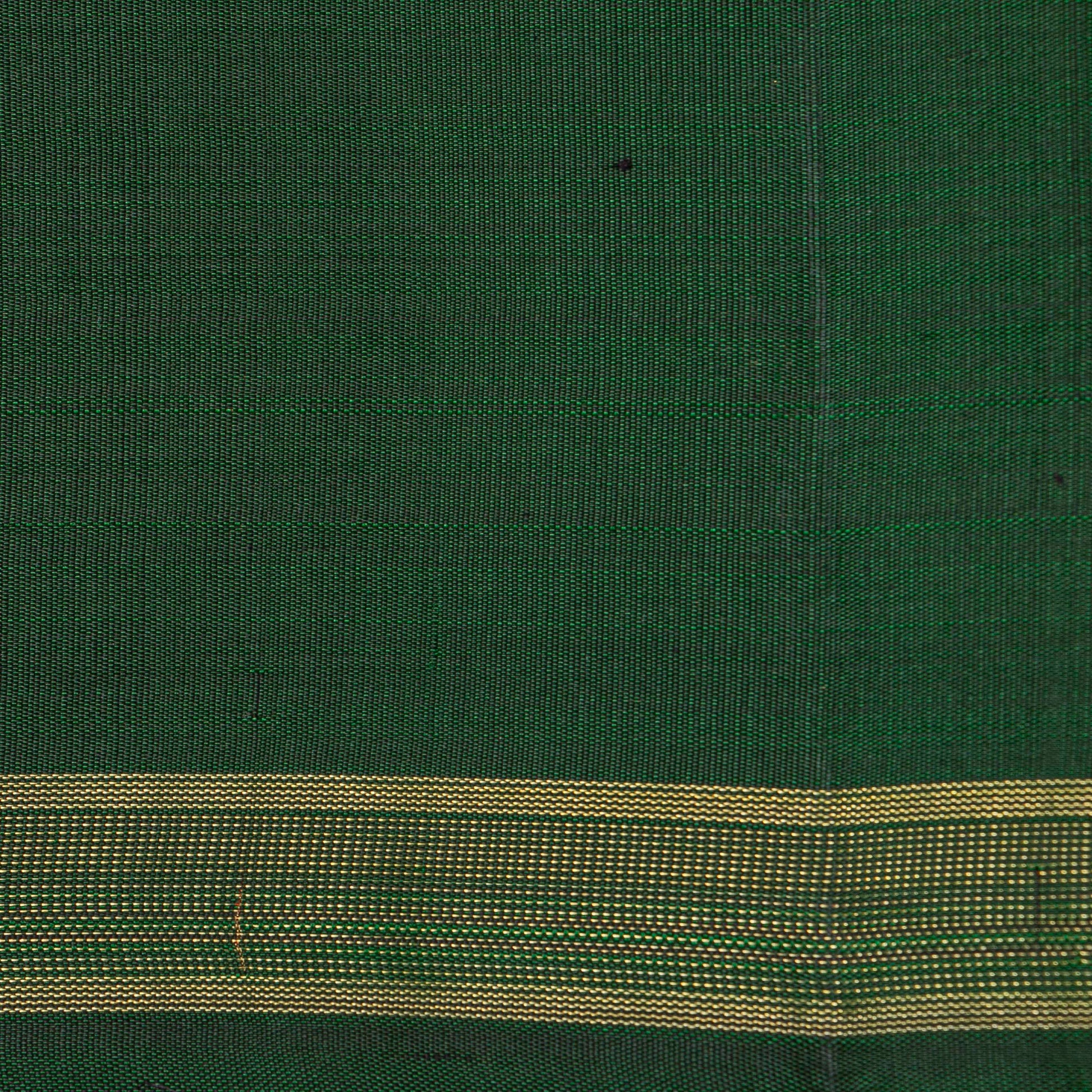 A green original kanchipuram silk saree handwoven in pure silk and pure zari. The body is in green with malli moggu patterns in gold zari and gold zari stripes in the border. The pallu has stripes and bands in gold zari. The attached blouse in green has a zari band matching the saree border.