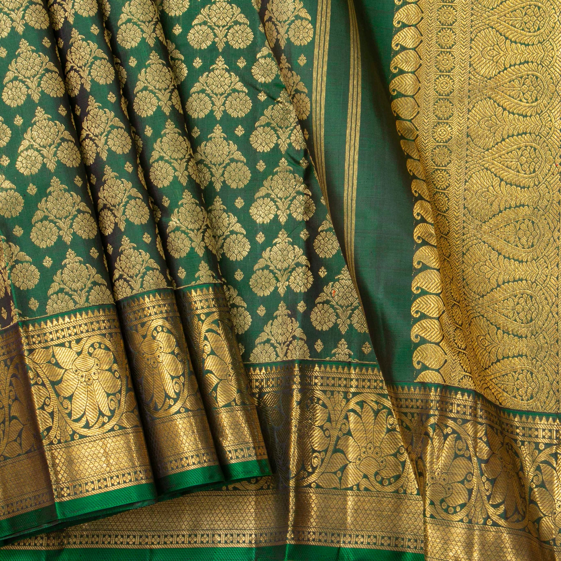 A green handwoven kanchipuram silk saree in pure silk and pure zari. The body is in green with floral motifs in gold zari. The border has floral and diamond pettu in gold zari. The green pallu has paisley, floral and diamond patterns in gold zari. The attached green blouse has gold zari work matching the borders for the blouse sleeve.