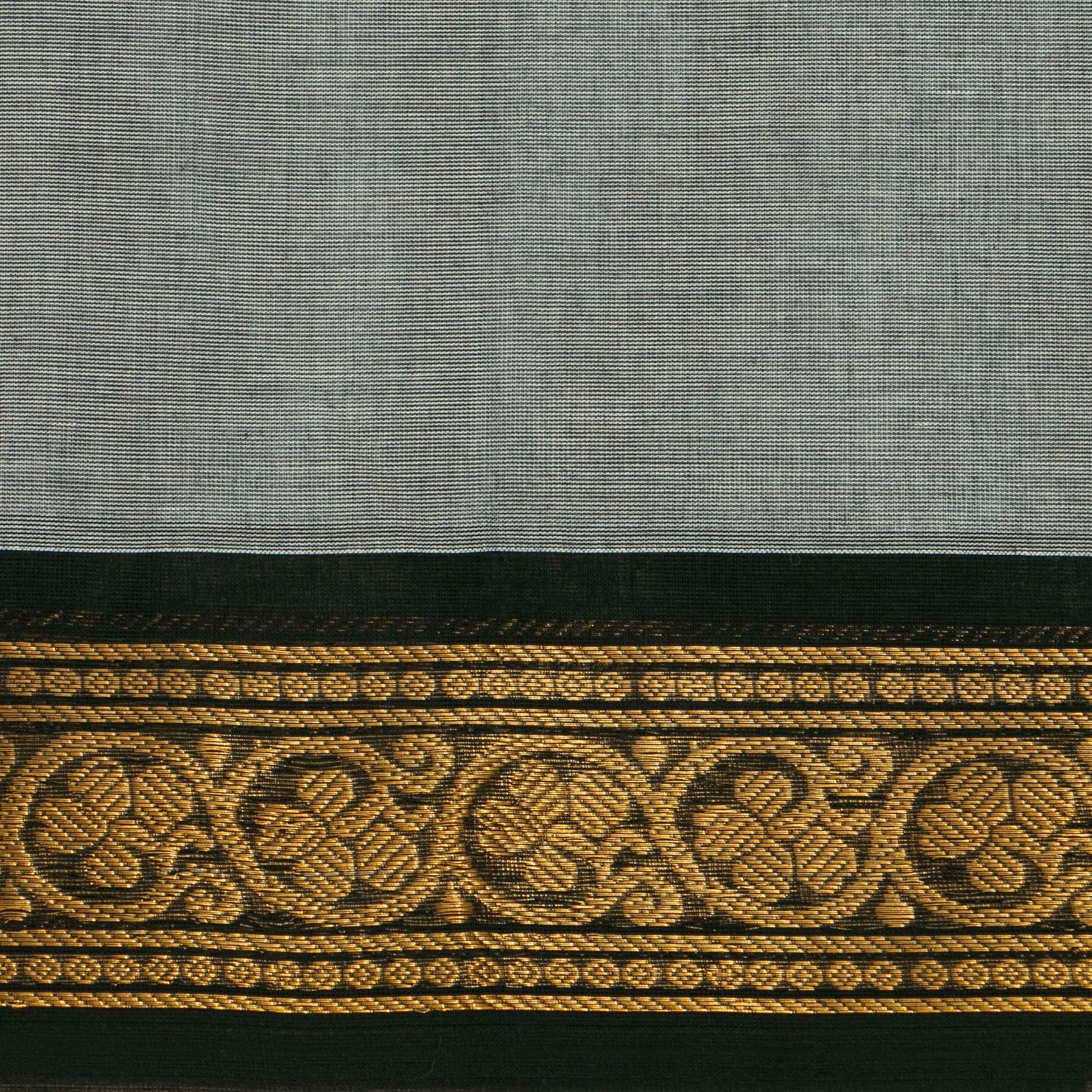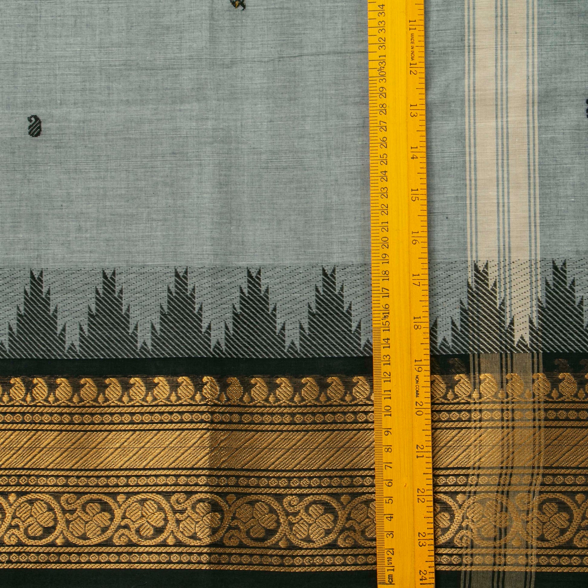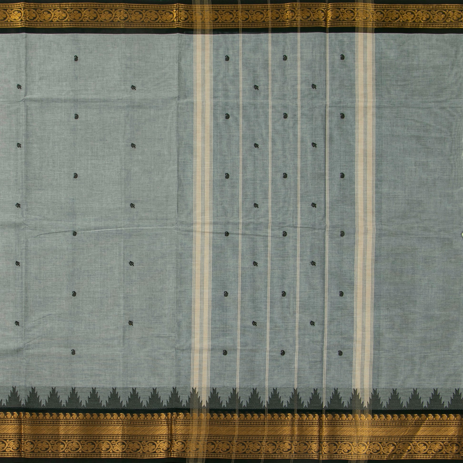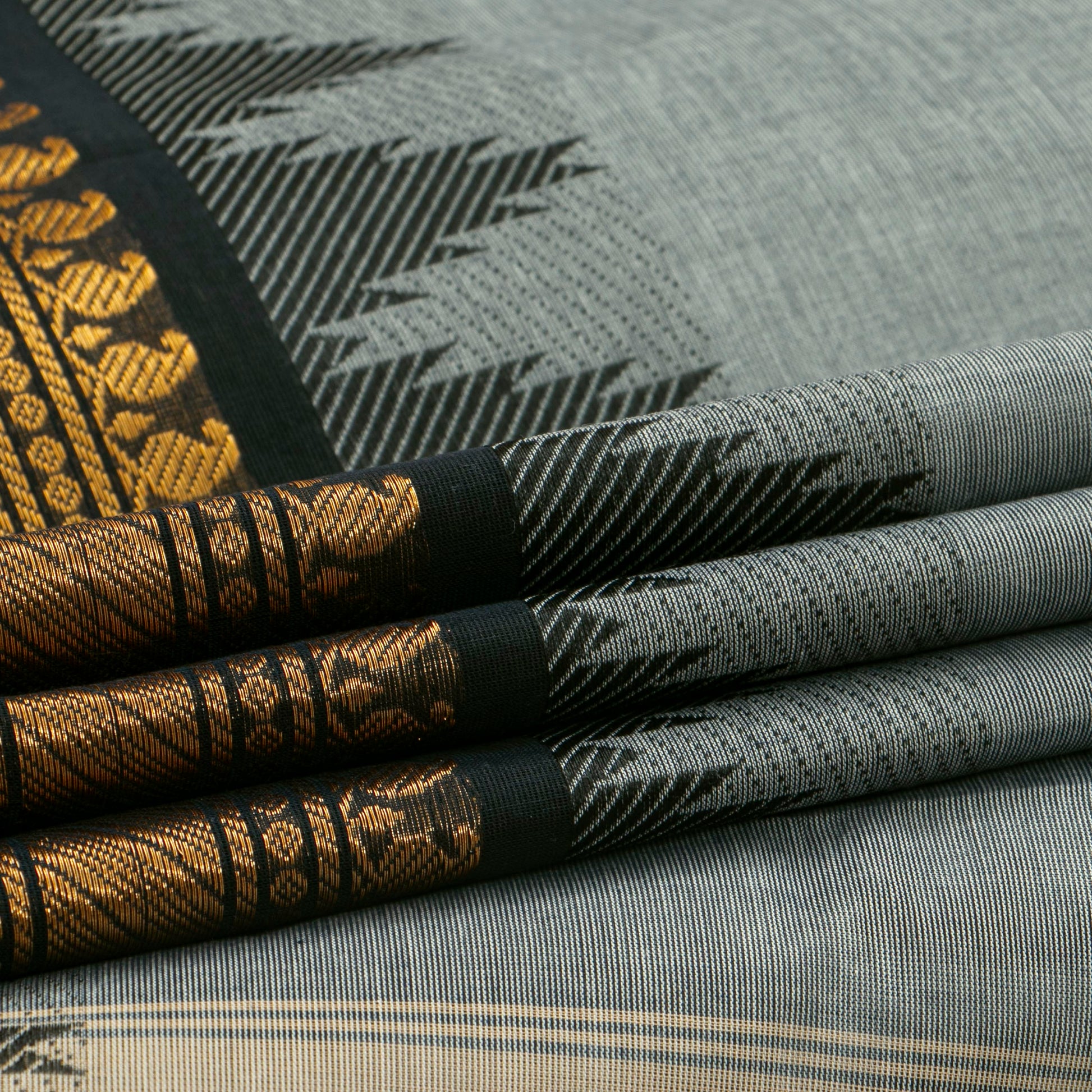 Grey kanchi cotton saree with black border on both sides with rich gold zari work and an attached blouse.