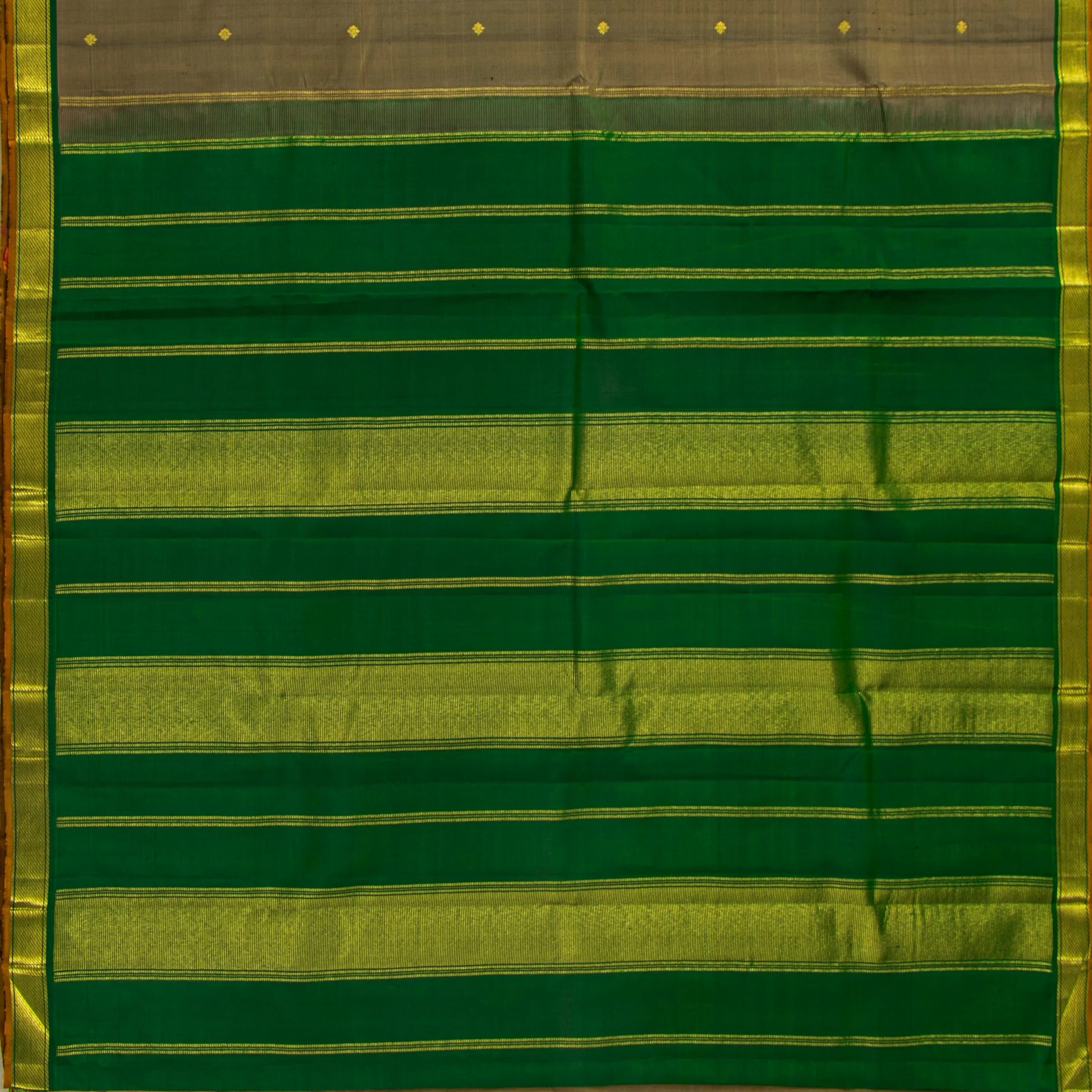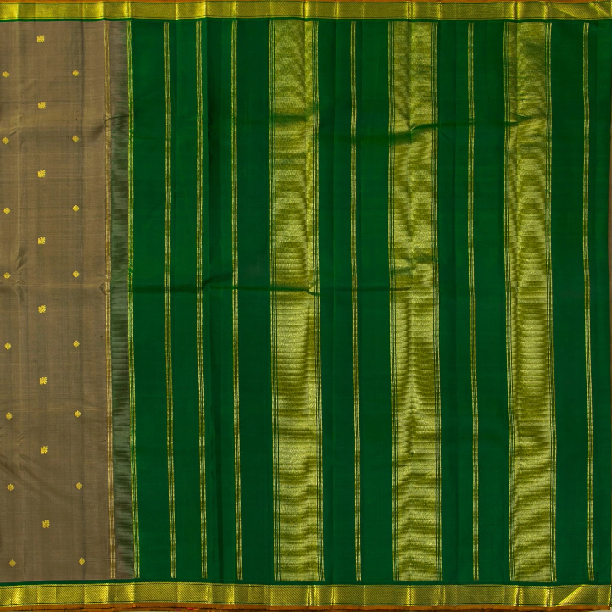 A grey and green kanchipuram silk saree handwoven in pure silk and pure zari . The body is in grey shot with green with floral motifs in gold zari. The green border has banarasi pettu in gold zari with a mustard selvedge. The green pallu has stripes and bands in gold zari. The attached blouse in green has a zari band matching the saree border.