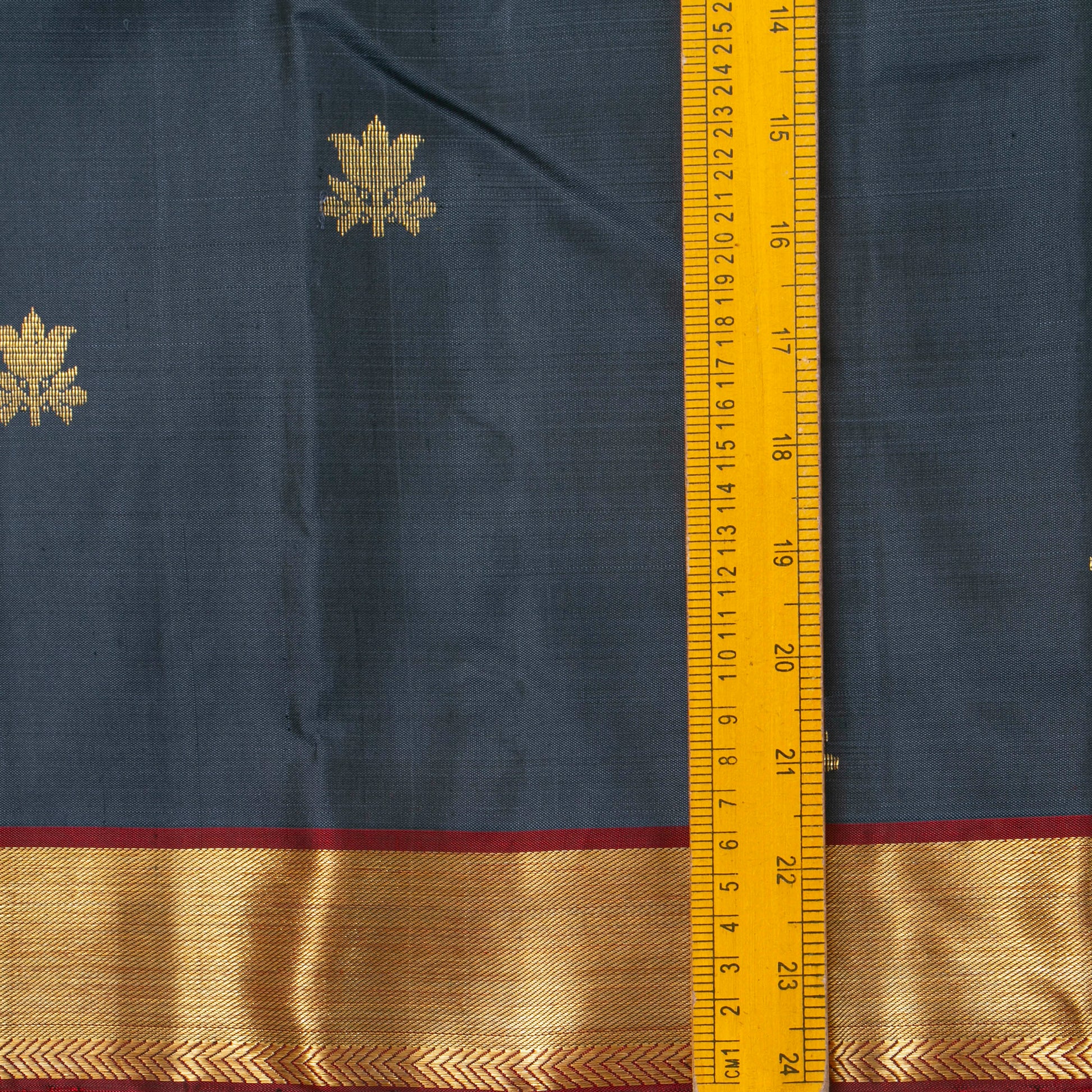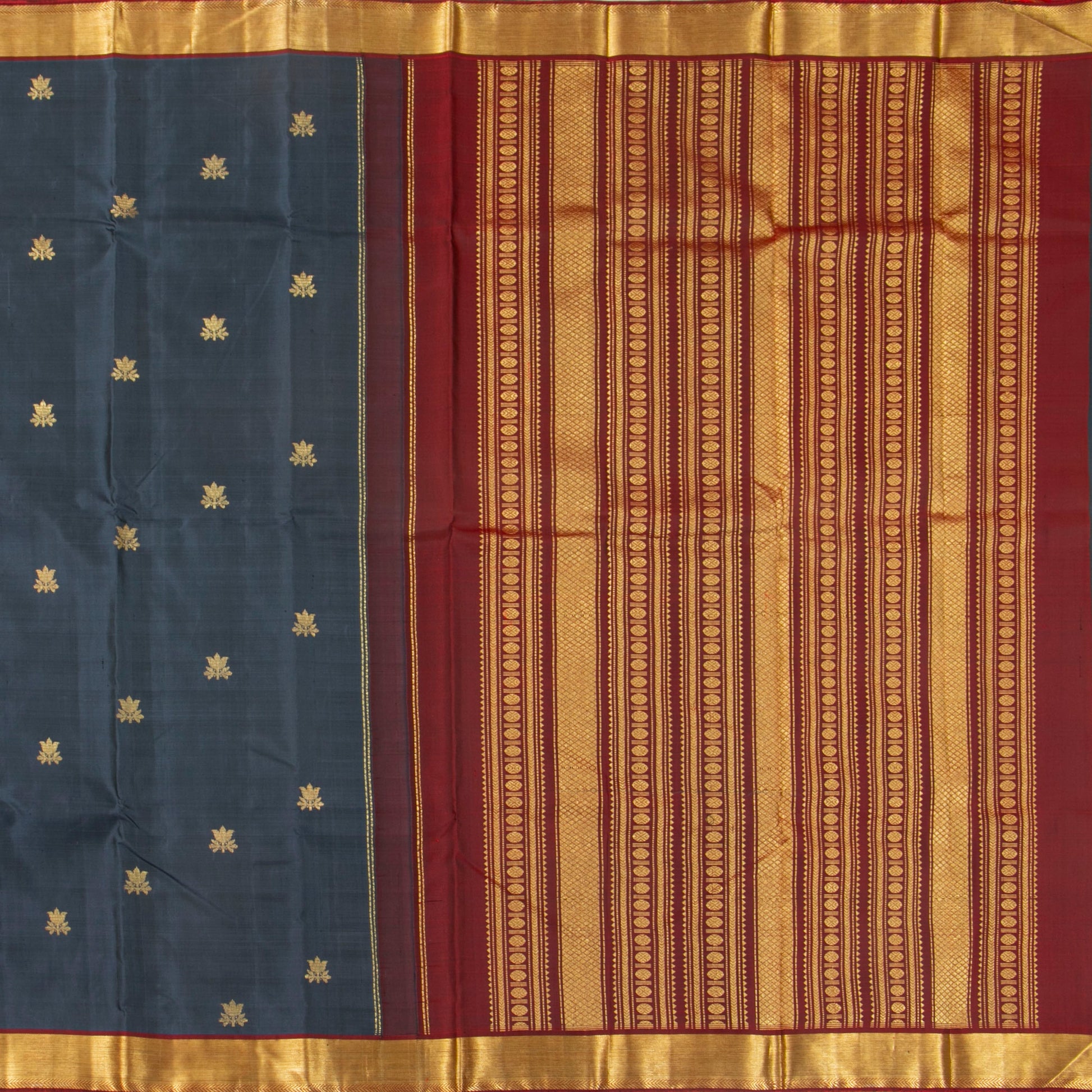 A grey and maroon handwoven kanchipuram silk saree in pure silk and pure zari. The body is in grey with floral motifs in gold zari. The maroon border has banarasi pettu in gold zari. The maroon pallu has traditional patterns in gold zari. The attached maroon blouse has gold zari work matching the borders for the blouse sleeve.