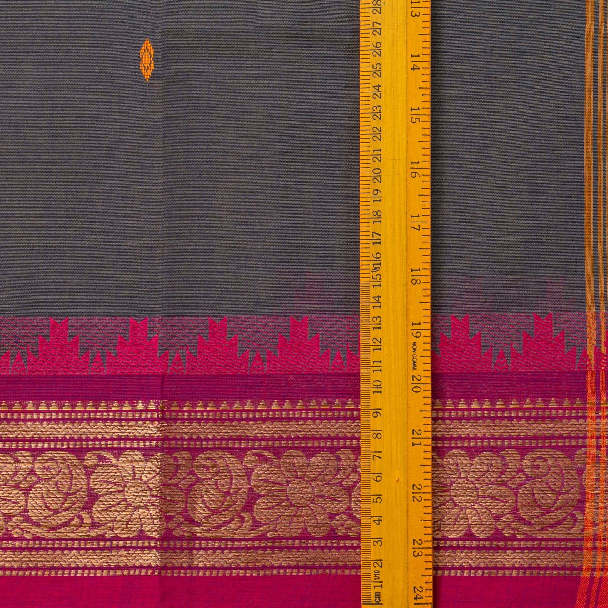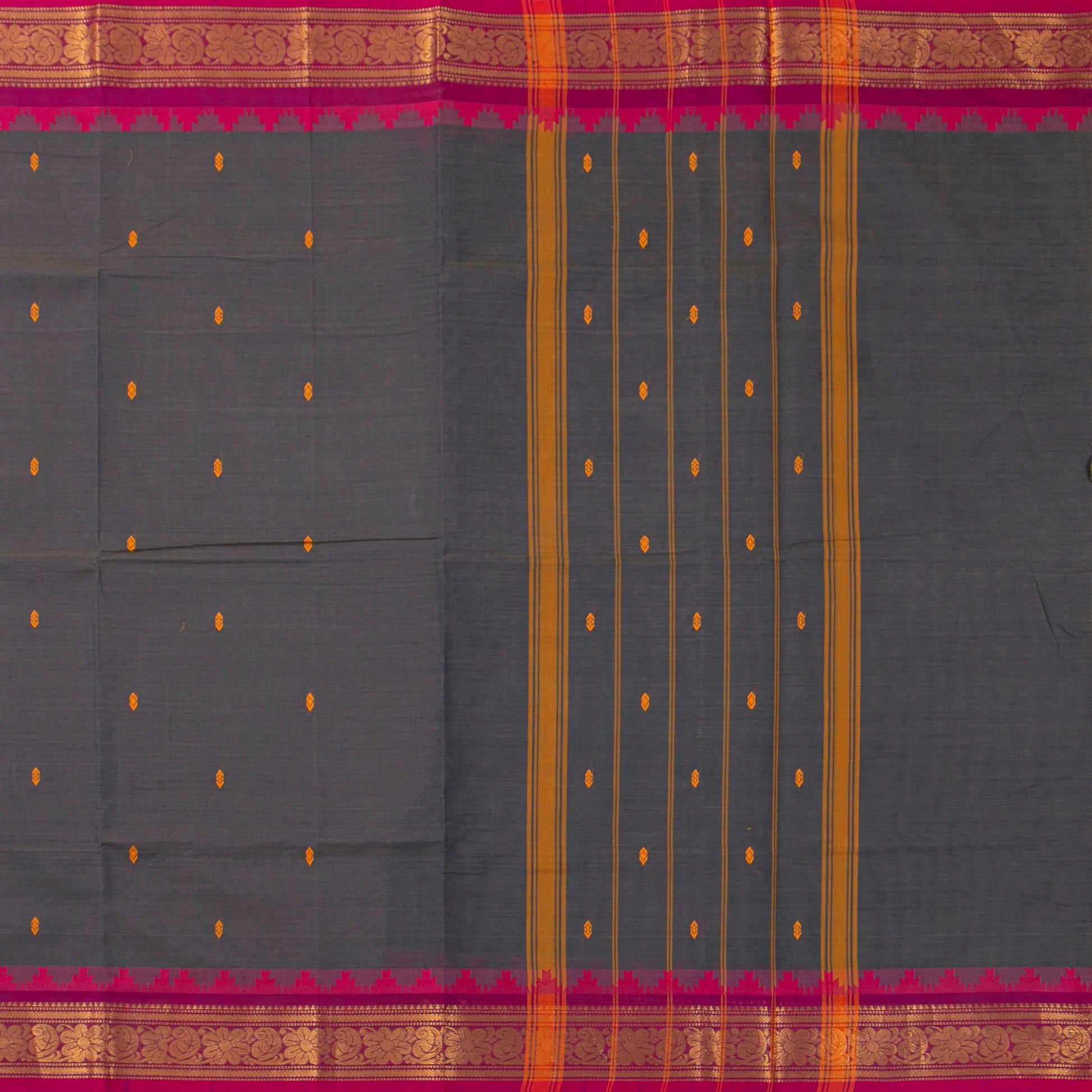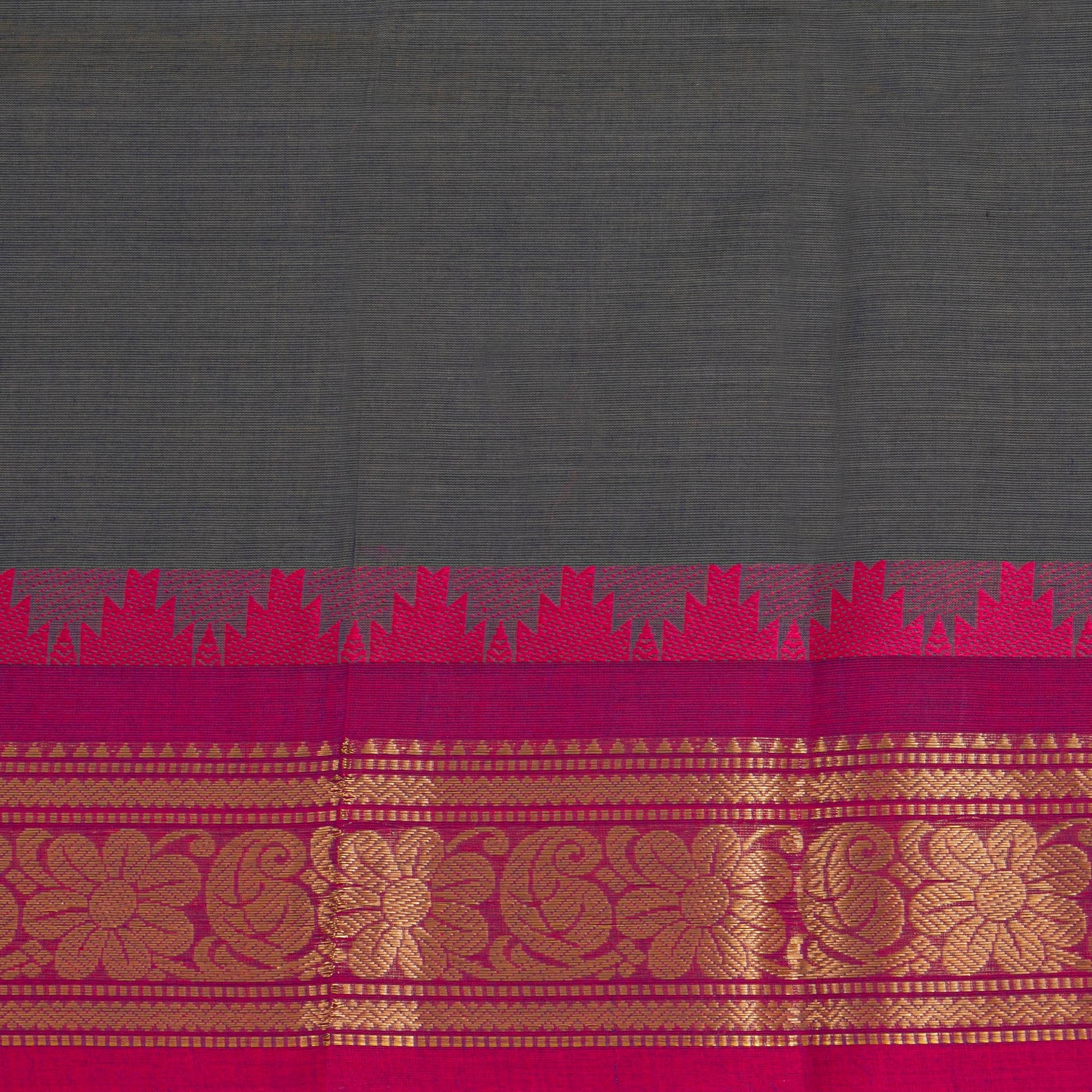 Grey kanchi cotton saree with a pink border with gold zari work and attached blouse.