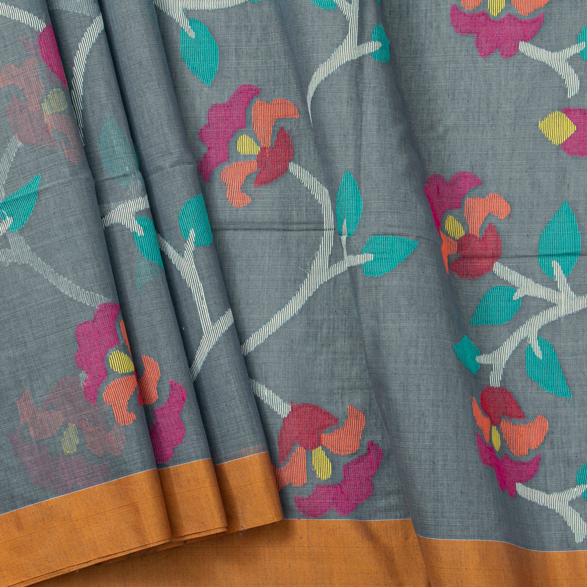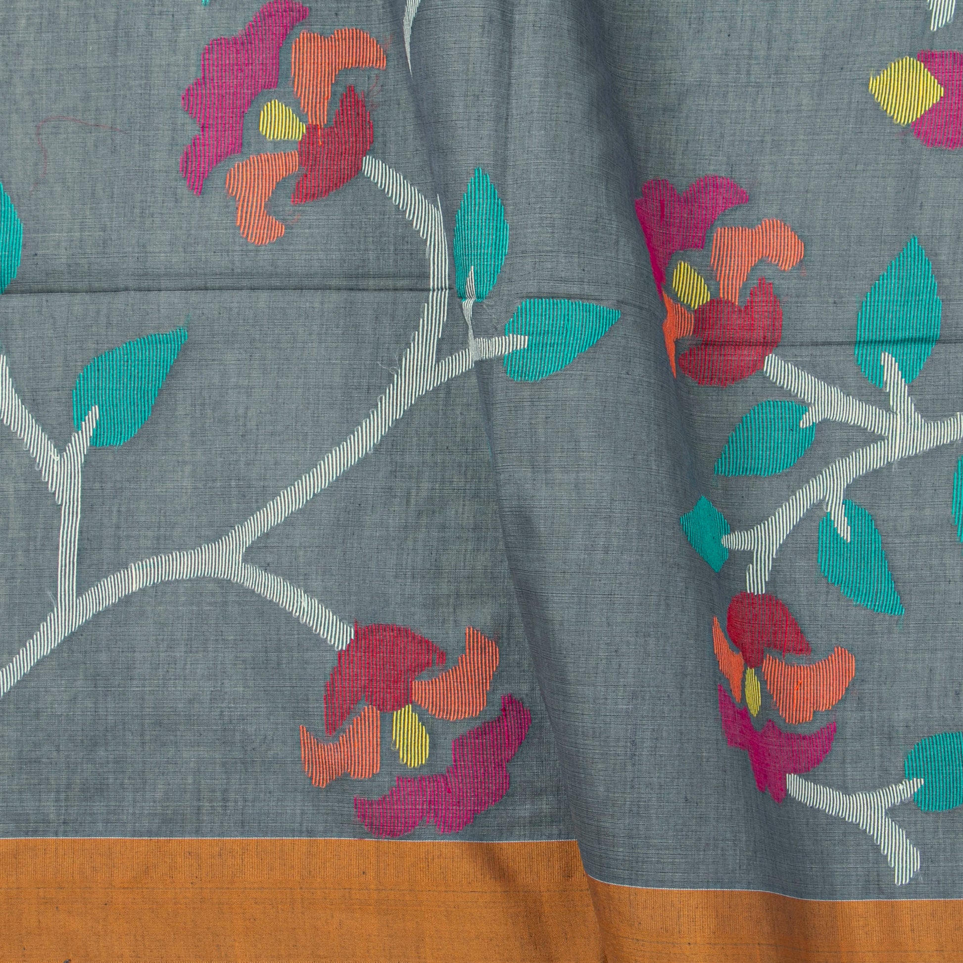 Grey dhakai jamdani mulmul silk saree with multi colour floral work and attached blouse.