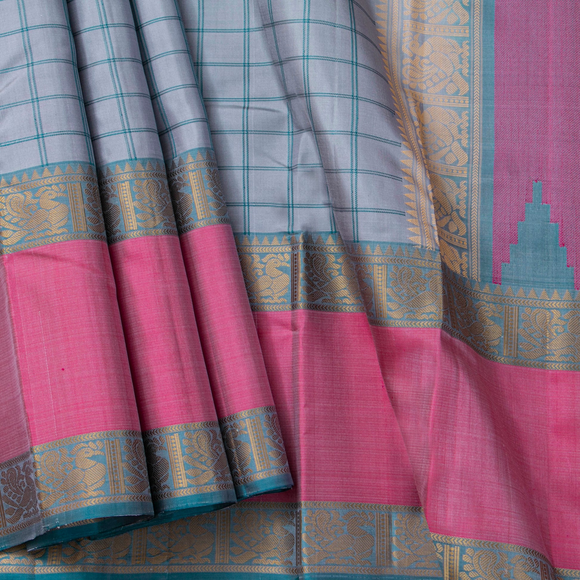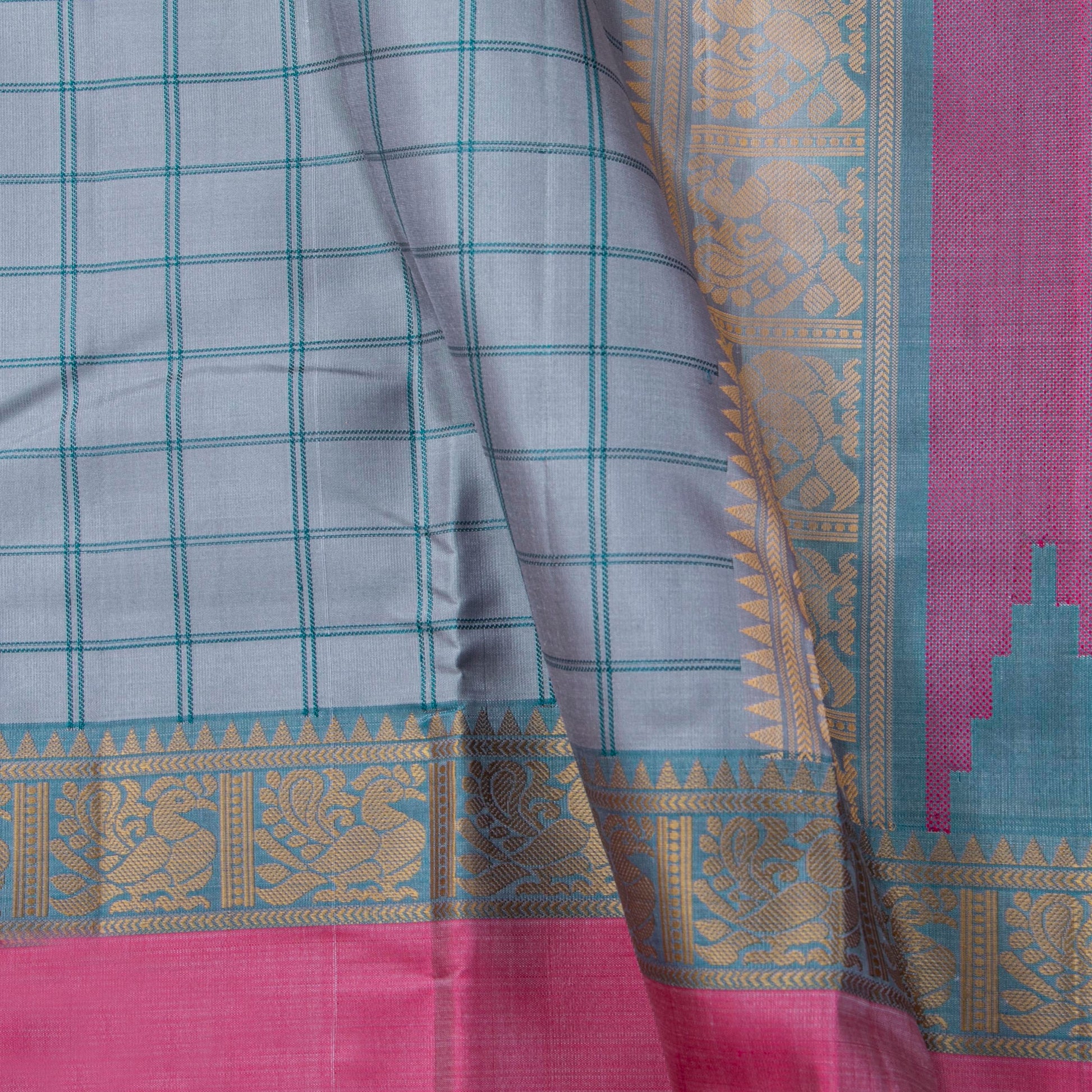 A grey original kanchipuram no zari silk saree handwoven in pure silk. The body is in grey with checks in blue lines. The blue rettai pettu border has peacock pettu in beige silk thread and a pink band. The pallu has peacock pettu and traditional patterns in silk thread. The attached blouse in blue has an arm band matching the saree borders.