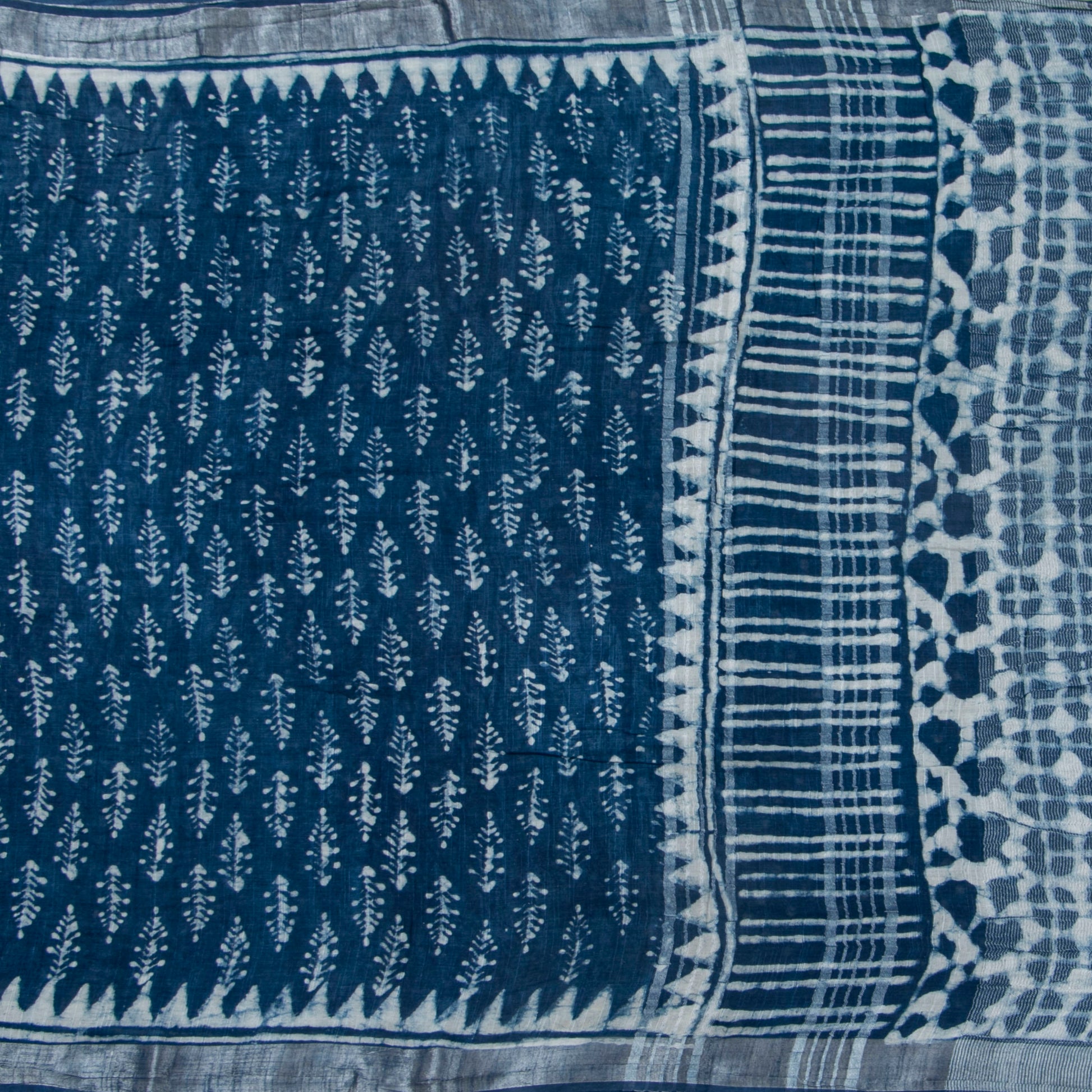Indigo blue handwoven linen saree with floral patterns and a silver zari border with attached blouse