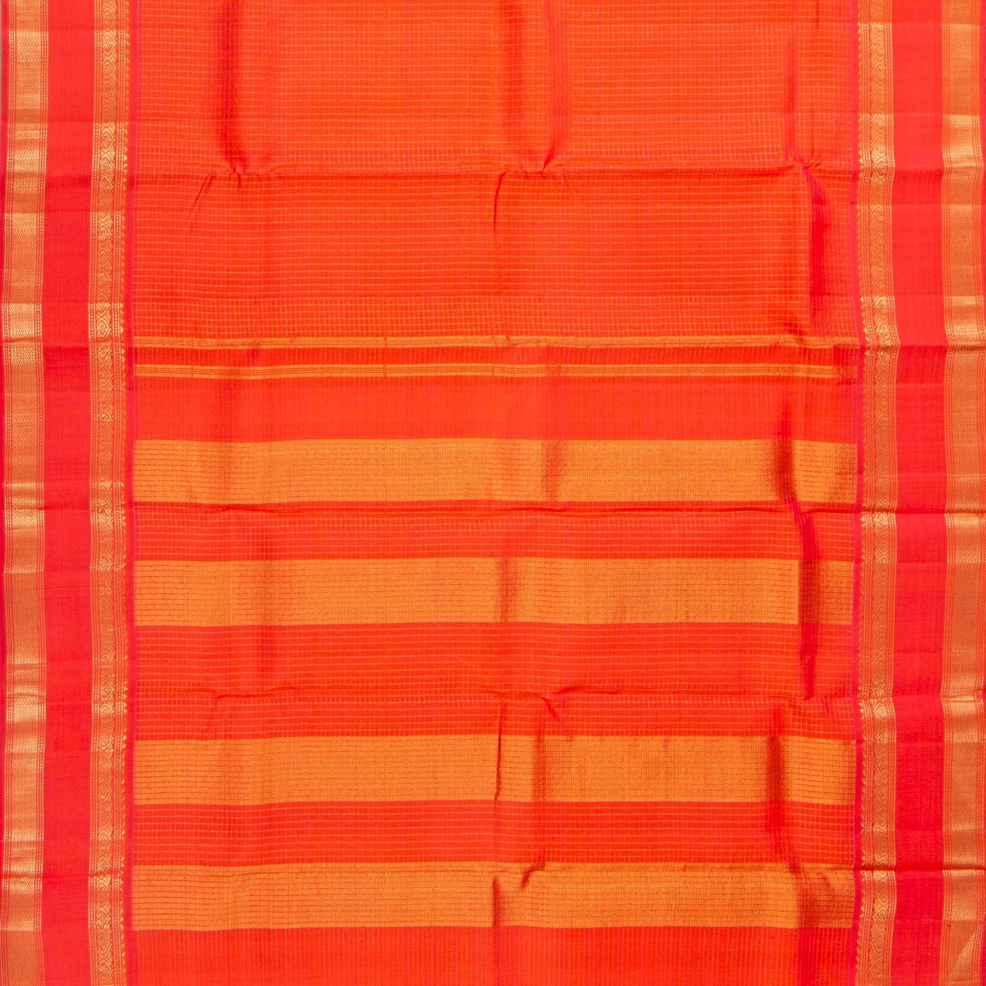 A kanakambaram orange handwoven kanchipuram silk saree in pure silk and pure zari. The body is in kanakambaram orange with checks in gold zari. The rettai pettu border has floral and diamond pettu in gold zari. The pallu has stripes and bands in gold zari. The attached orange blouse has gold zari work matching the borders for the blouse sleeve.