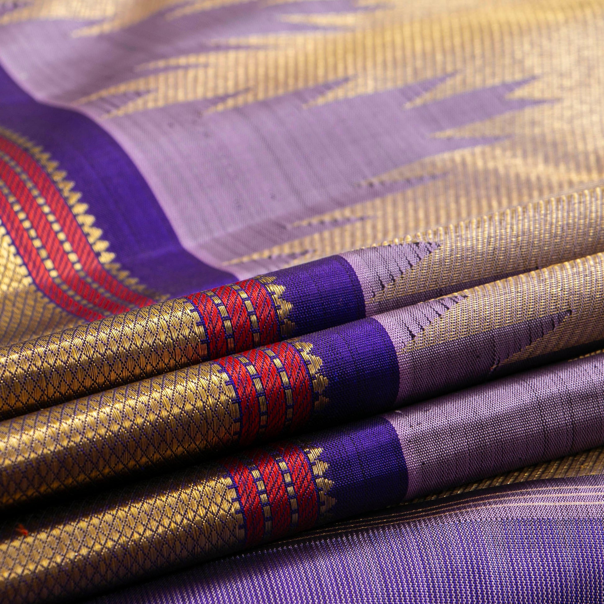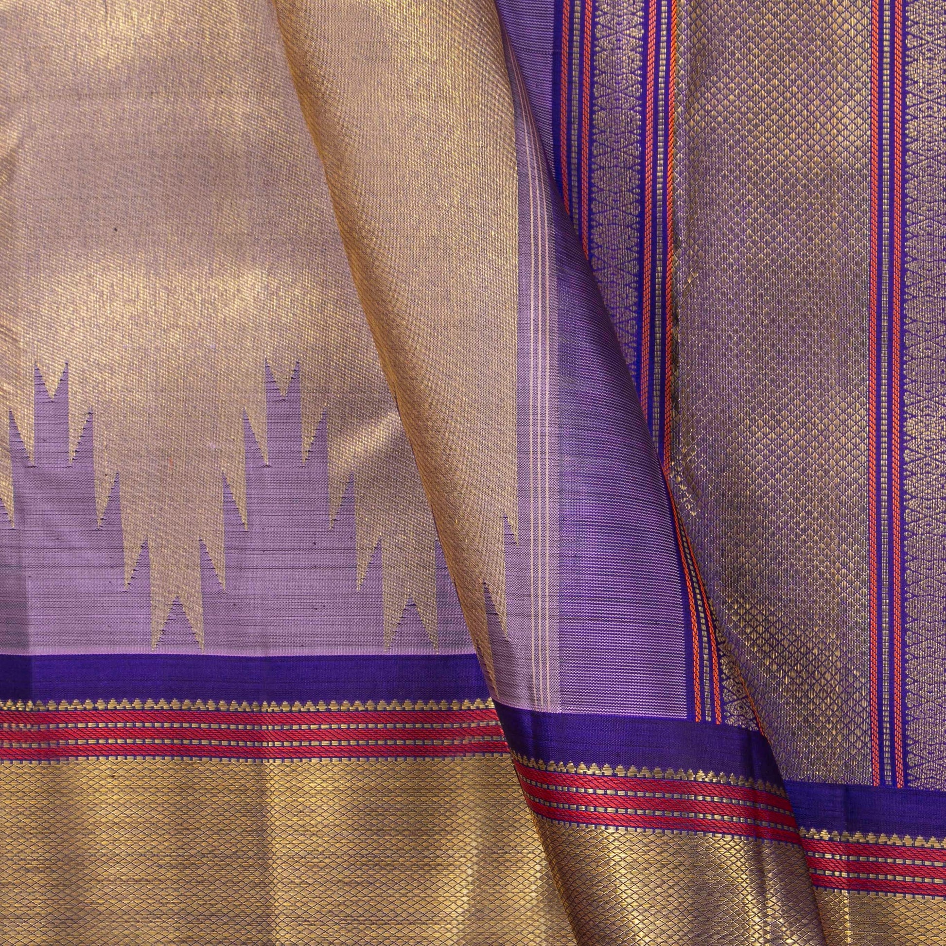 A lavender and blue kanchipuram silk saree handwoven in pure silk and pure zari . The body is in lavender with gold zari work all over and a temple relief border design for a blue contrast border having maroon bands and gold zari work in diamond designs. The blue pallu has rich traditional designs with diamond motifs and the blue blouse has a zari armband matching the saree border.