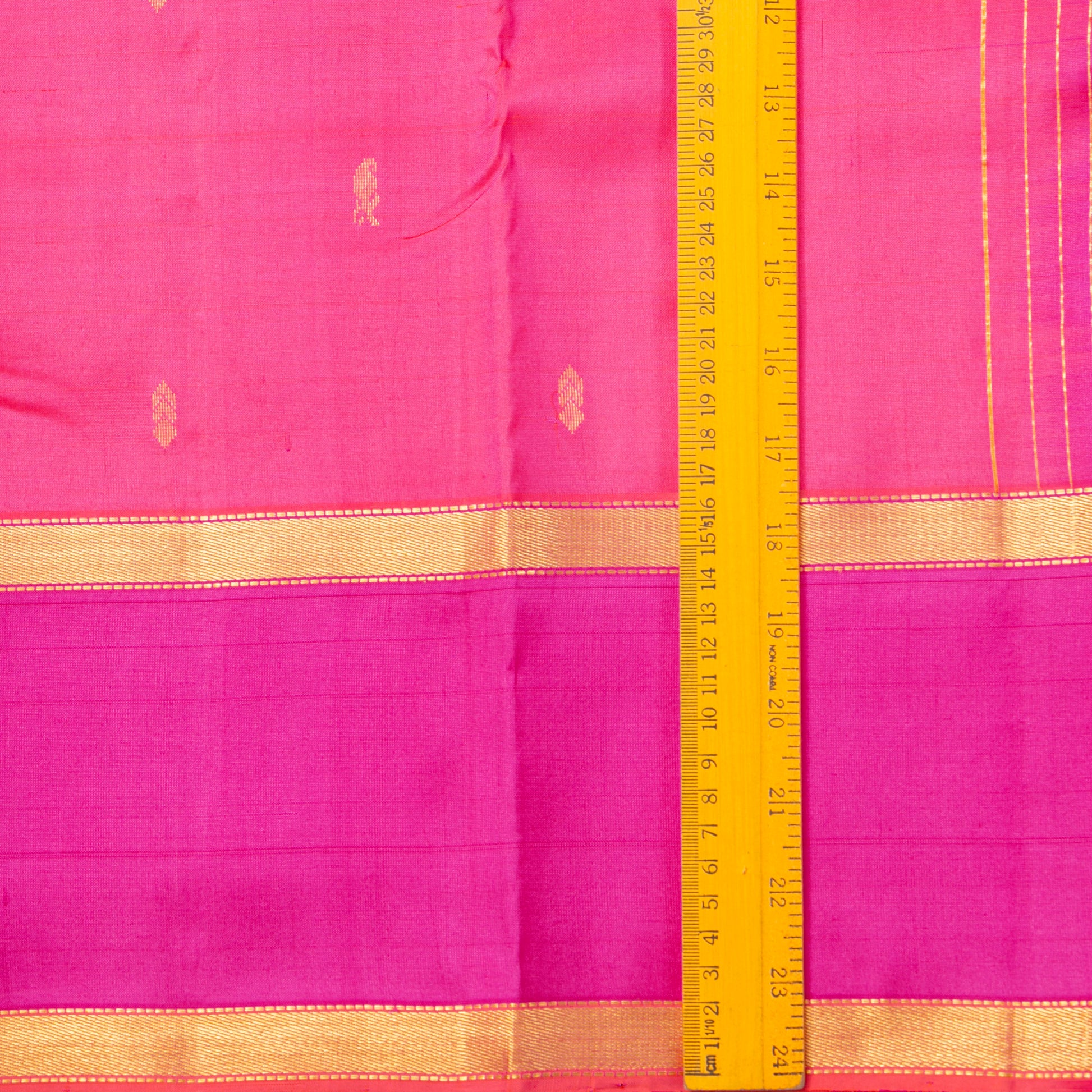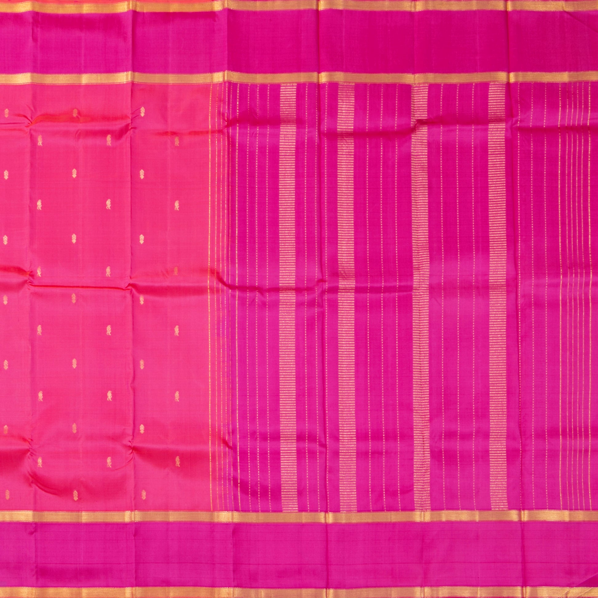 A pink kanchipuram silk saree handwoven in pure silk and pure zari, with a lotus pink body having gold zari buttas and a dark pink borders with gold zari bands and a dark pink pallu with muthu kattam vari stripes and a blouse in pink with zari arm bands matching the saree border.