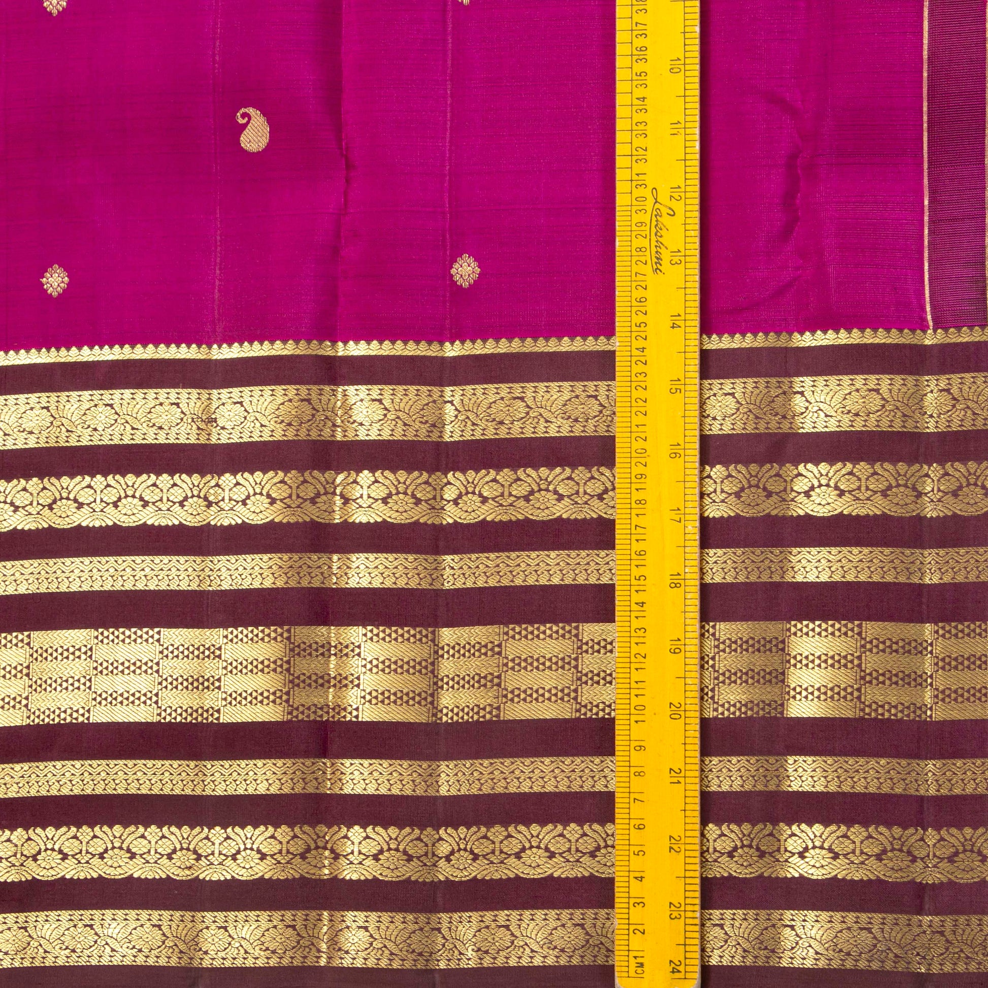An authentic magenta and brown kanchipuram silk saree handwoven in pure silk with silk mark certificate. The body is in magenta with paisley motifs in gold zari. The brown border has traditional patterns in gold zari. The brown pallu has paisley motifs in gold zari. The blouse in brown has a zari arm band for the sleeve matching the saree border.