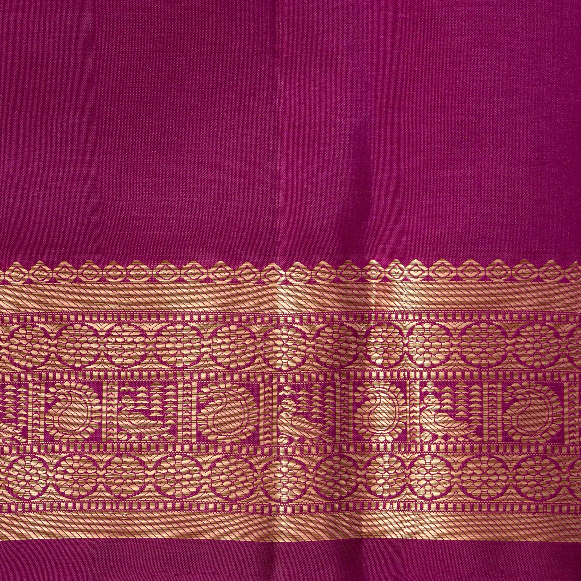 Magenta kanchipuram silk saree handwoven in pure silk. The body is in magenta with floral bhuttas in gold zari. The border has peacock, floral and paisley motifs in gold zari. The pallu has floral patterns in gold zari. The attached blouse is in magenta with armband matching the saree border.