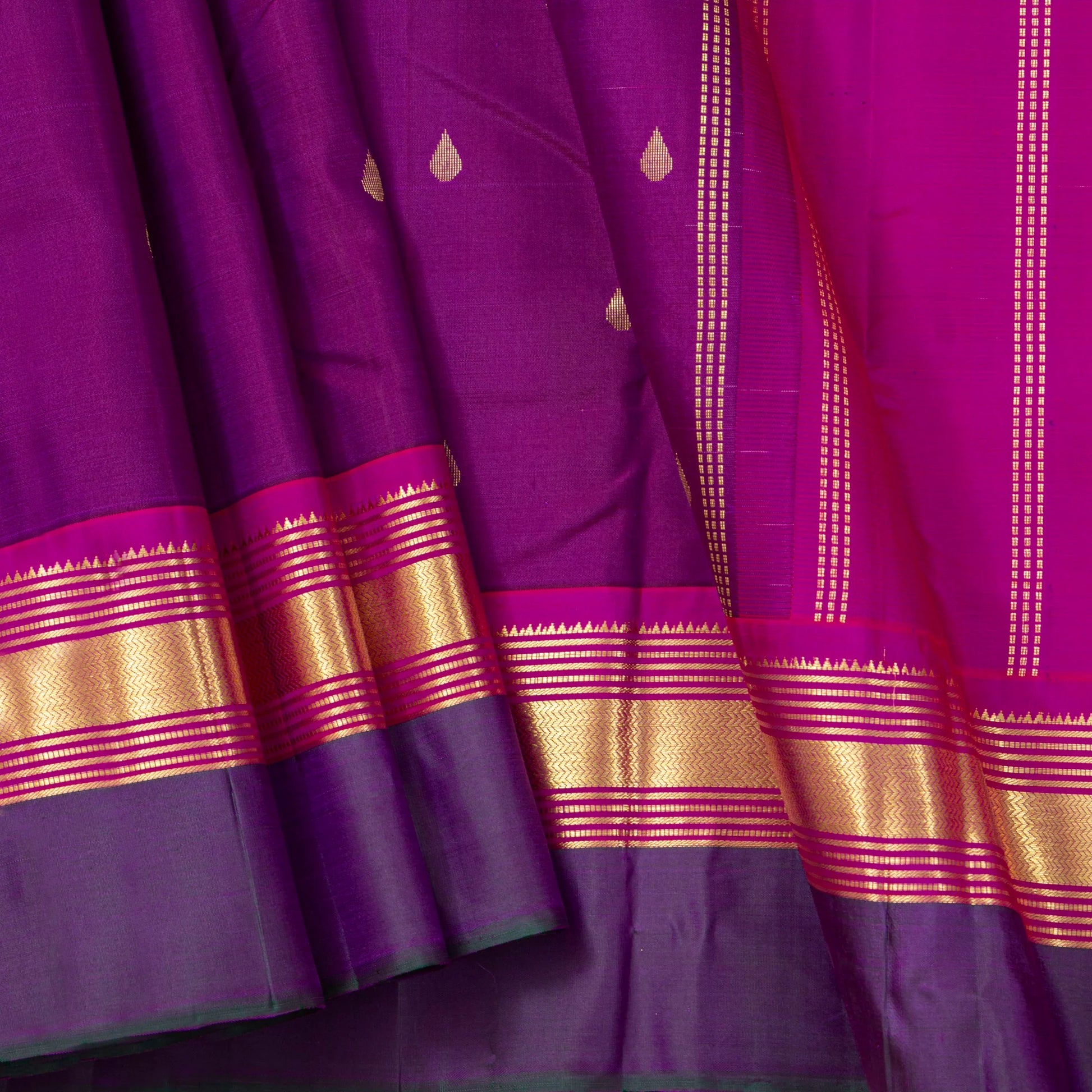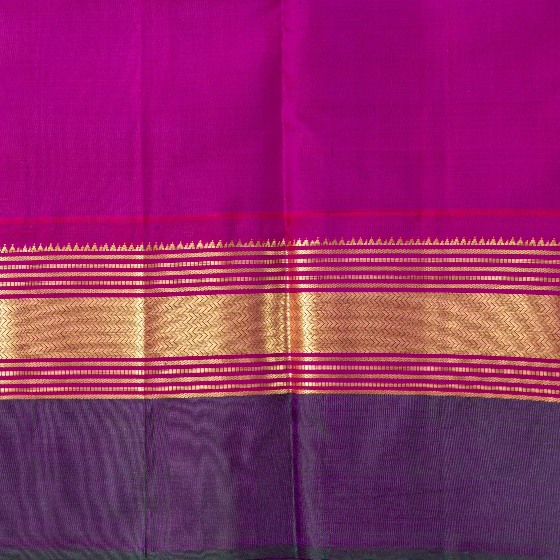 A magenta kanchipuram silk saree handwoven in pure silk and pure zari . The body is in magenta with floral motifs in gold zari. The violet shot with magenta border has a gold zari band. The magenta pallu has stripes and bands in gold zari. The attached blouse in magenta has a zari band matching the saree border.