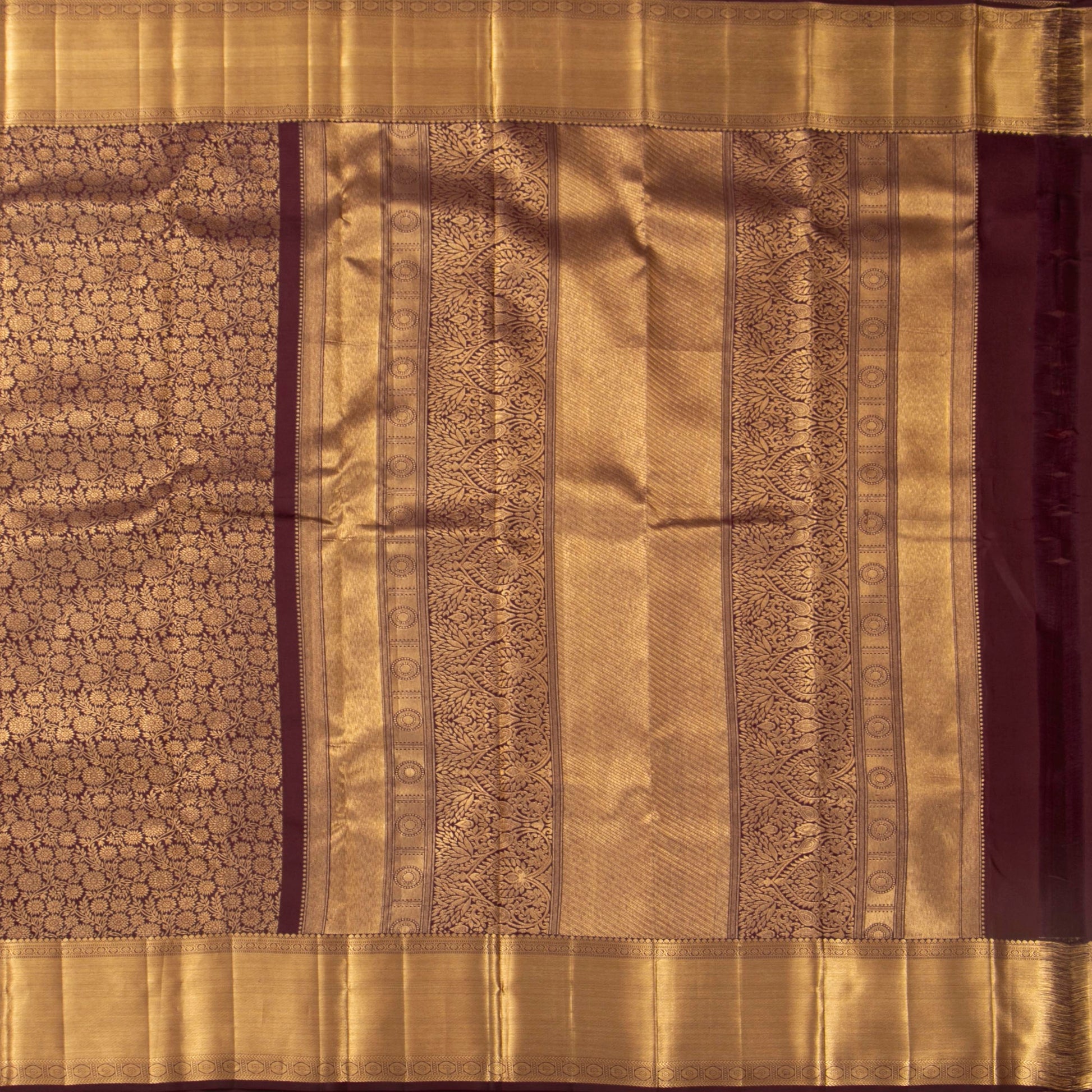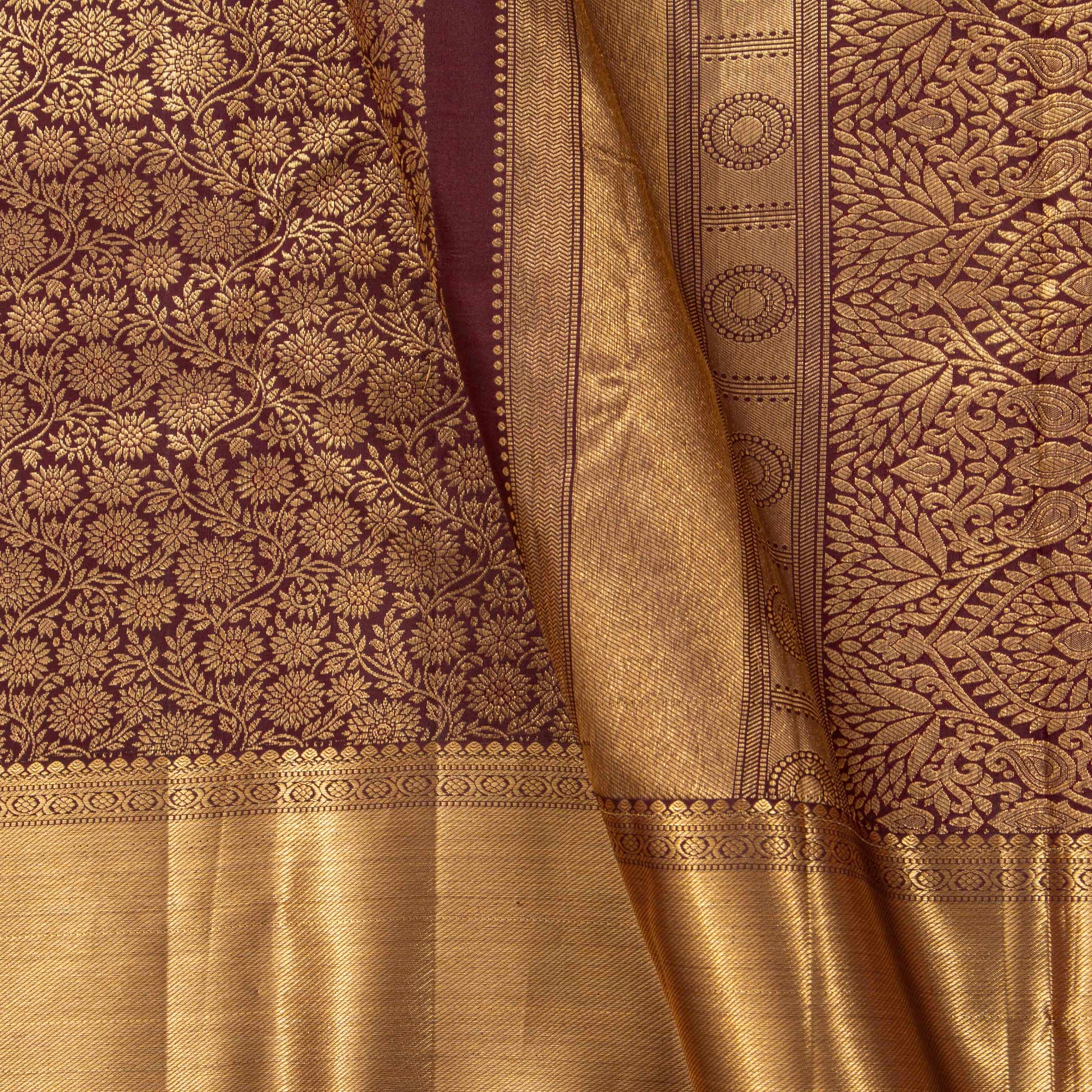 Maroon kanchipuram silk saree handwoven in pure silk. The body is in maroon with floral motifs in gold zari. The border has floral and banarasi pettu in gold zari. The pallu has floral pettu and diagonal stripes in gold zari. The attached blouse is in maroon with an armband matching the saree border.