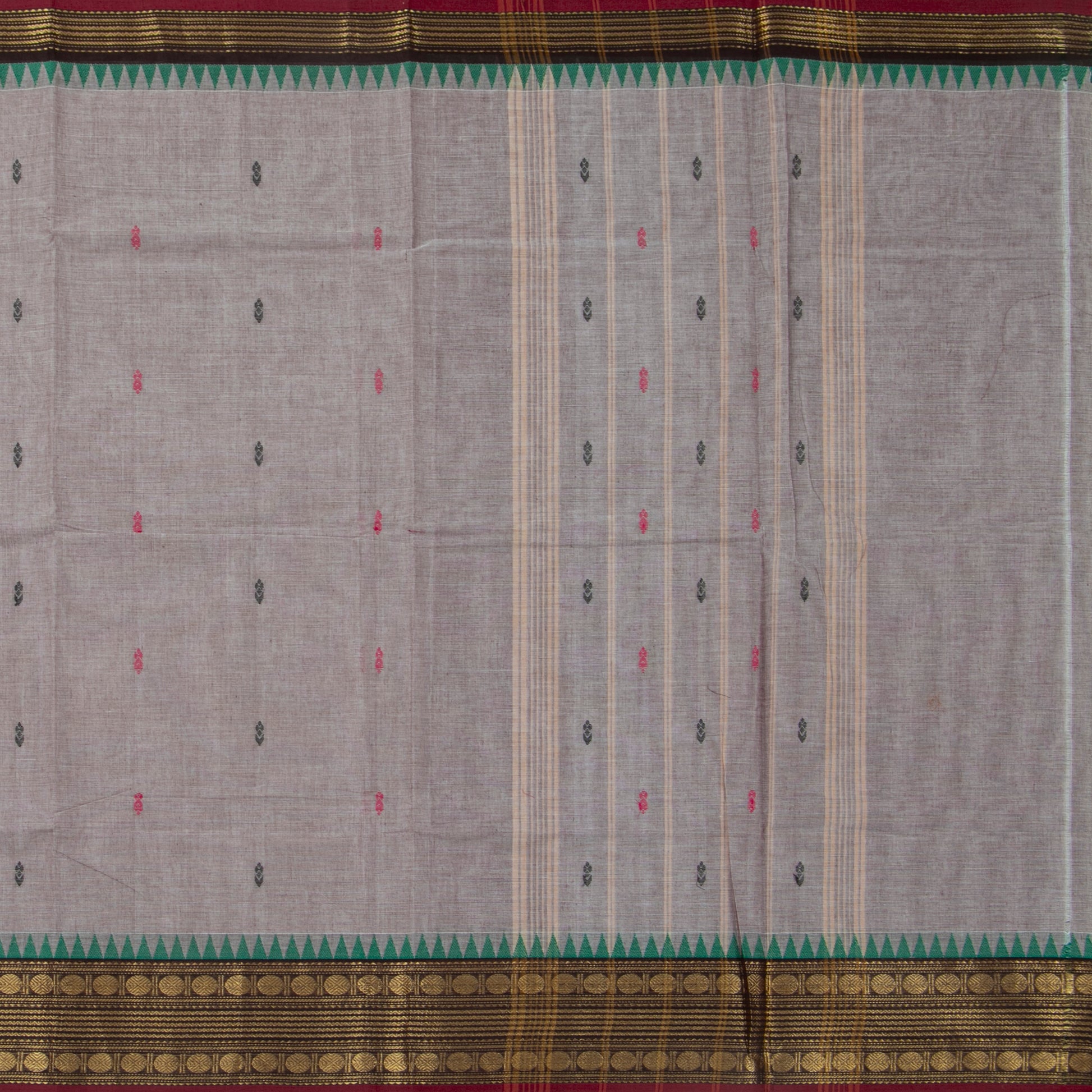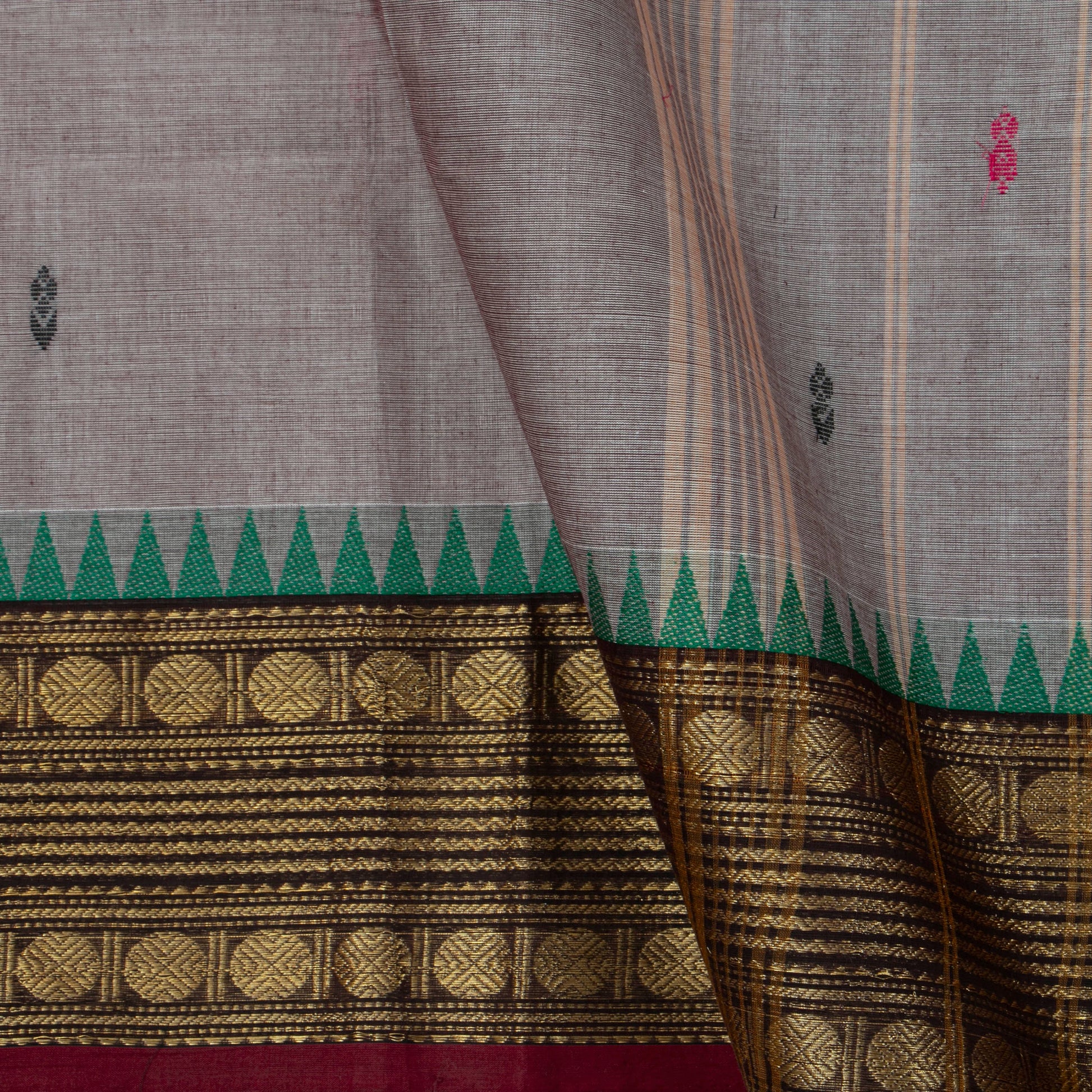 Mauve kanchi cotton saree with maroon borders on both sides with rich gold zari work and an attached blouse.